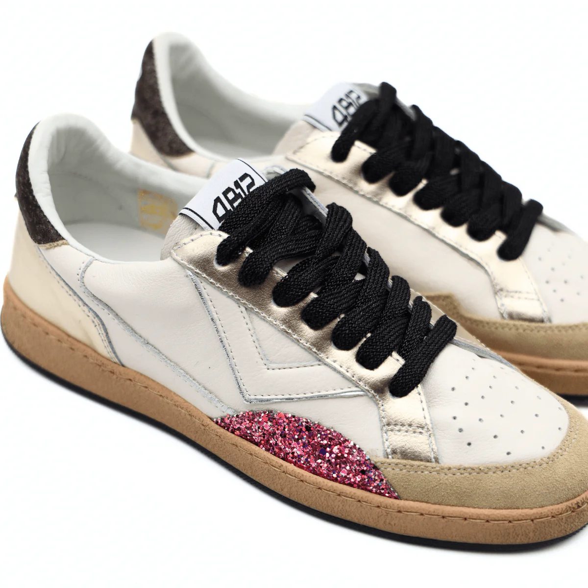 Sneakers di 4B12, realizzate in pelle bianca di alta qualità, con inserti di pelle laminata e glitter rosa. L’interno è foderato in pelle e tessuto, mentre la soletta in pelle è estraibile.