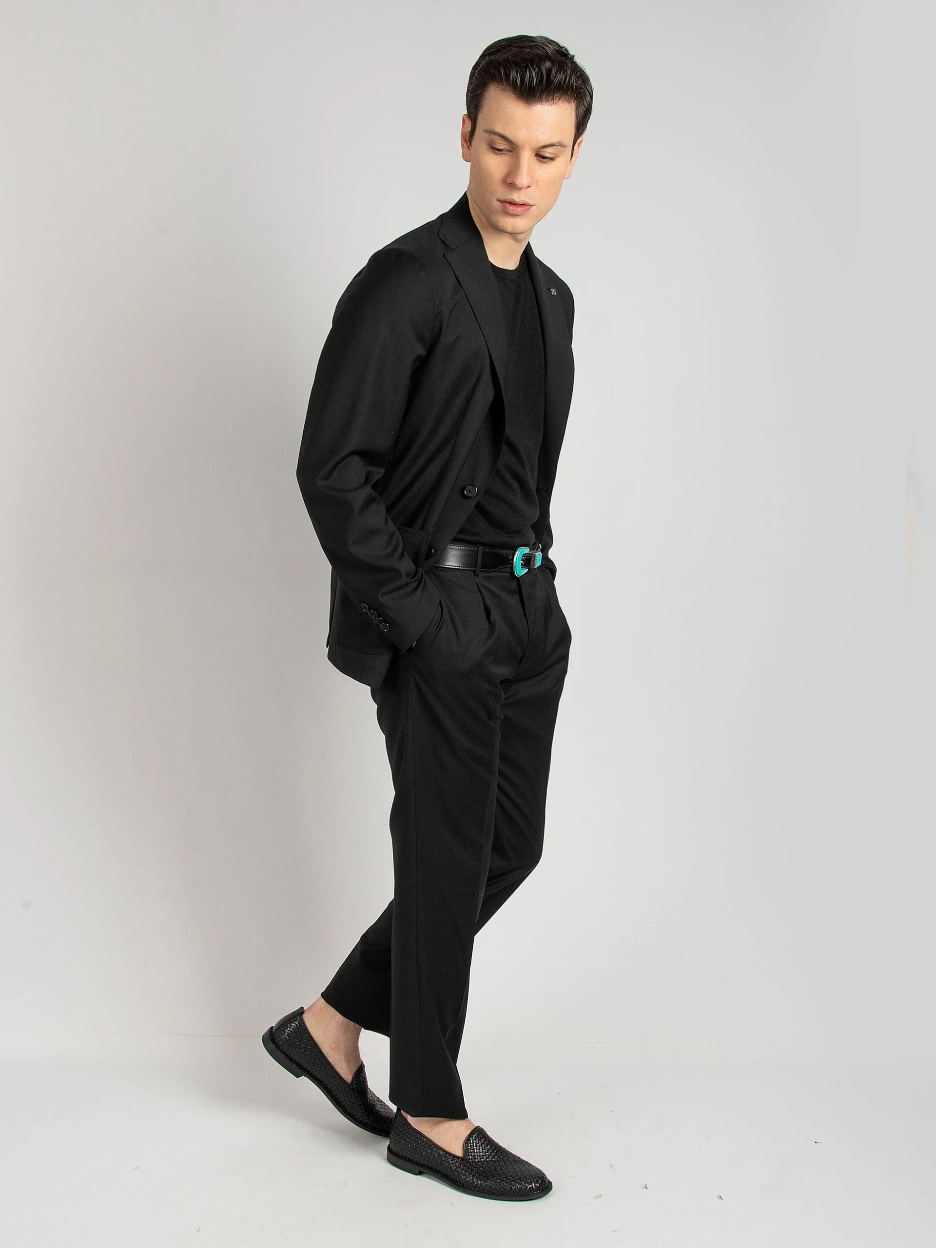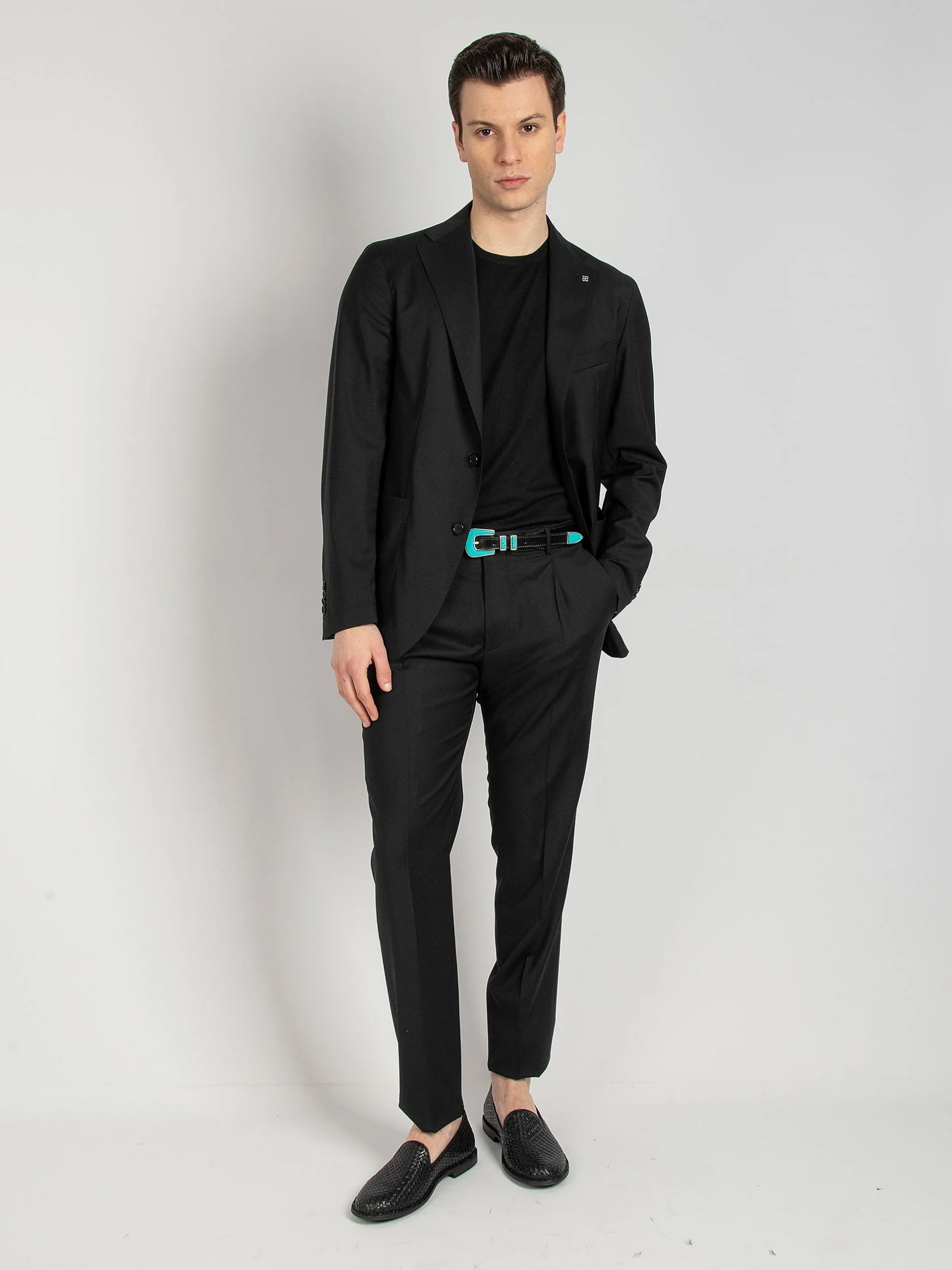 - Pantalone sartoriale con una pence e allacciatura a tre bottoni e zip.