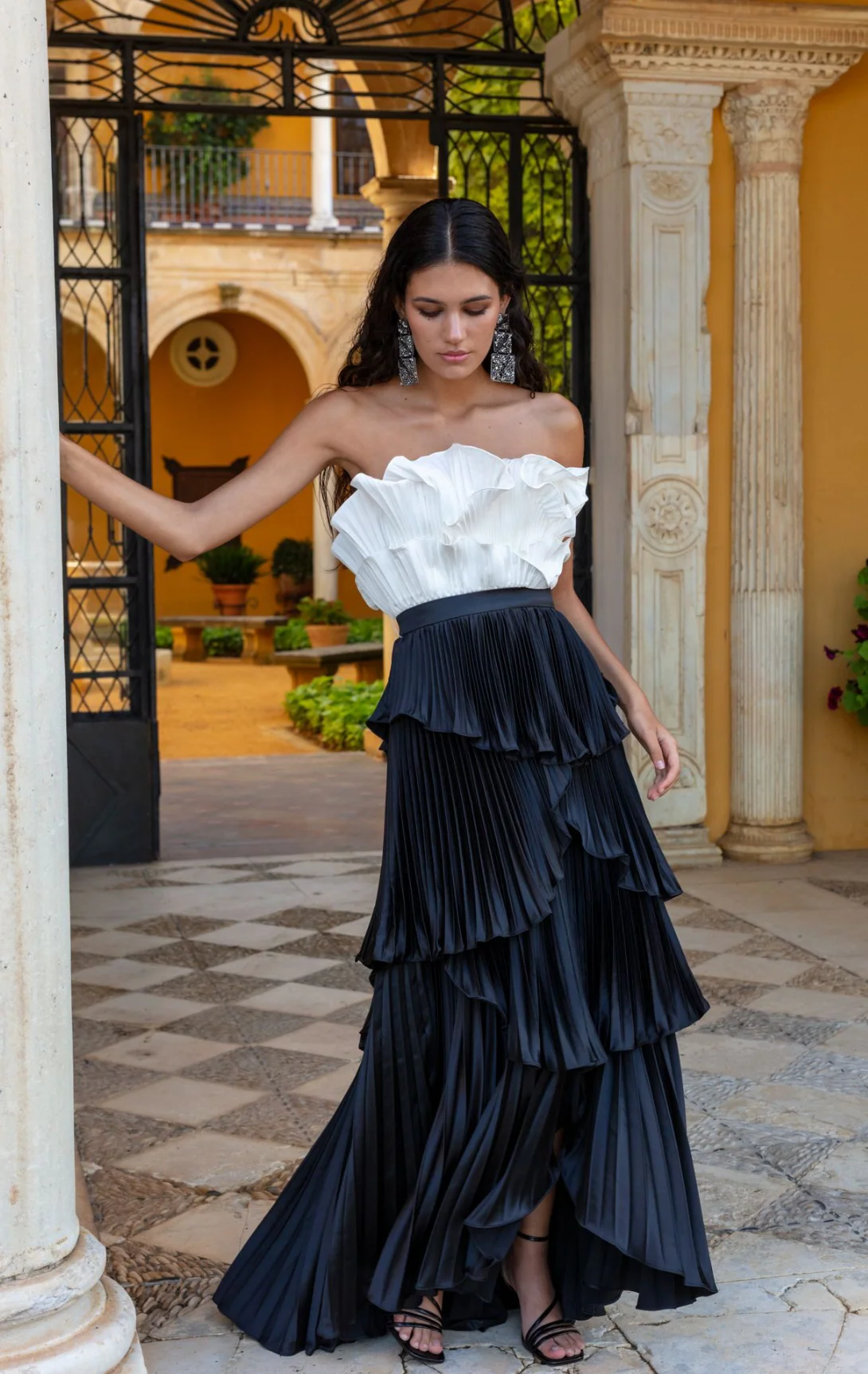 Abito lungo plissettato bicolore con volant Il corpo a corsetto, senza spalline, รจ decorato con volant pieghettati color avorio che incorniciano la scollatura La gonna, con una lunghezza asimmetrica, รจ composta da strati di volant in raso pieghettato nero