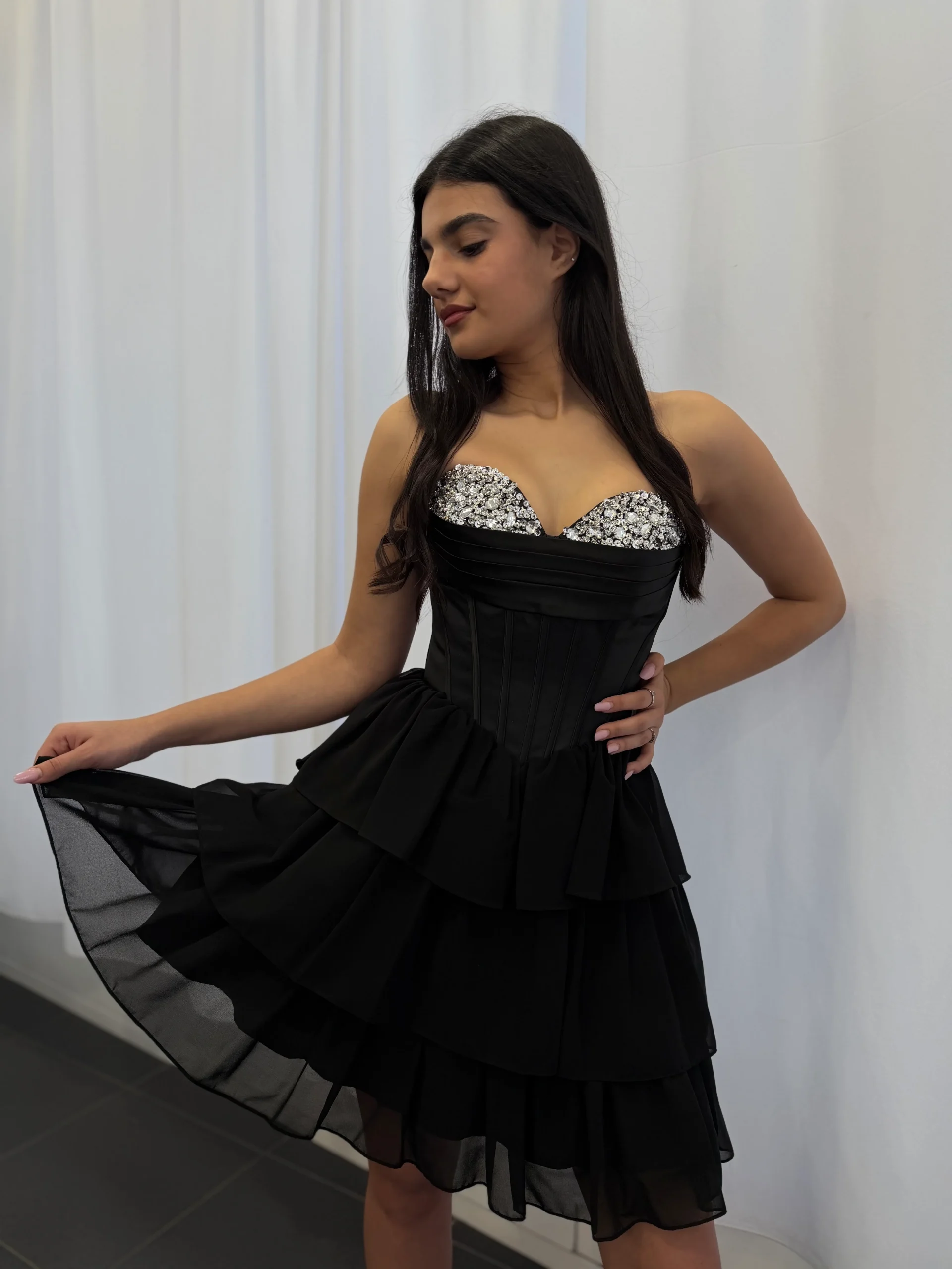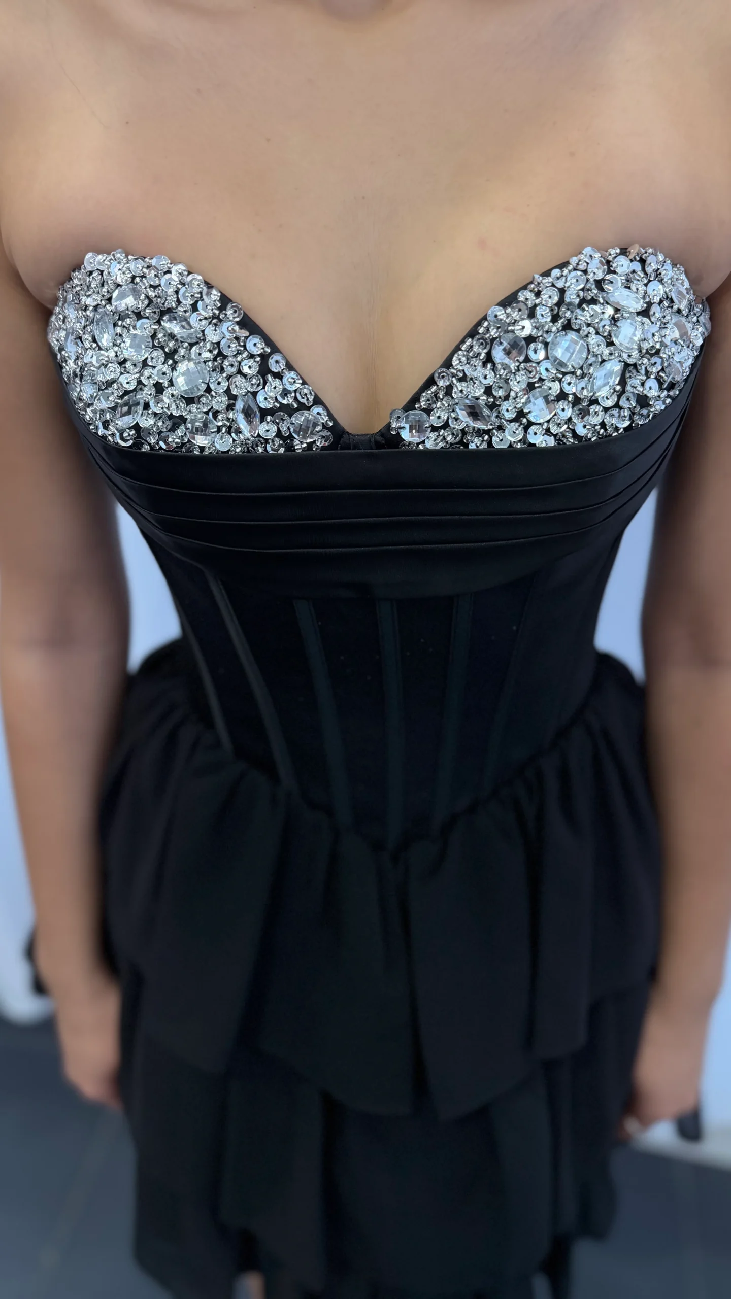 Abito corto, con scollo a cuore decorato da micro-cristalli e svarovski