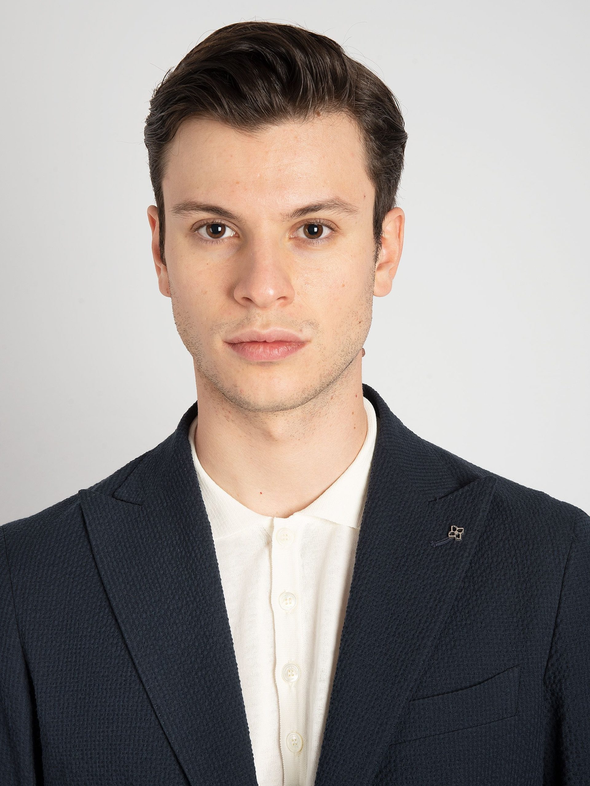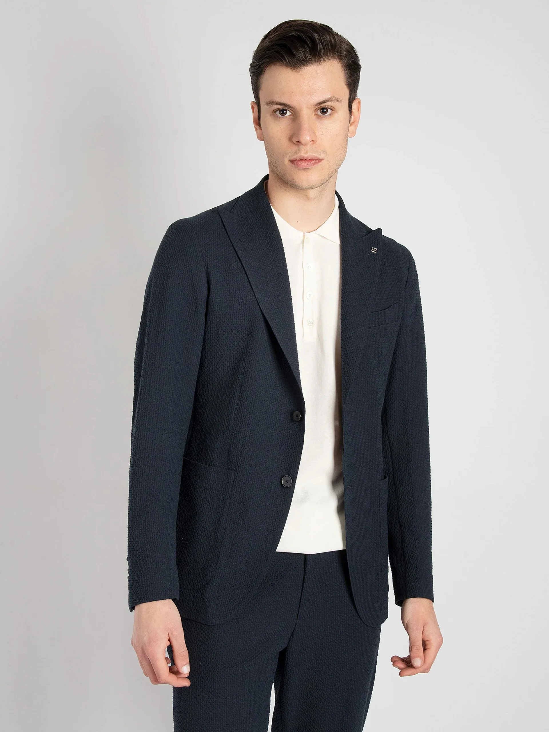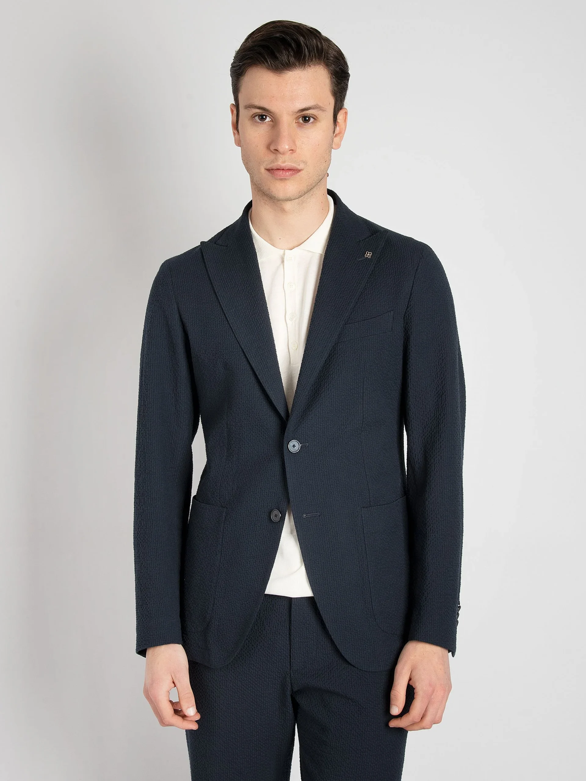 - Giacca monopetto due bottoni con rever lancia lunga.