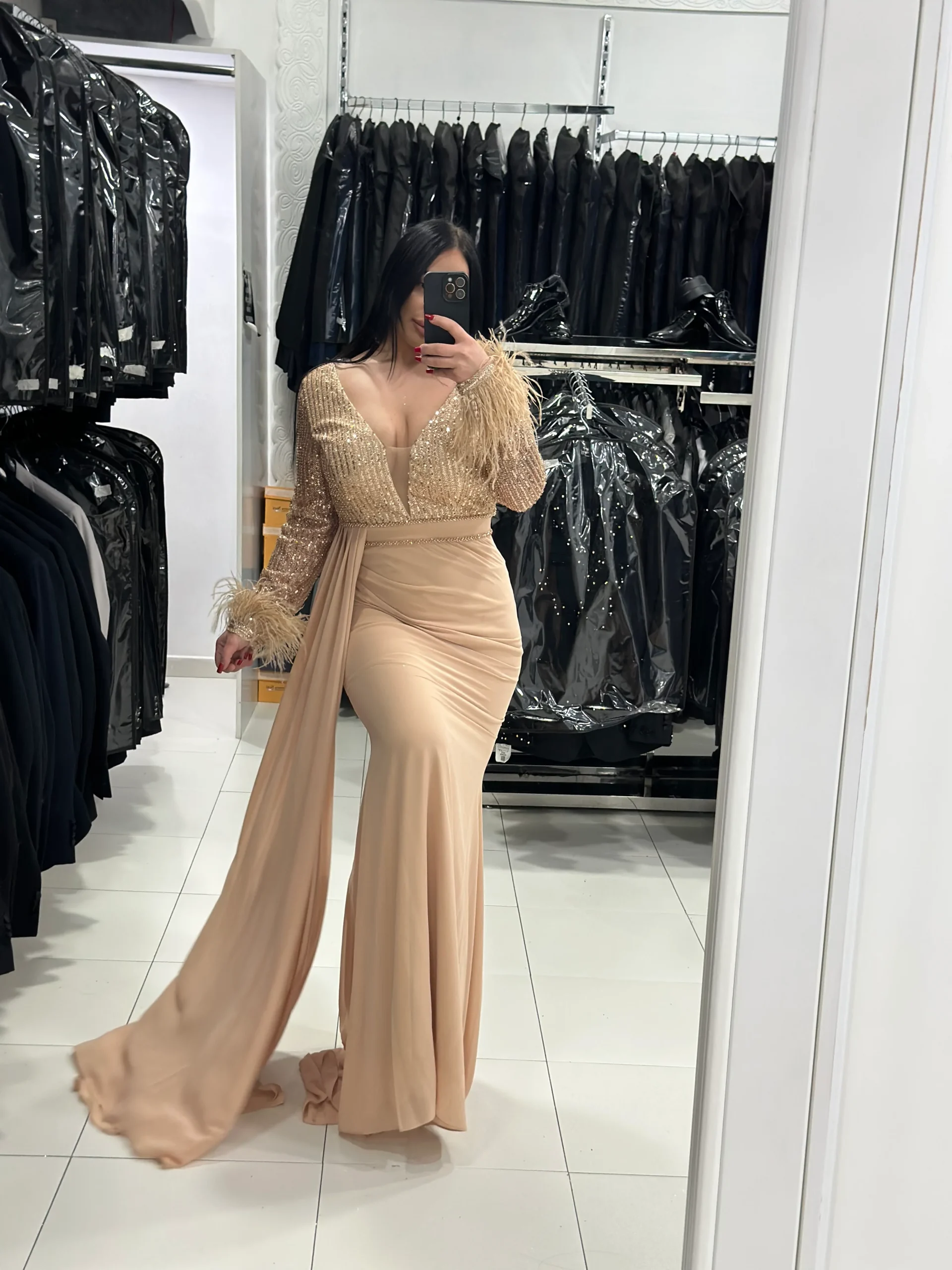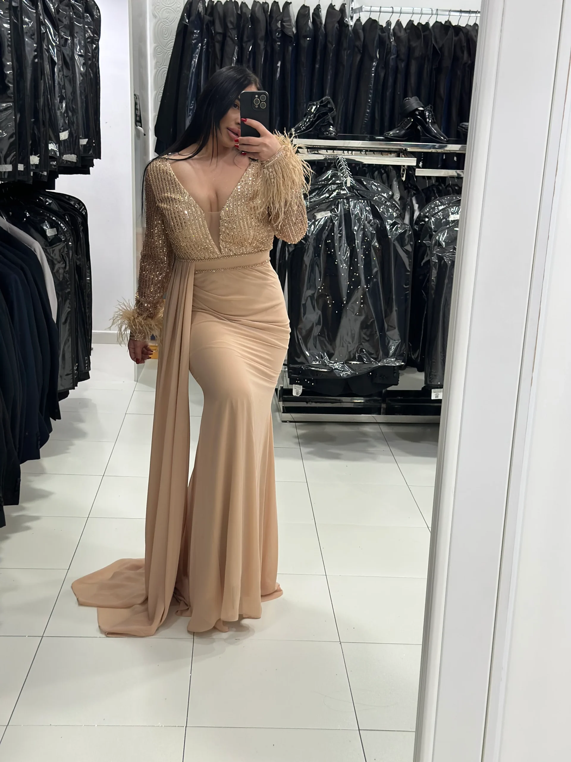 Abito lungo con piume sulle maniche, corpetto in cristallini, stretto a sirena sotto ottima vestibilitร