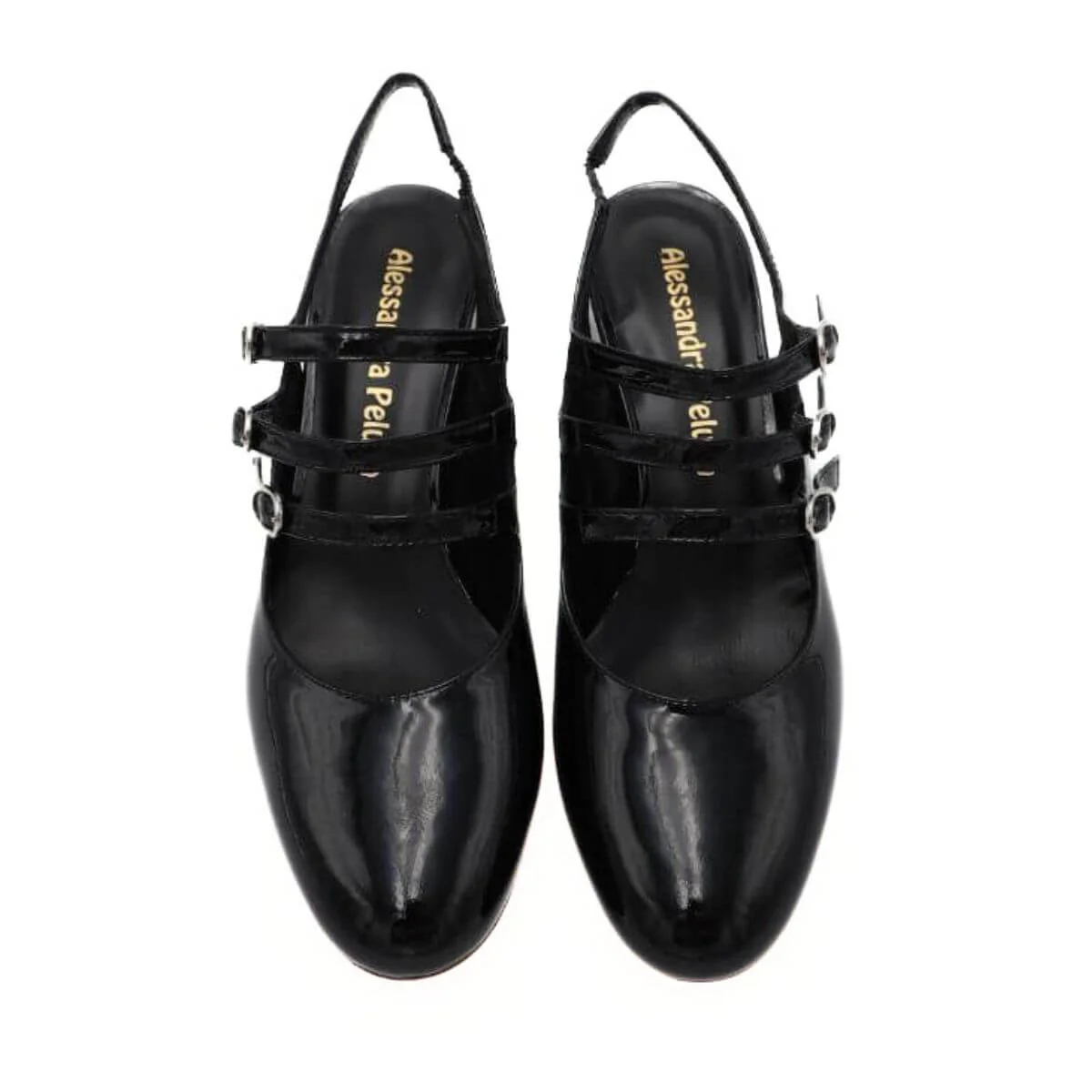 Slingback, modello Mary Jane, di ALESSANDRA PELUSO. Esternamente in pelle verniciata nera, rivestito anche nel tacco, decorato con tre cinturini frontali. Chiusura con cinturino elasticizzato. Internamente, e nel morbido sottopiede, foderato in pelle. Suola in cuoio e tacco largo di 5,5 cm. MADE IN ITALY