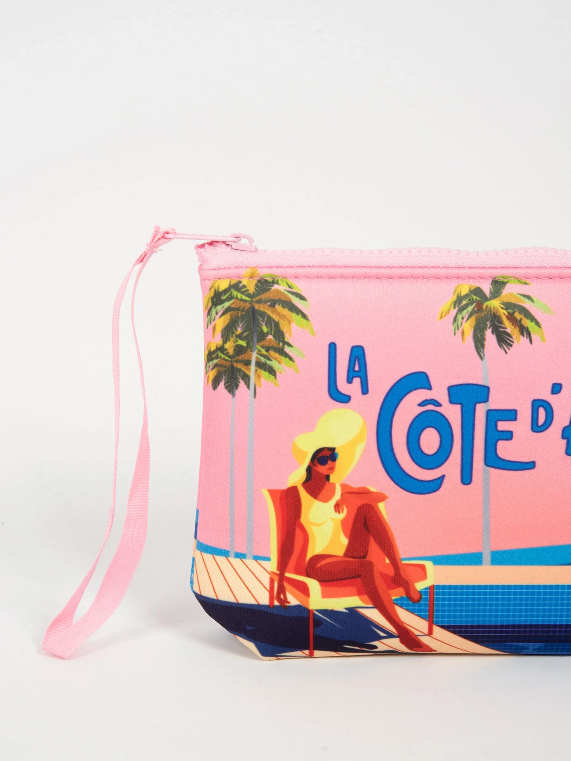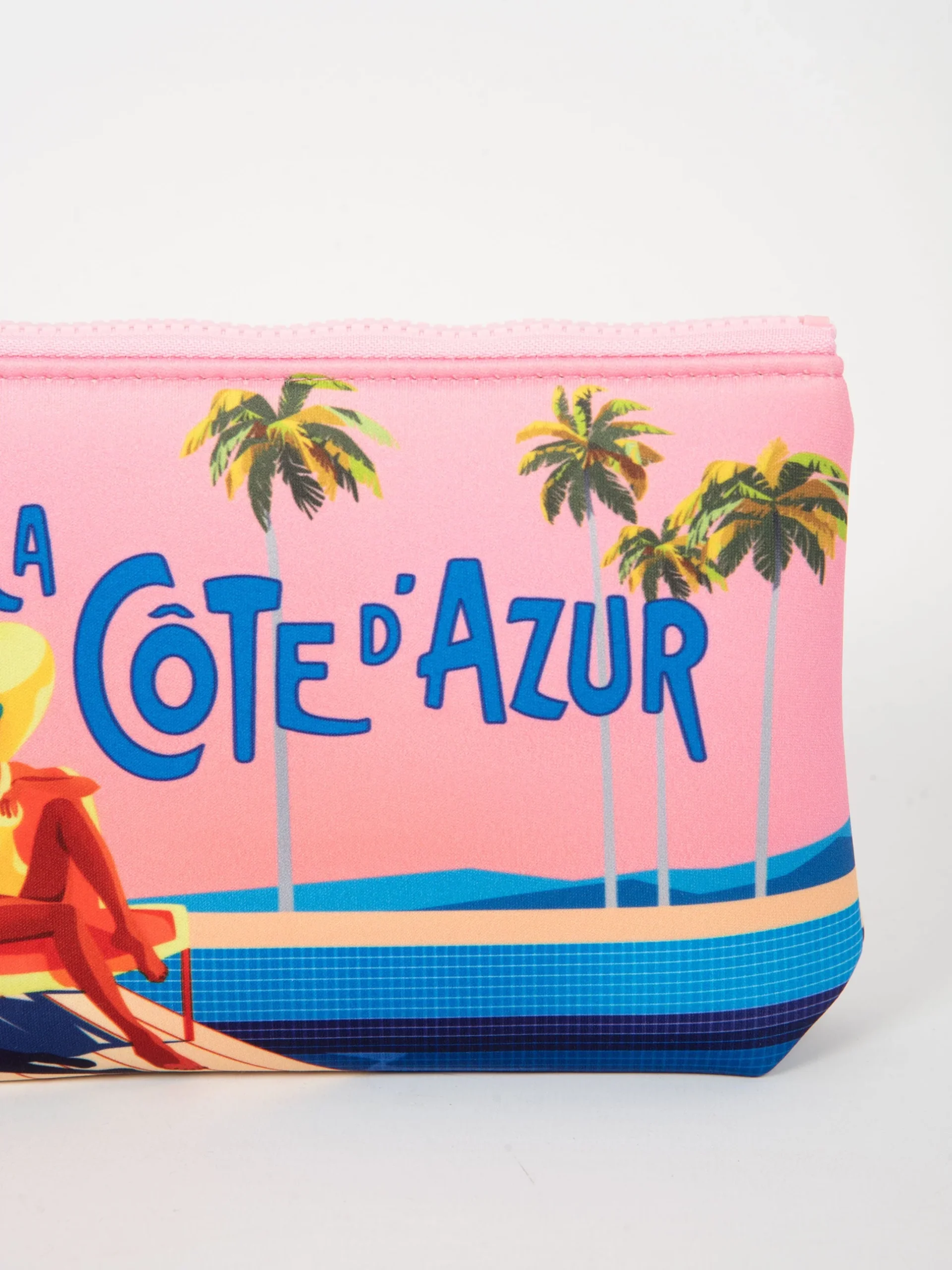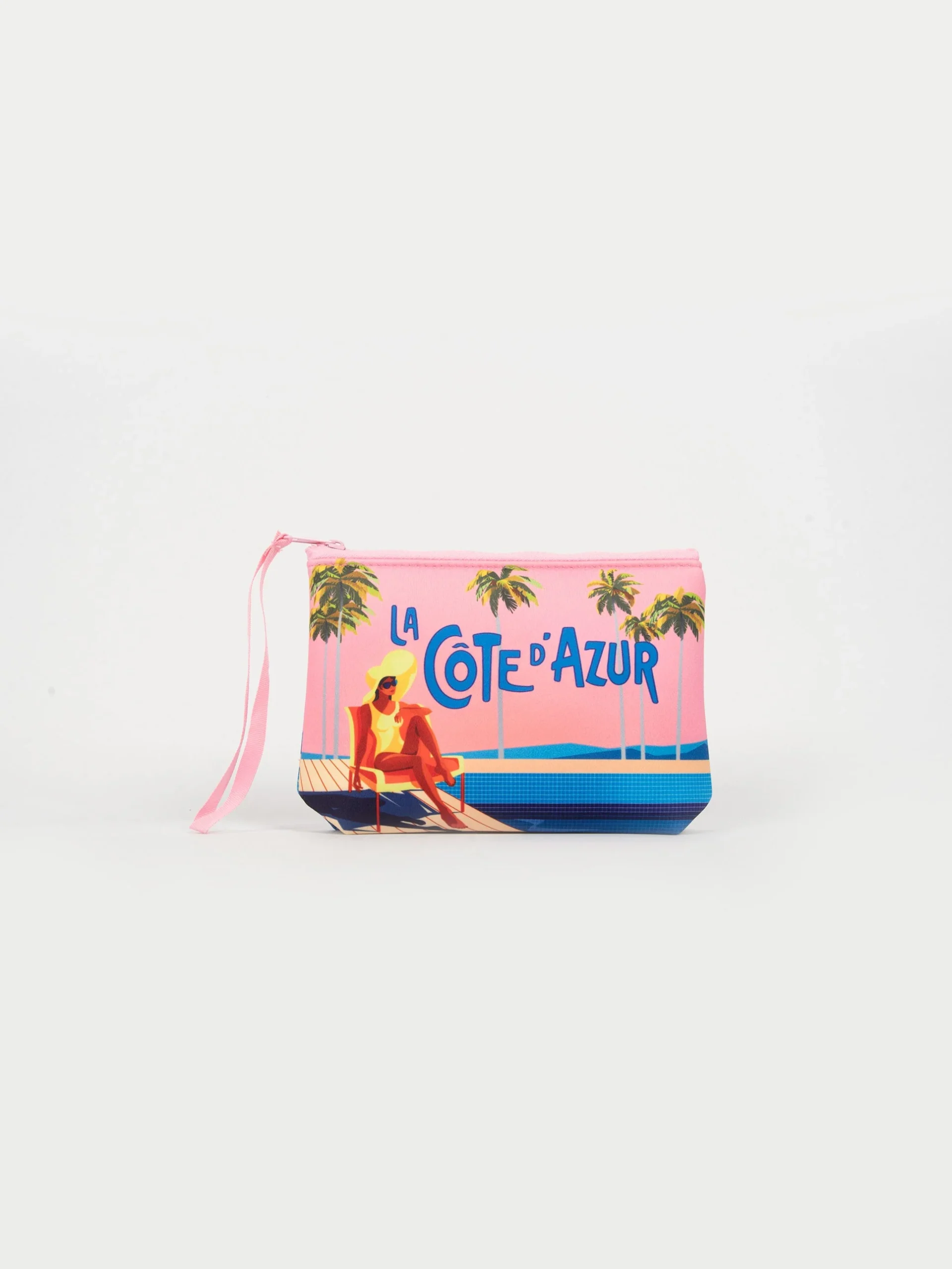 Mod: ALINE AZUR POSTCARD 21 Pochette in neoprene. Chiusura con zip. Fantasia cartolina Costa Azzurra. Laccetto per tenerla al polso. Misure 16 x 22 cm.