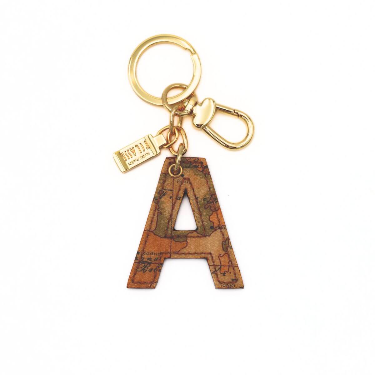 Portachiavi da donna, lettera A, tessuto stampato Geo Classic e pelle. Occhiello e moschettone dorati. Cuciture in tono. ATTENZIONE: la stampa della cartina del prodotto potrebbe essere differente.