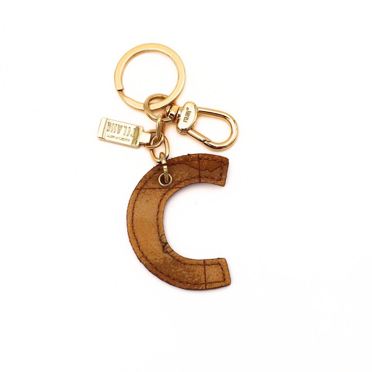 Portachiavi da donna, lettera C, tessuto stampato Geo Classic e pelle. Occhiello e moschettone dorati. Cuciture in tono.