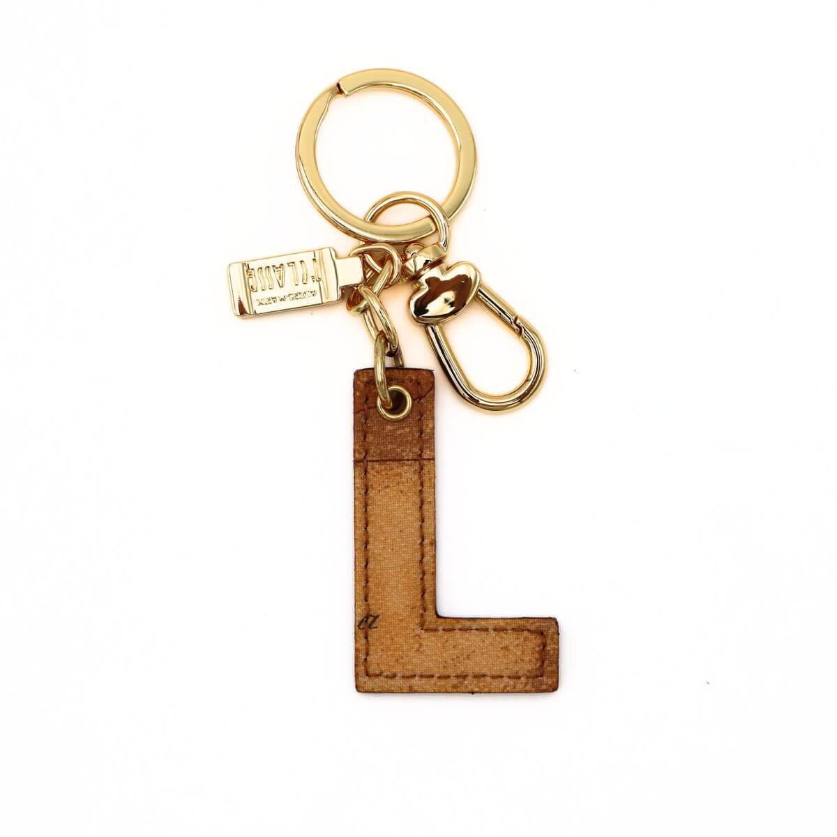 Portachiavi da donna, lettera L, tessuto stampato Geo Classic e pelle. Occhiello e moschettone dorati. Cuciture in tono.