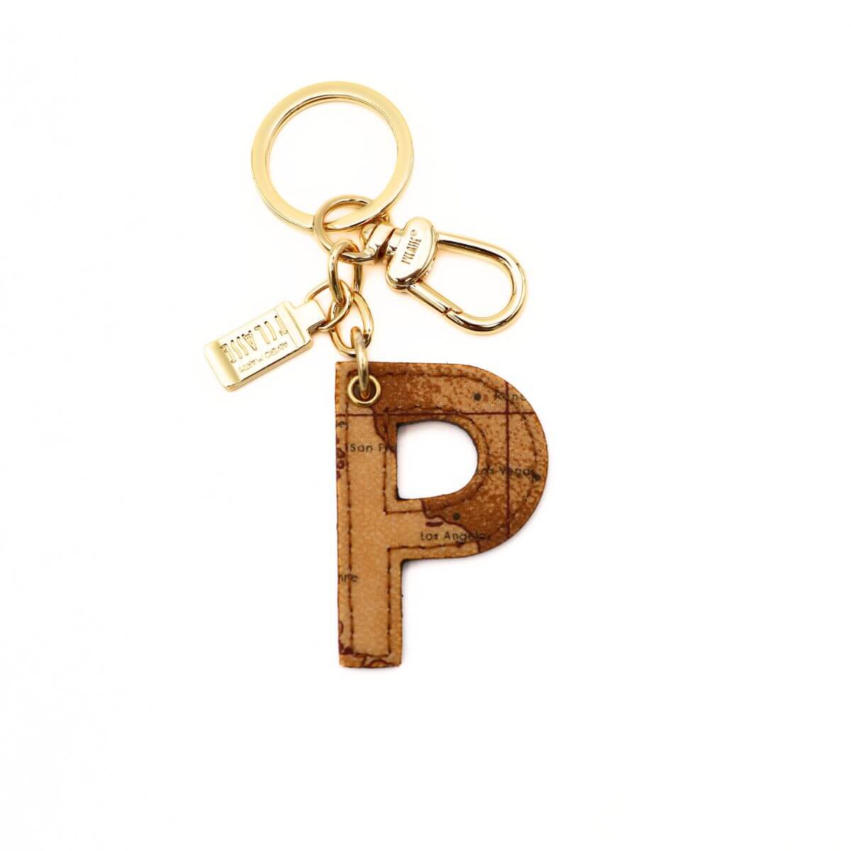 Portachiavi da donna, lettera P, tessuto stampato Geo Classic e pelle. Occhiello e moschettone dorati. Cuciture in tono. ATTENZIONE: la stampa della cartina del prodotto potrebbe essere differente.