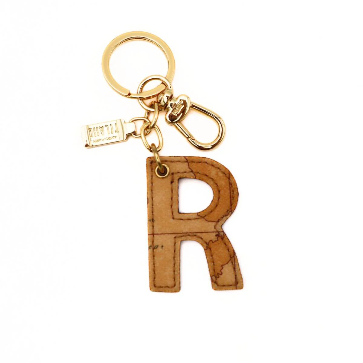 Portachiavi da donna, lettera R, tessuto stampato Geo Classic e pelle. Occhiello e moschettone dorati. Cuciture in tono. ATTENZIONE: la stampa della cartina del prodotto potrebbe essere differente.