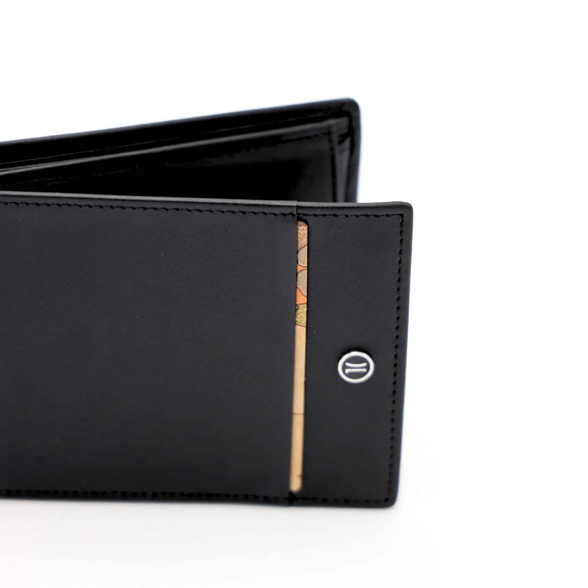 Portafogli uomo di ALVIERO MARTINI 1^ CLASSE, in pelle nera con mini inserto in tessuto stampato con cartina geografica Geo Classic e logo, con sezioni per banconote e carte di credito e tasca interna portamonete. Raffinato contemporaneo, piacerà per la sua capienza nonostante le piccole dimensioni. Particolare il dettaglio del logo 1AClasse impresso a caldo.
