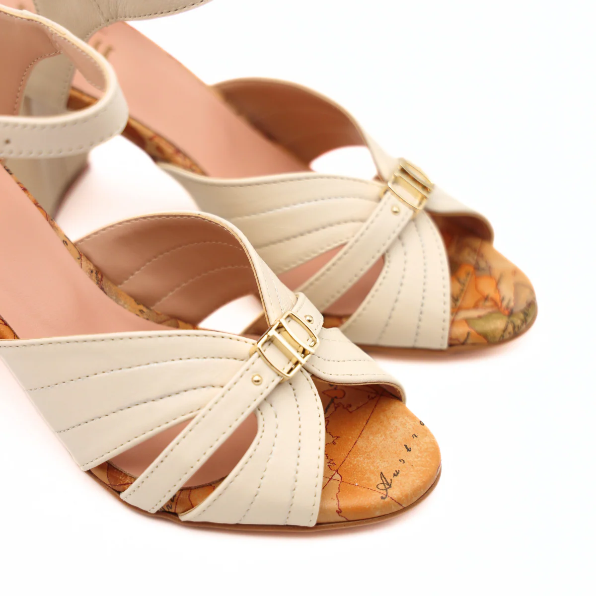 Sandalo da donna di Alviero Martini 1^ Classe. Realizzato in pelle beige con logo oro. Interno foderato in pelle. Chiusura con cinturino regolabile alla caviglia. Suola in gomma (altezza tacco. 8cm). MADE IN ITALY