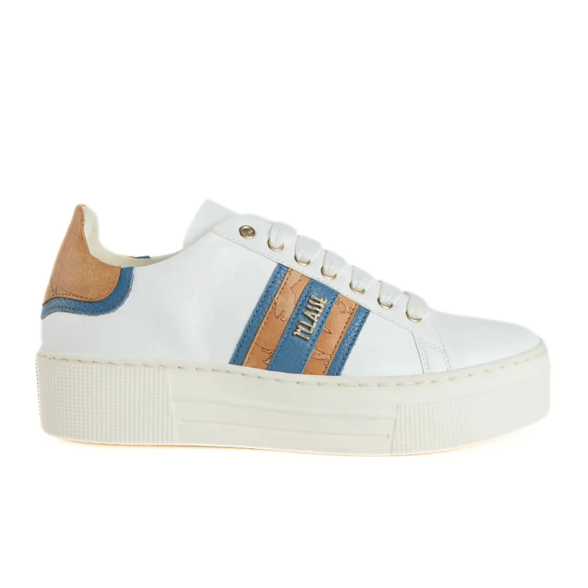 Le sneaker in pelle liscia di ALVIERO MARTINI 1^CLASSE sono il modello passe-partout ideale per la primavera. Impreziosite dal dettaglio in stampa Geo Classic sul tallone e dal inserto azzurro e geo classic laterale. Suola in gomma platform (4cm).