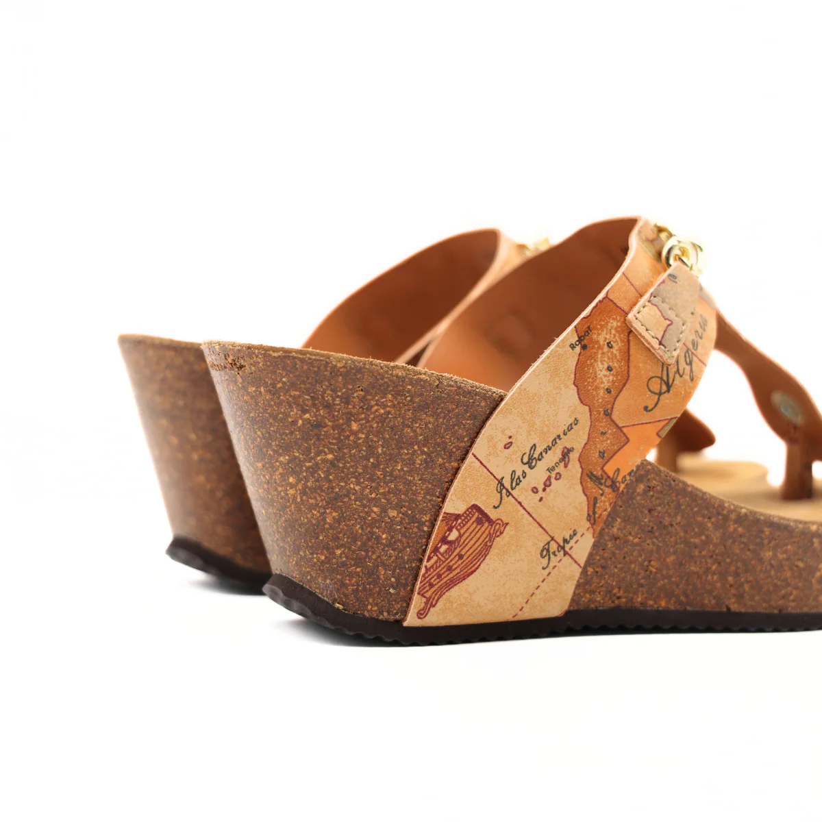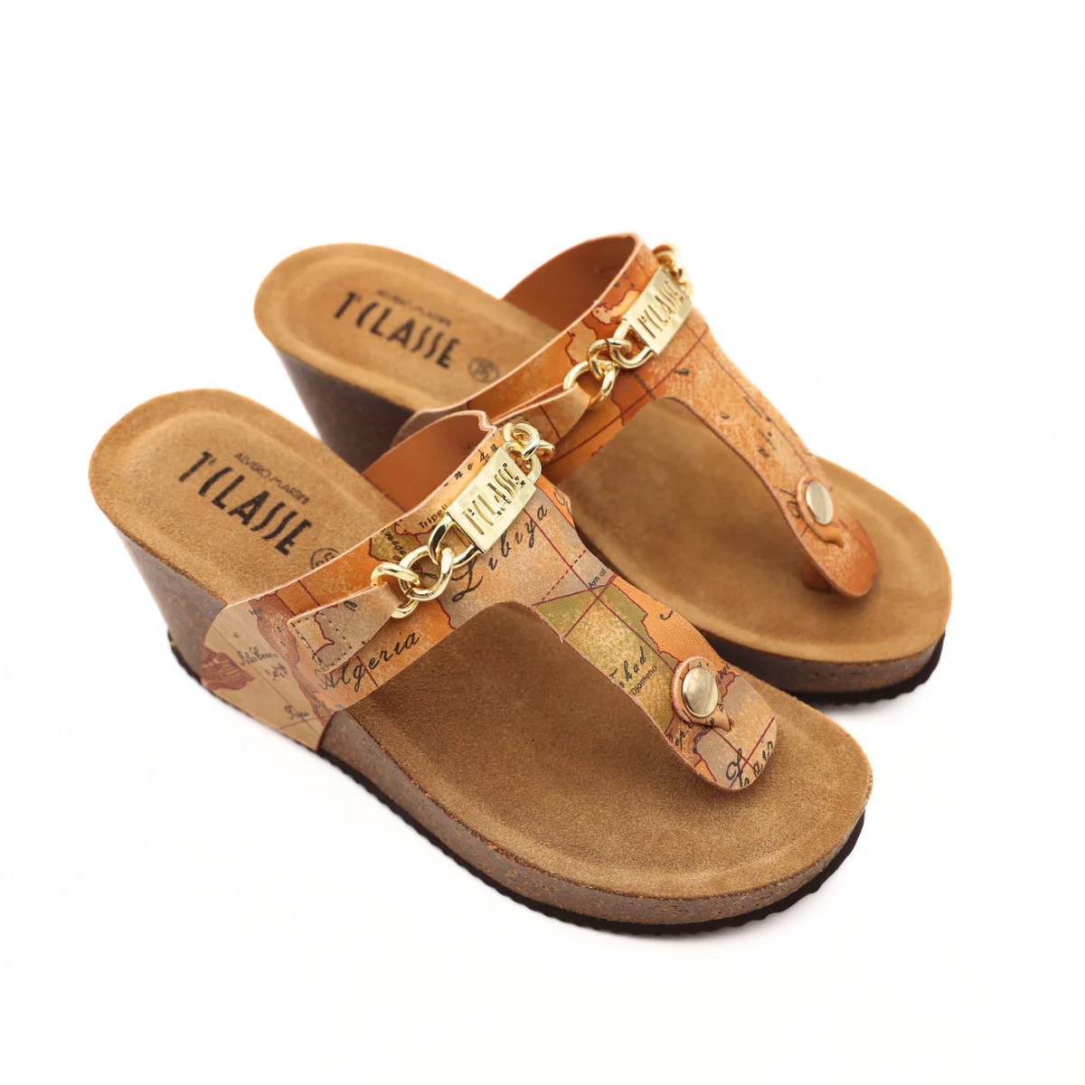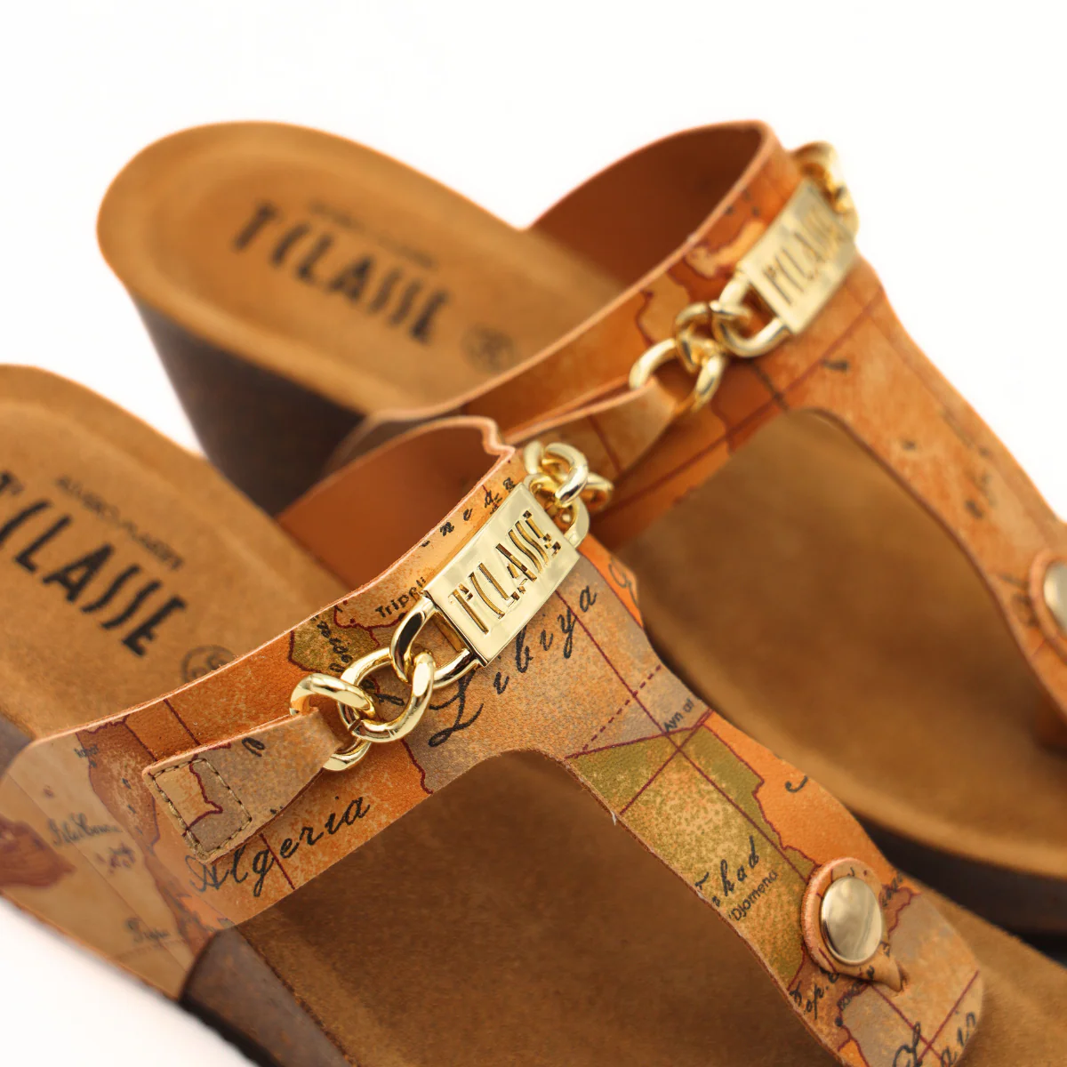 Ciabatta da donna di Alviero Martini 1^ Classe. Realizzato in similpelle con stampa Geo Classic e con logo e accessorio oro. Interno foderato in pelle. Suola in gomma (altezza zeppa: 6cm).