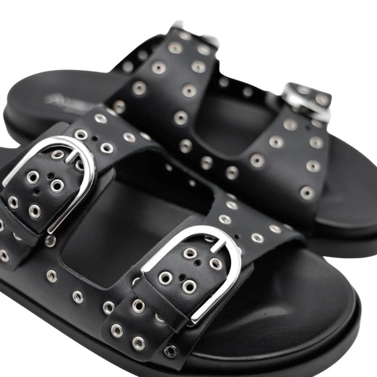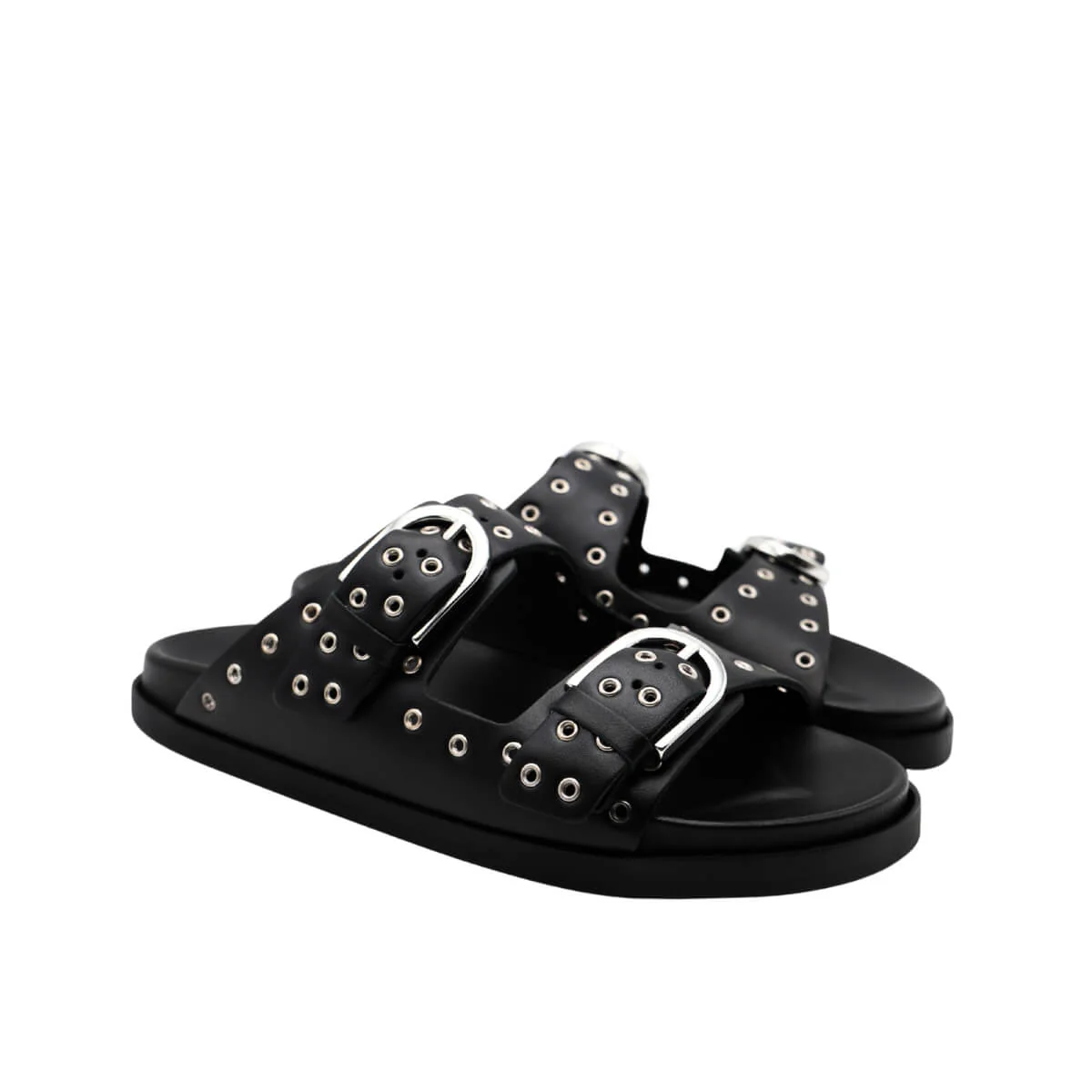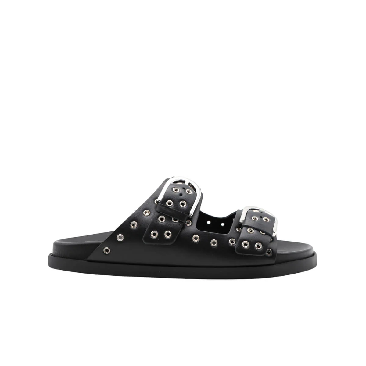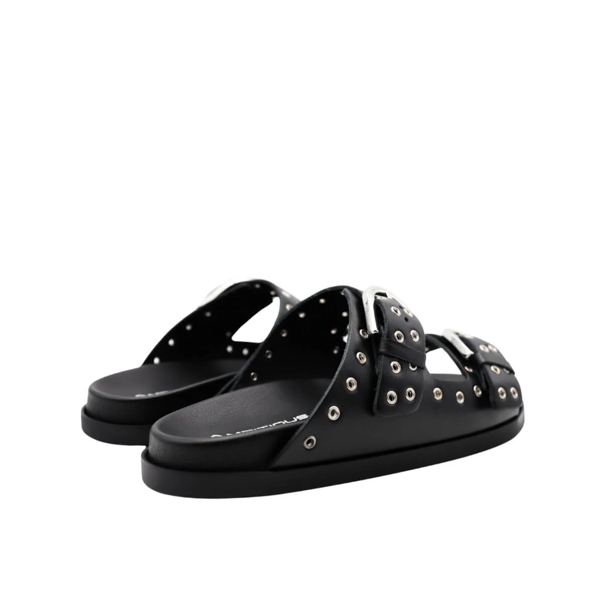 Le due fibbie regolabili in metallo argentato aggiungono un tocco contemporaneo e permettono di personalizzare la calzata con semplicità. Il contrasto tra il nero della pelle e il dettaglio metallico dona carattere senza risultare eccessivo.