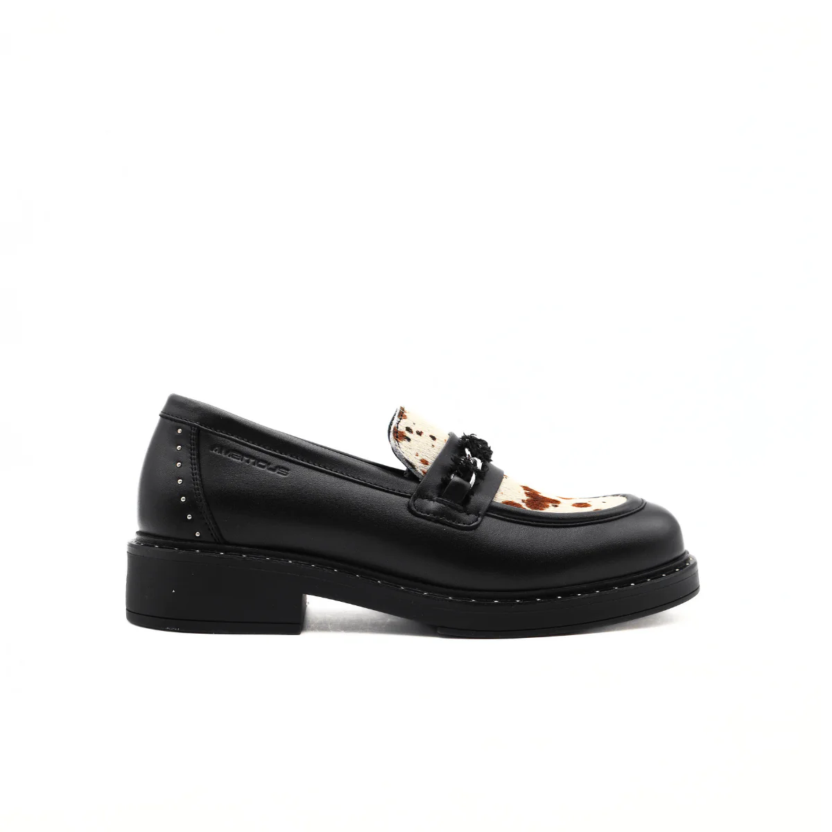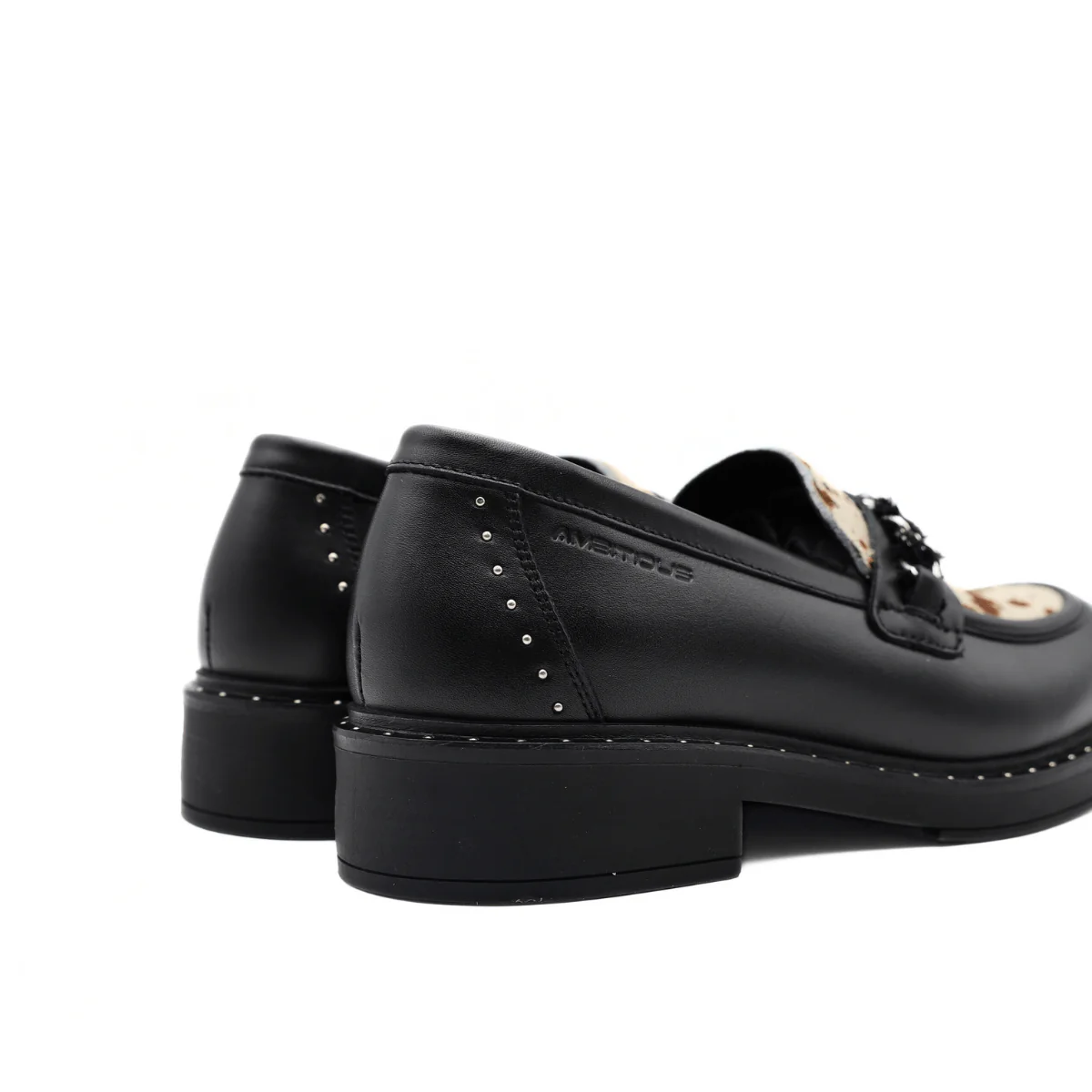 Mocassino di AMBITIOUS modello college realizzato in morbida pelle con inserto effetto cavallino animalier. Arricchito da mascherina con catena argentata e fascia in tessuto, presenta delle micro-borchie sul tallone e sul guardolo. Interno foderato in pelle e morbido sottopiede estraibile. Suola in gomma.