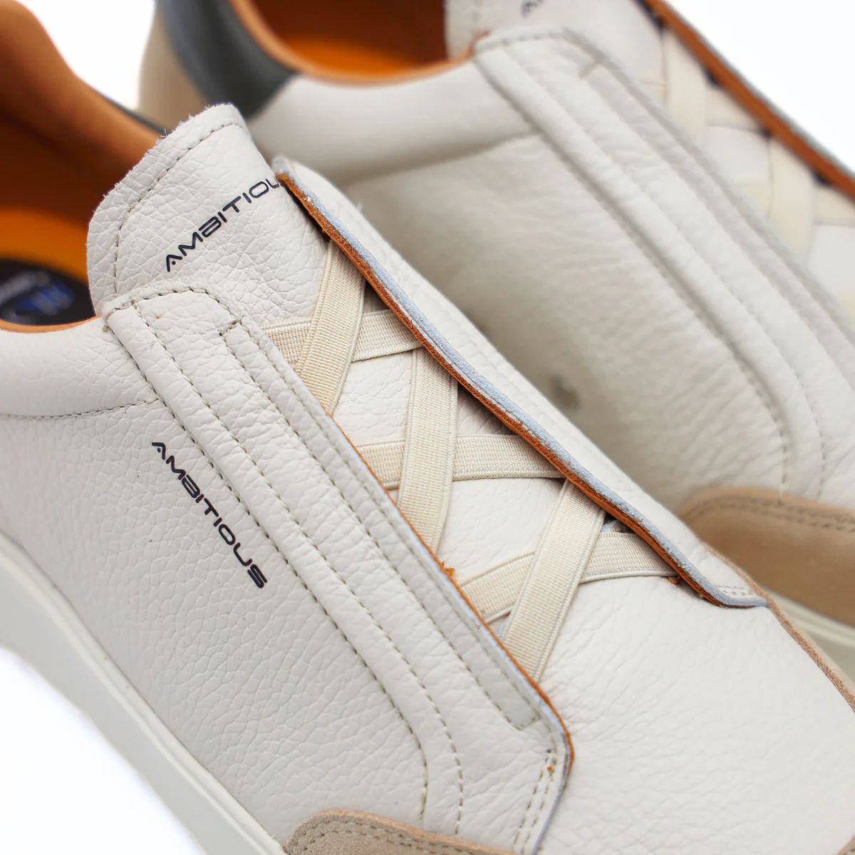 Slipon da uomo di AMBITIOUS. Tomaia realizzata in pelle bianca con dettagli in camoscio taupe, tallone con inserto in pelle verde scuro. Elastici incrociati sulla tomaia per una calzata facile e veloce. Interno foderato in pelle con sottopiede estraibile. Suola in gomma.