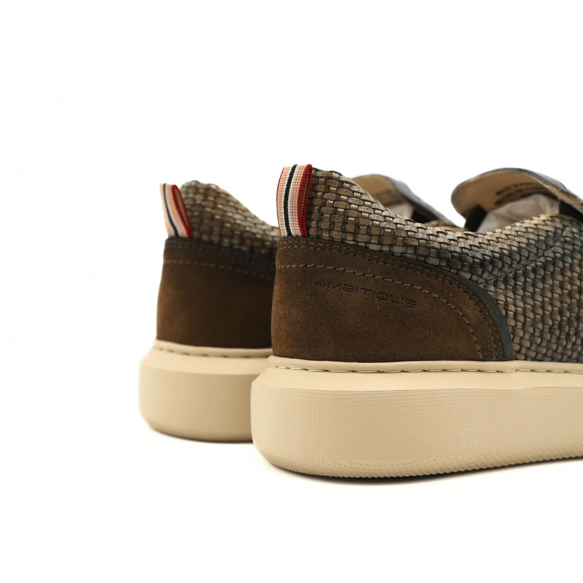Slipon da uomo di AMBITIOUS. Tomaia realizzata in pelle intrecciata verde con dettagli in camoscio. Interno foderato in pelle con sottopiede estraibile. Suola in gomma.