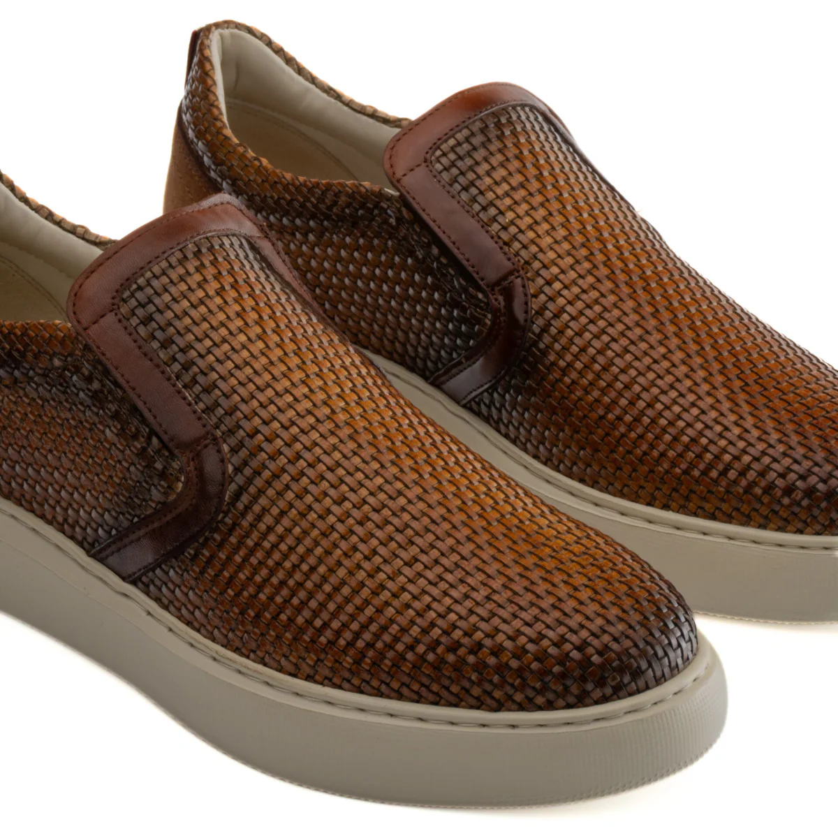 Slipon da uomo di AMBITIOUS. Tomaia realizzata in pelle intrecciata color cuoio con dettagli in camoscio. Interno foderato in pelle con sottopiede estraibile. Suola in gomma.