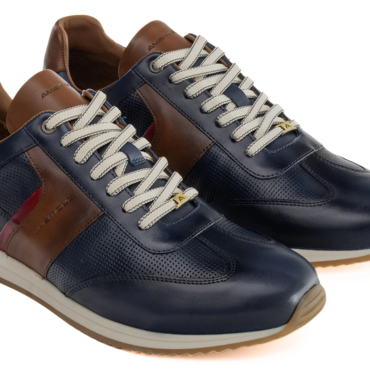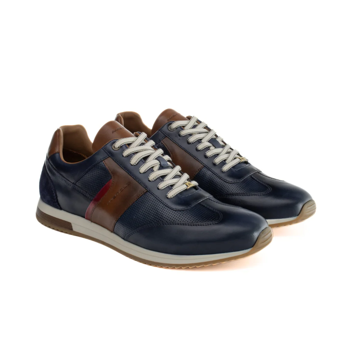 Sneaker elegante casual uomo in pelle liscia ed effetto punzonato con fascia laterale color cuoio. Internamente foderato in pelle, morbido plantare sagomato estraibile. Suola ammortizzata in gomma antiscivolo.