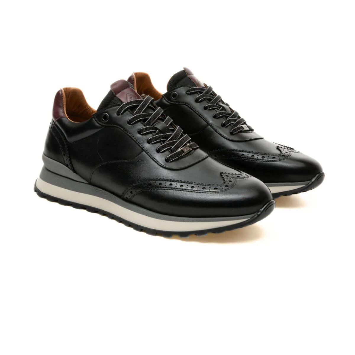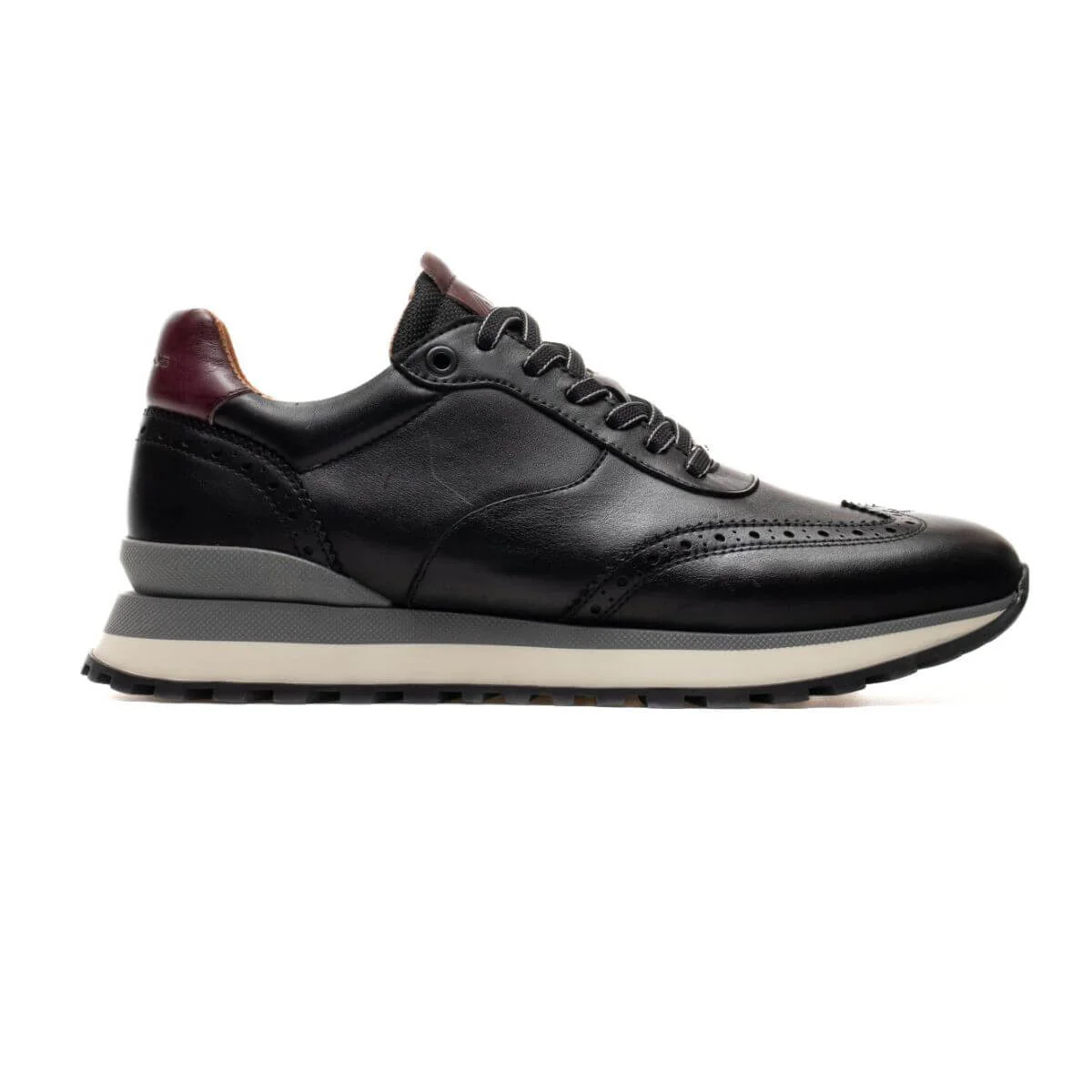 PARK è una nuova sneaker ibrida casual di AMBITIOUS, che combina una silhouette da runner sportiva con dettagli classici delle calzature come la pelle effetto patina e la francesina. Questa versione presenta dettagli traforati sulla tomaia, suola tricolore e pannello posteriore a contrasto.
