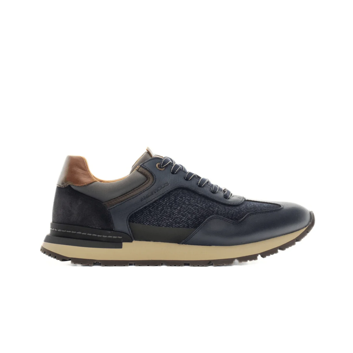 Sneakers di AMBITIOUS modello VINCE d’ispirazione classica che unisce lusso e funzionalità in un unico stile. Silhouette runner, spoiler posteriore, combinazione di pelle e tessuto con pannello laterale traforato. Morbido sottopiede estraibile e secondo laccio in dotazione.