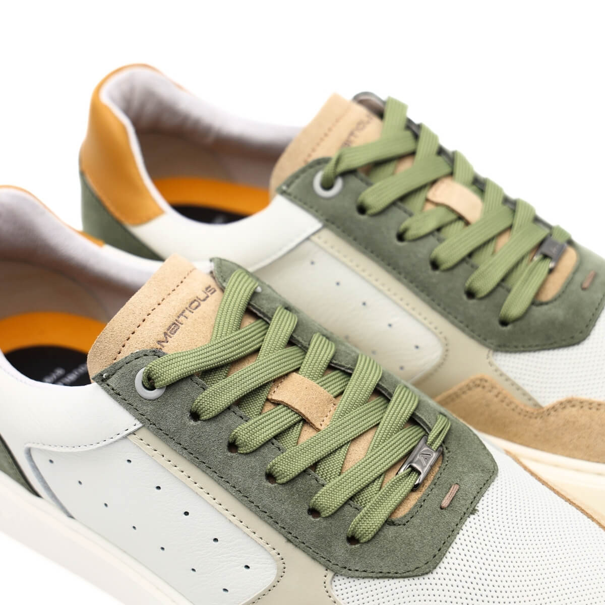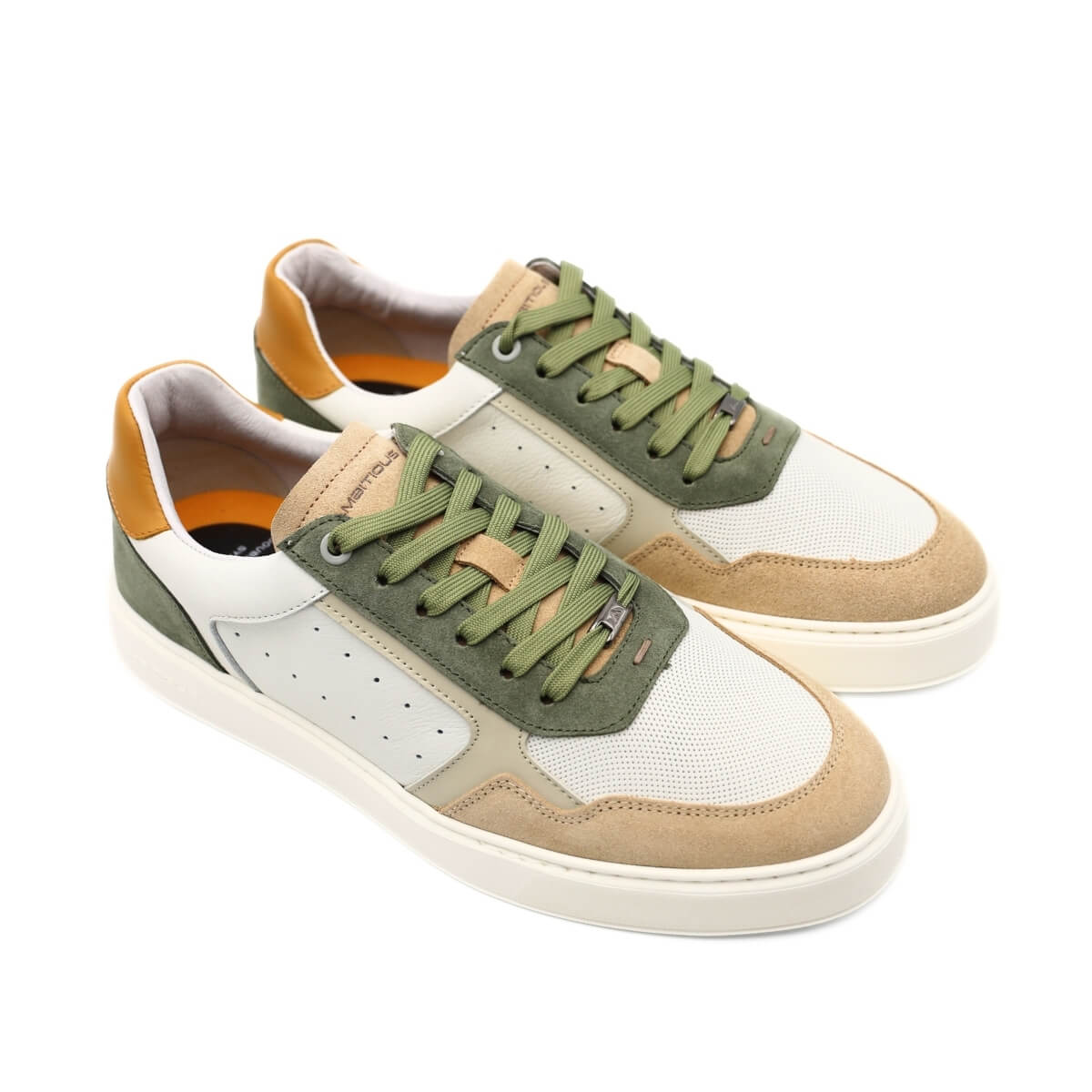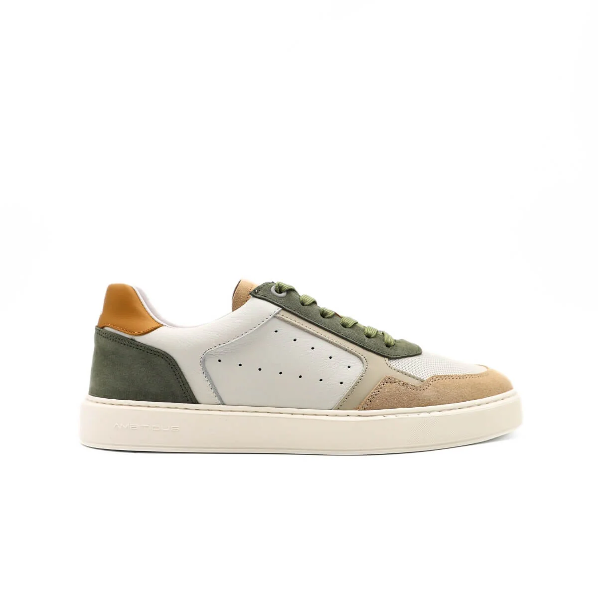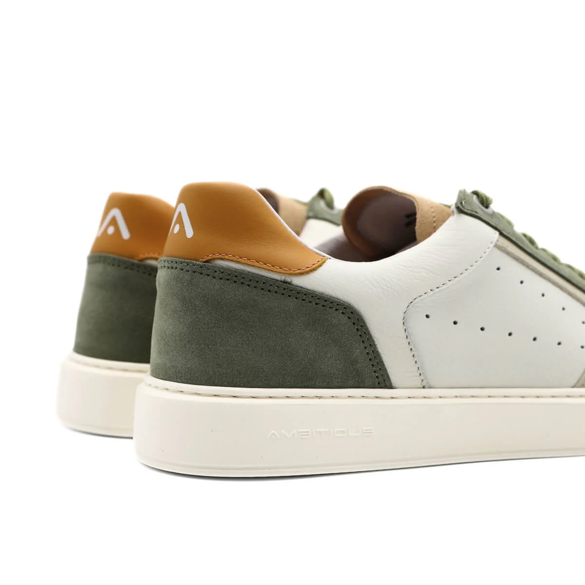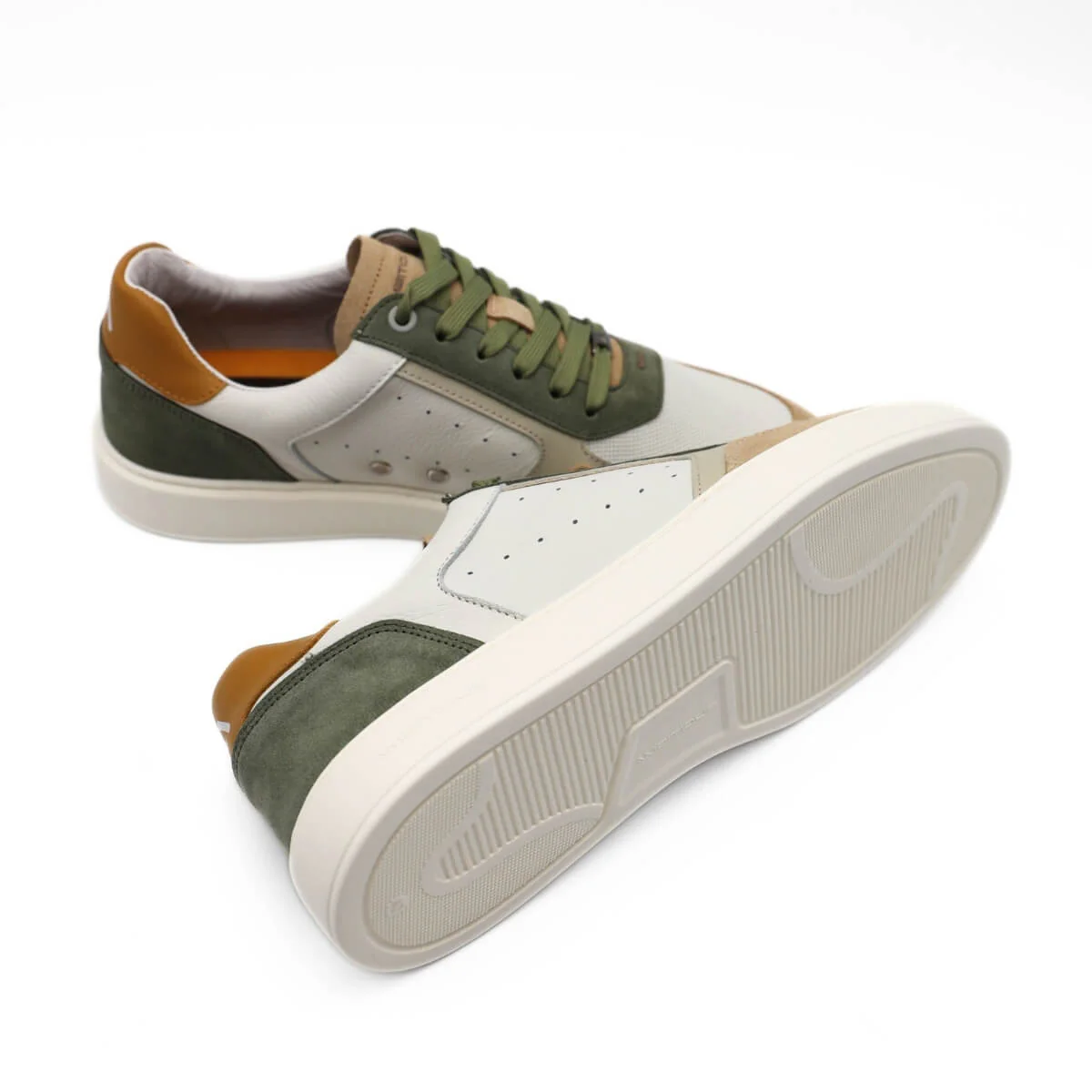 La tomaia è realizzata in pelle bianca con inserti beige e verdi per conferire un tocco di particolarità, scelti per la loro resa estetica e per la sensazione autentica che restituisce al tatto. Morbida e liscia, la pelle offre un contatto piacevole e una percezione immediata di qualità, migliorando con l’uso e adattandosi gradualmente al piede.