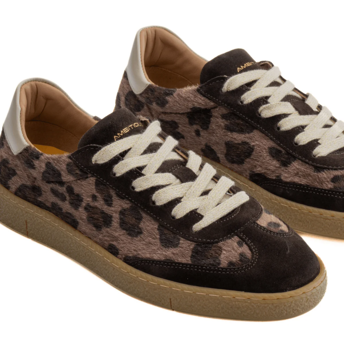 Le sneakers di AMBITIOUS modello NOA Retro combinano l’ispirazione dei ricami vintage con un design contemporaneo. Tomaia realizzata in morbido tessuto effetto cavallino animalier con inserti in pelle scamosciata marrone e tallone in pelle perlata. Interno foderato in pelle e sottopiede in lattice estraibile. Suola in gomma leggera e laccio con inserti lurex.