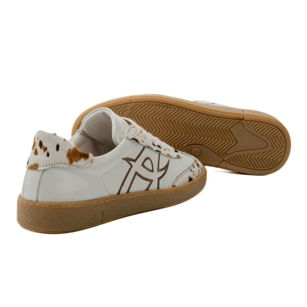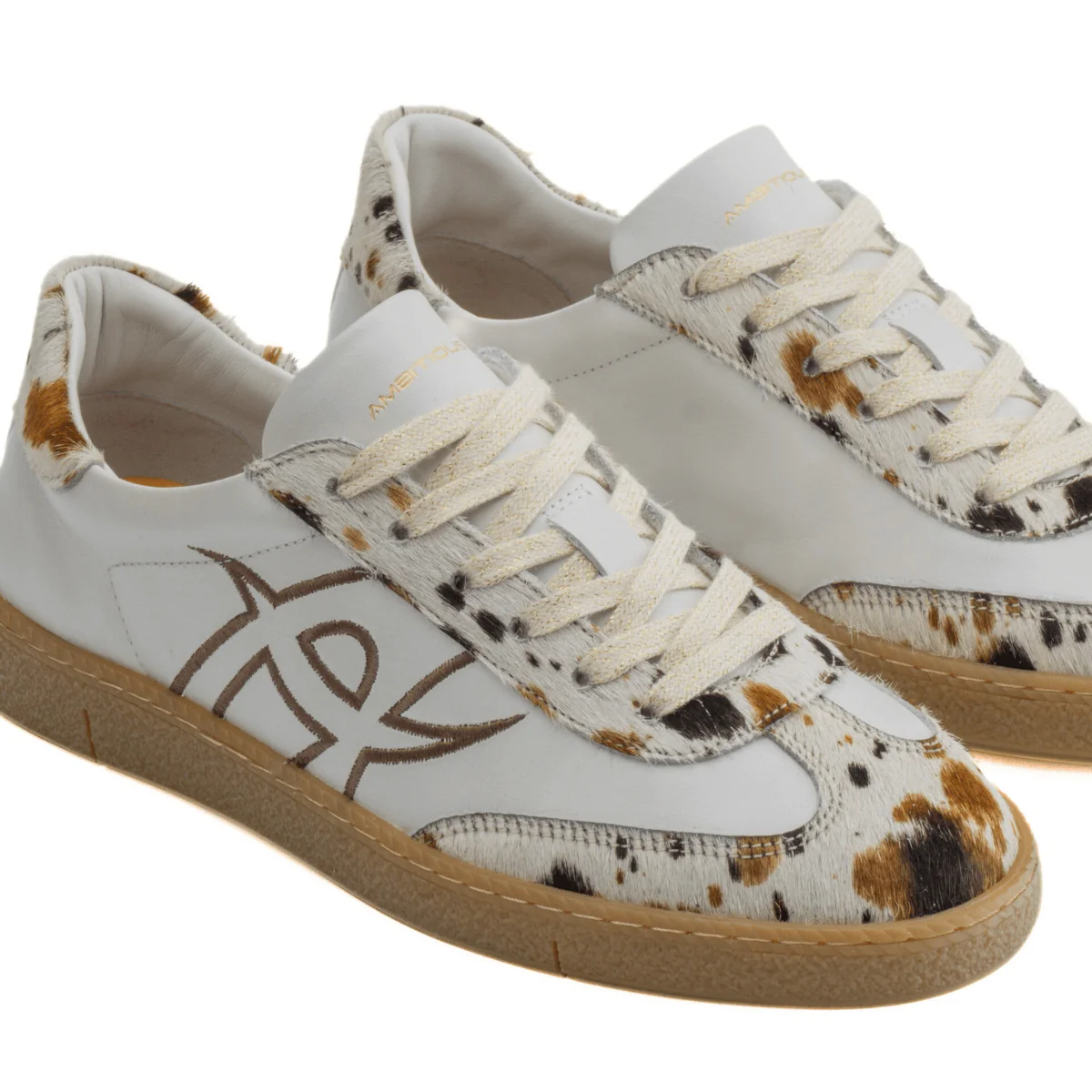 Le sneakers di AMBITIOUS modello NOA Retro combinano l’ispirazione dei ricami vintage con un design contemporaneo. Tomaia realizzata in morbida pelle perlata con dettagli a contrasto effetto cavallino animalier. Interno foderato in pelle e sottopiede in lattice estraibile. Suola in gomma leggera e laccio con inserti lurex.