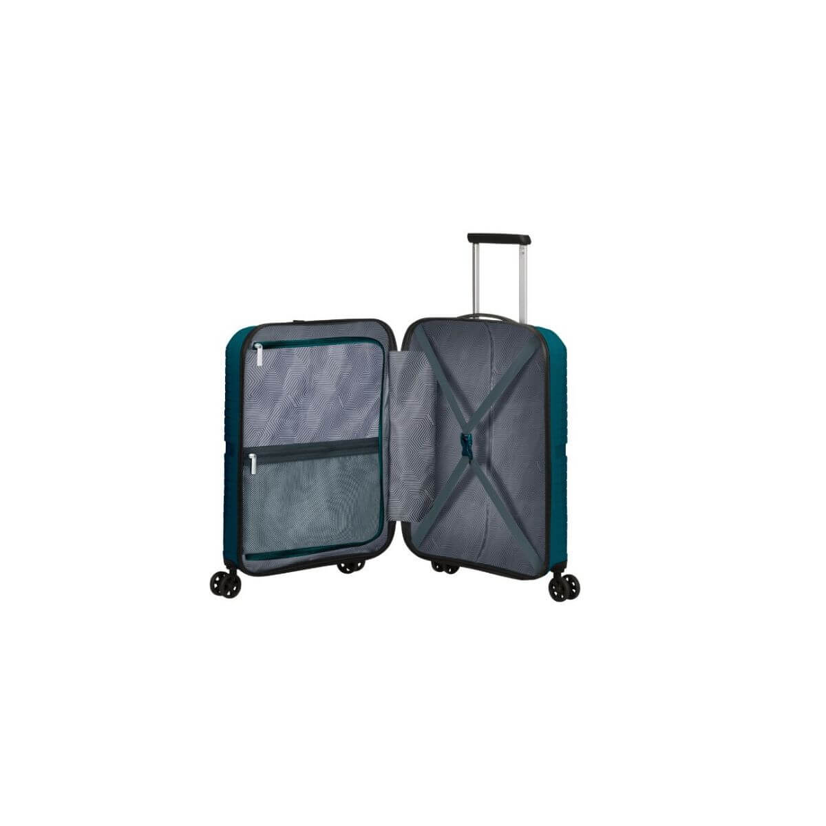 Bagaglio a mano rigido, della linea AIRCONIC di AMERICAN TOURISTER dal design unico con ispirazione a linee geometriche. Realizzato in Polypropylene. Interno con due scomparti foderate con cinghie, altra chiusa con retina. Chiusura con zip, combinazione e sistema TSA. Quattro ruote bidirezionali. Carrello bitubo.