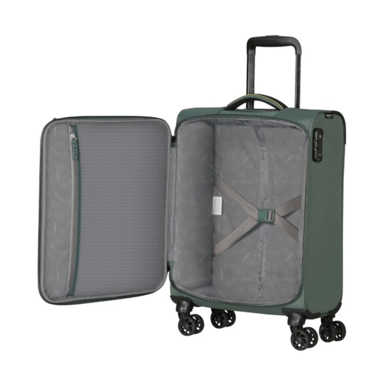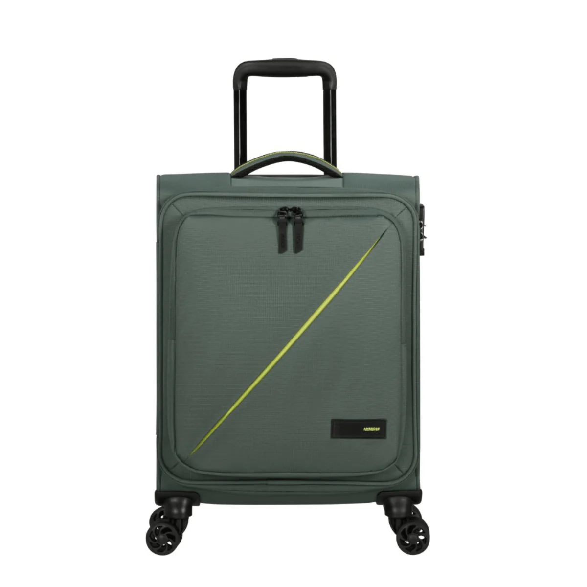 Bagaglio a mano morbido, della linea TAKE2CABIN di AMERICAN TOURISTER dal design unico color verde. Realizzato in tessuto. Interno con unica tasca foderata e tasca in rete per accessori. Tasca esterna con zip. Chiusura con combinazione e sistema TSA. Quattro ruote bidirezionali. Carrello bitubo.