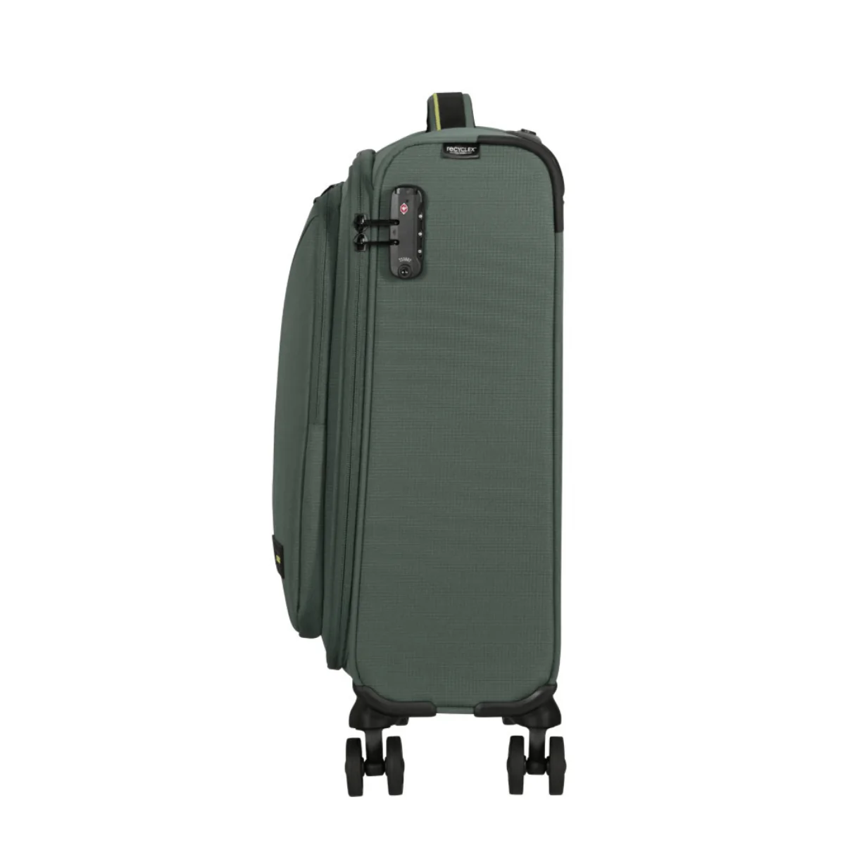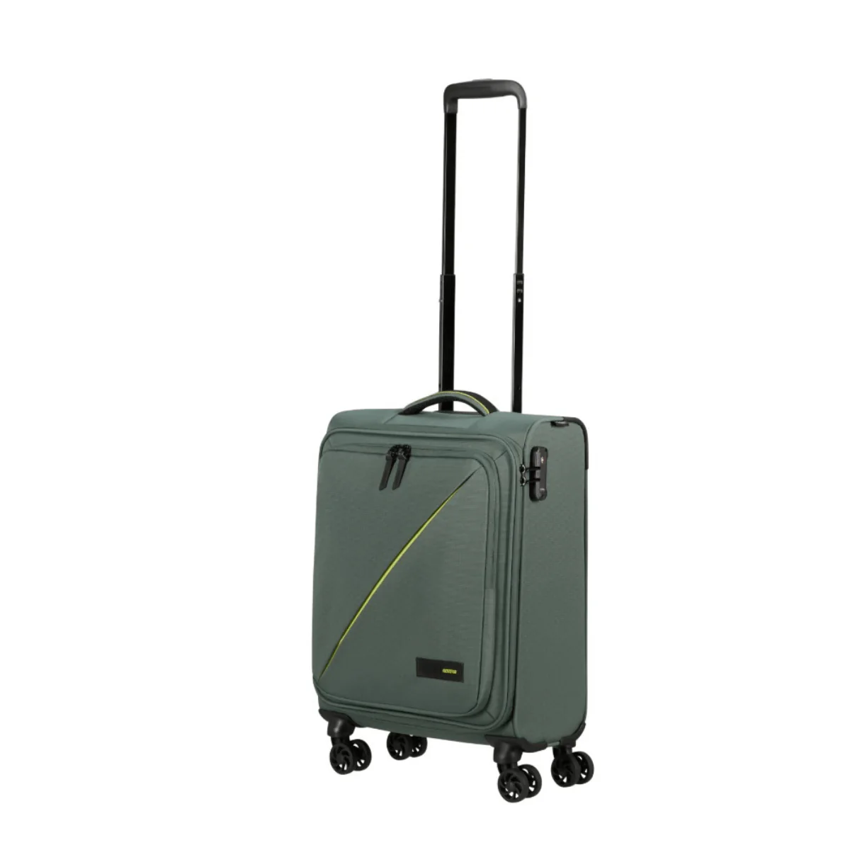 Bagaglio a mano morbido, della linea TAKE2CABIN di AMERICAN TOURISTER dal design unico color verde. Realizzato in tessuto. Interno con unica tasca foderata e tasca in rete per accessori. Tasca esterna con zip. Chiusura con combinazione e sistema TSA. Quattro ruote bidirezionali. Carrello bitubo. Cm: 55 x 40 x 20 Lt: 38.5 Kg: 2.6