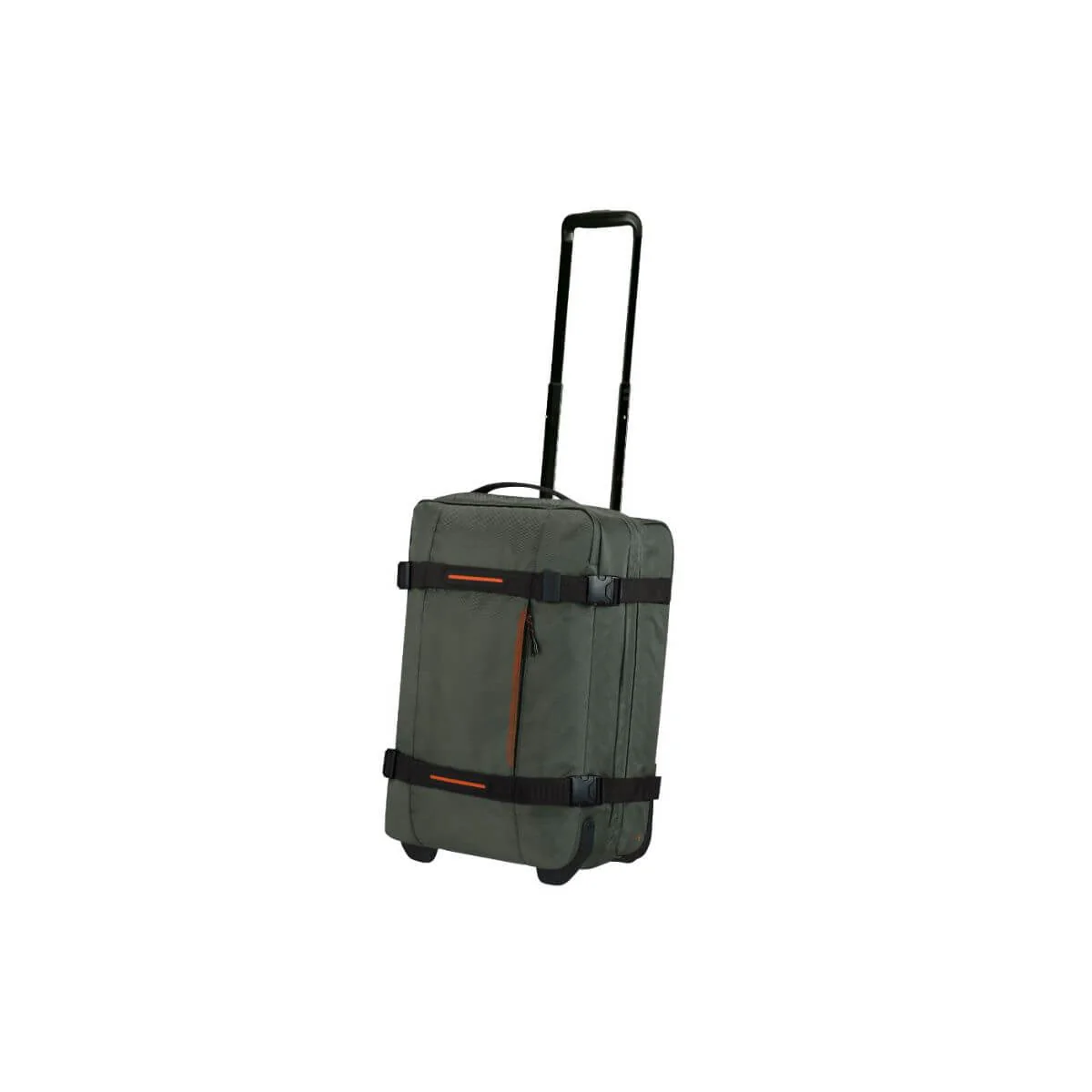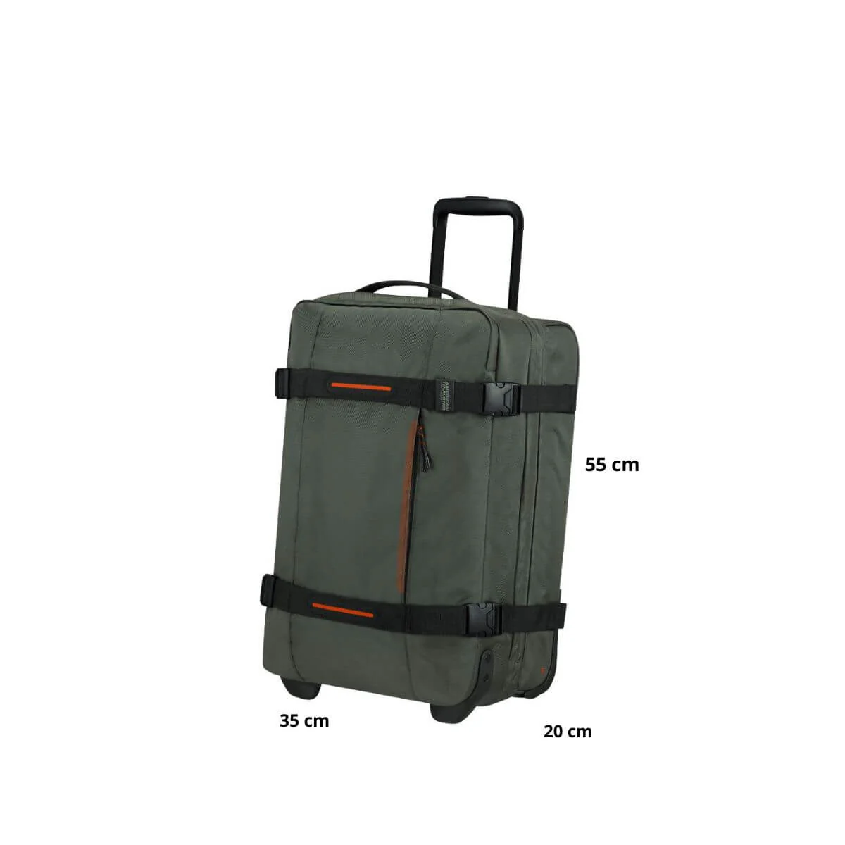 Borsone con ruote con misure da bagaglio a mano di AMERICAN TOURISTER della linea URBAN TRACK. Realizzato in tessuto riciclato verde con profili arancioni, doppia apertura entrambe chiuse con zip, una con cinghe ferma abiti. Chiusura con zip, ganci e sicurezza con combinazione e sistema TSA. Fondo rinforzato per permettere ai borsoni di stare in piede da soli. Due ruote.