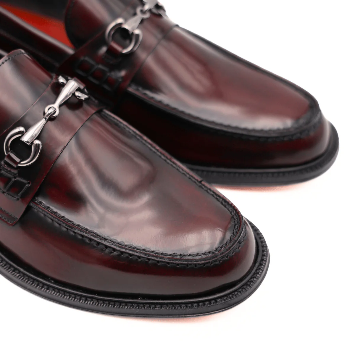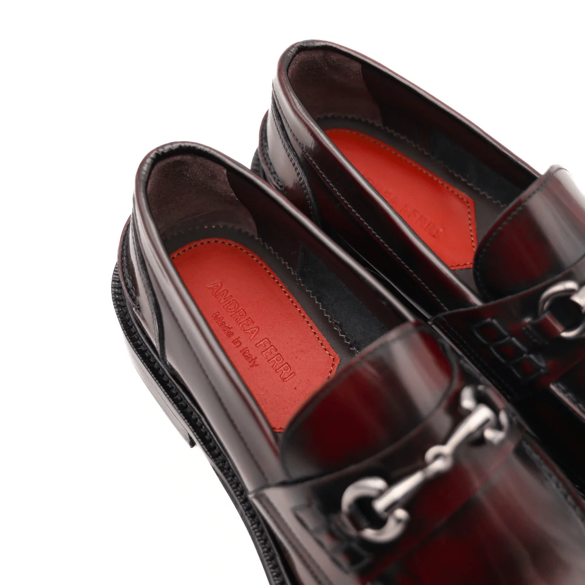 Mocassino da uomo di ANDREA FERRI realizzato in pelle spazzolata bordeaux con accessorio argento. Interno e sottopiede, non estraibile, in pelle. Suola in cuoio (3cm).