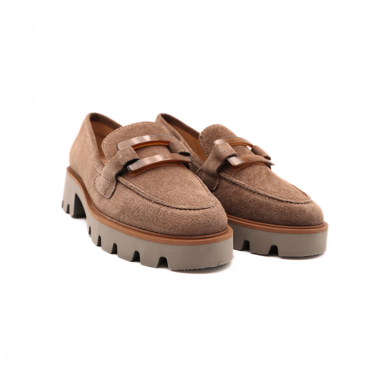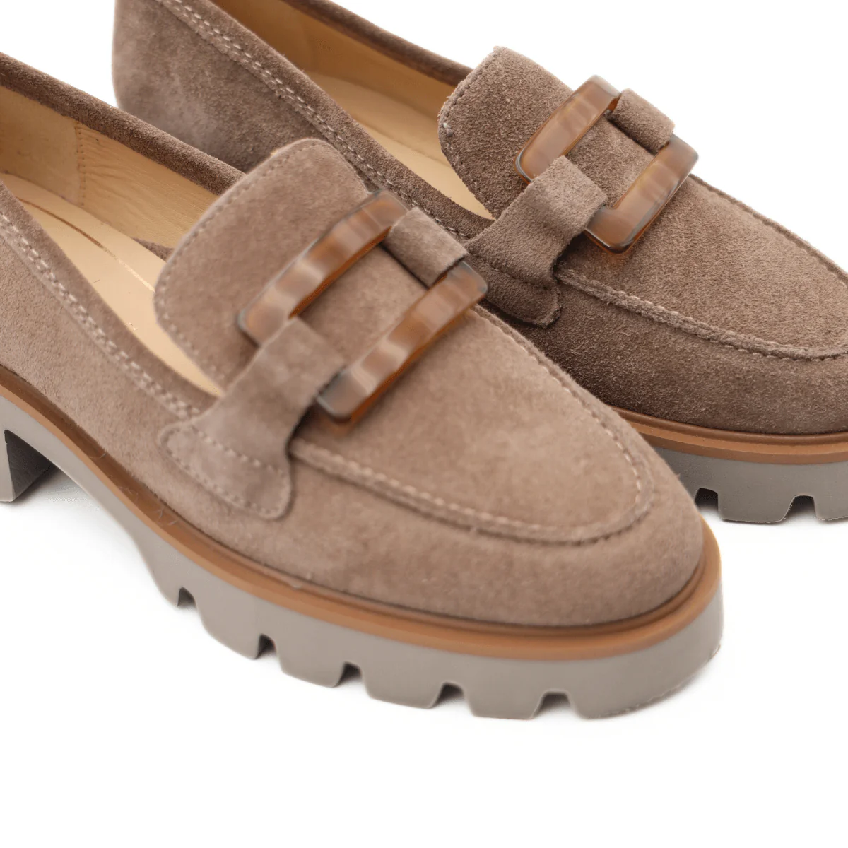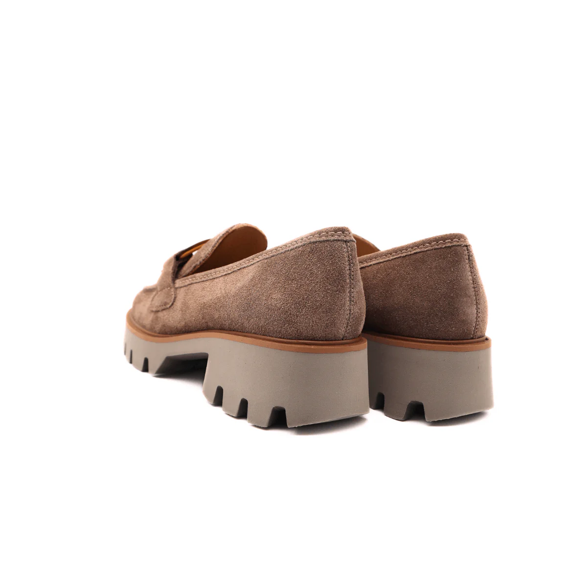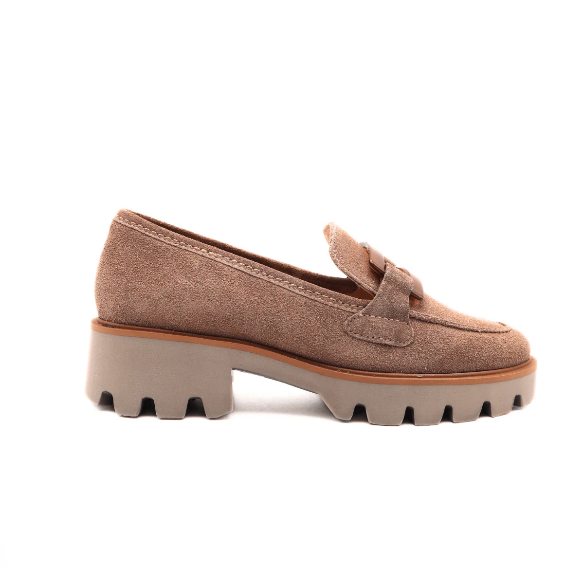 Mocassino in pelle scamosciata color sesamo, di ARA, decorato con fibbia color cuoio. Comoda calzata, morbido plantare in pelle High Soft. Suola in gomma carrarmato, altezza 4 cm.