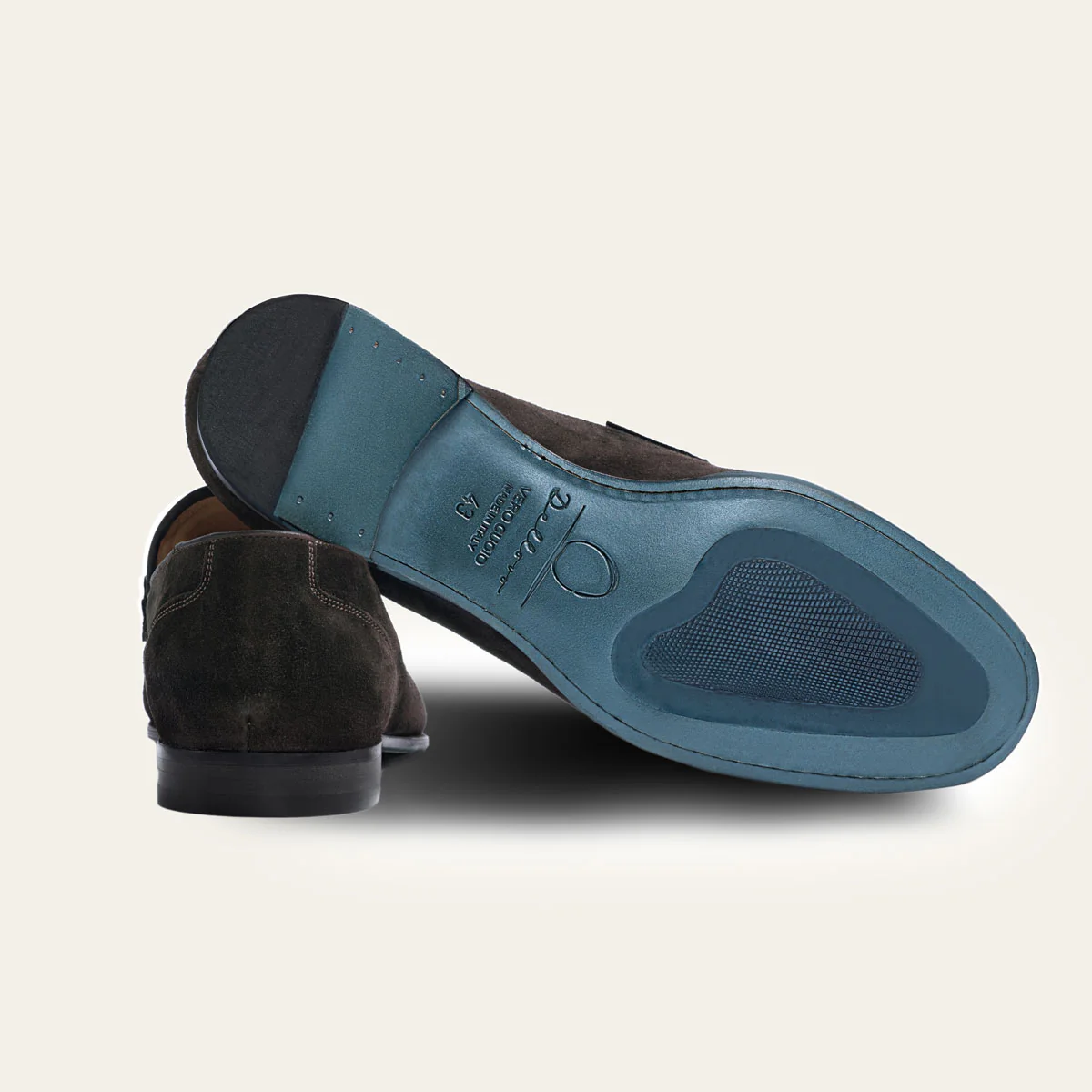 • Suola: Cuoio color ottanio con ovalino in gomma e logo a fuoco