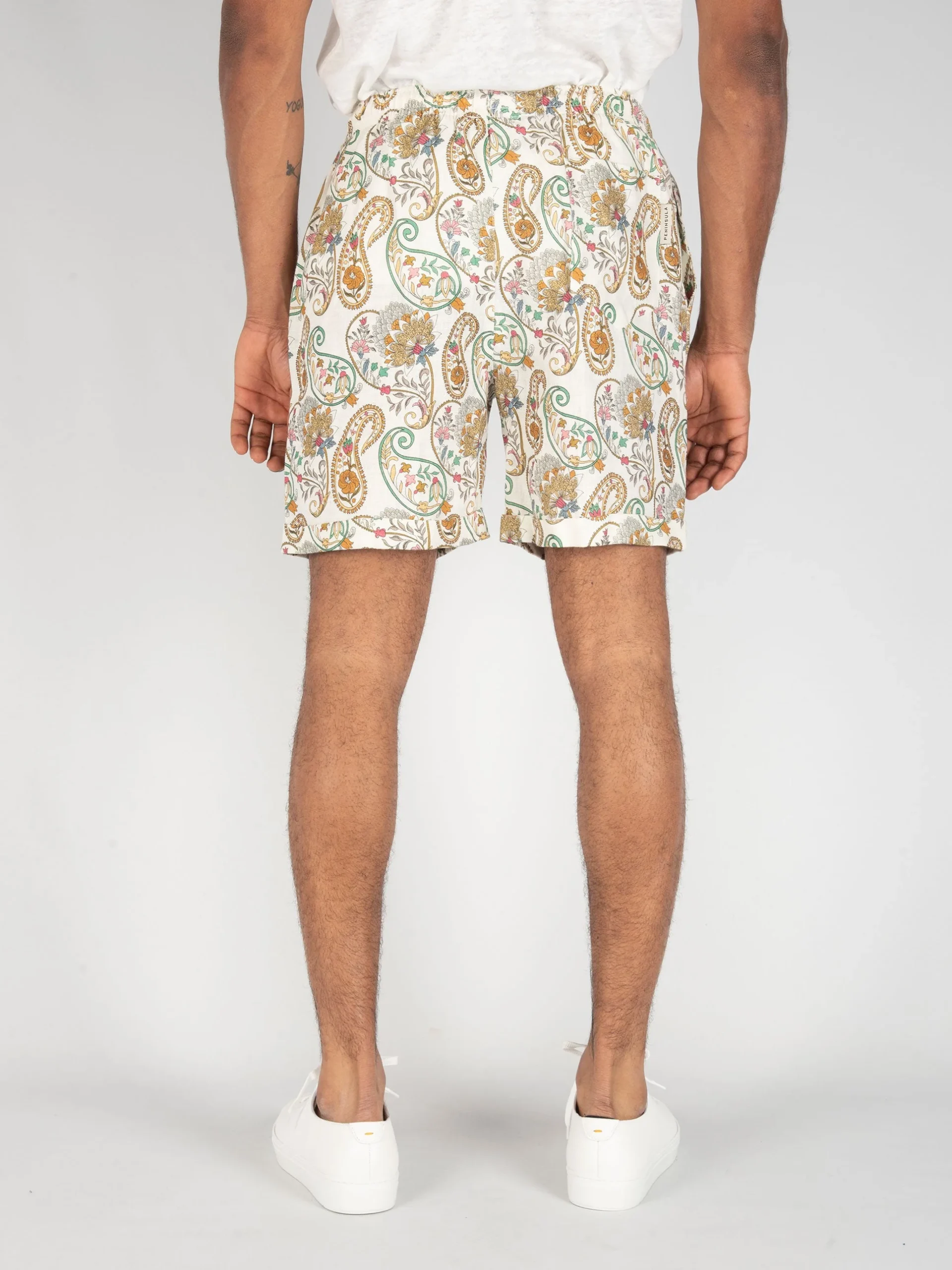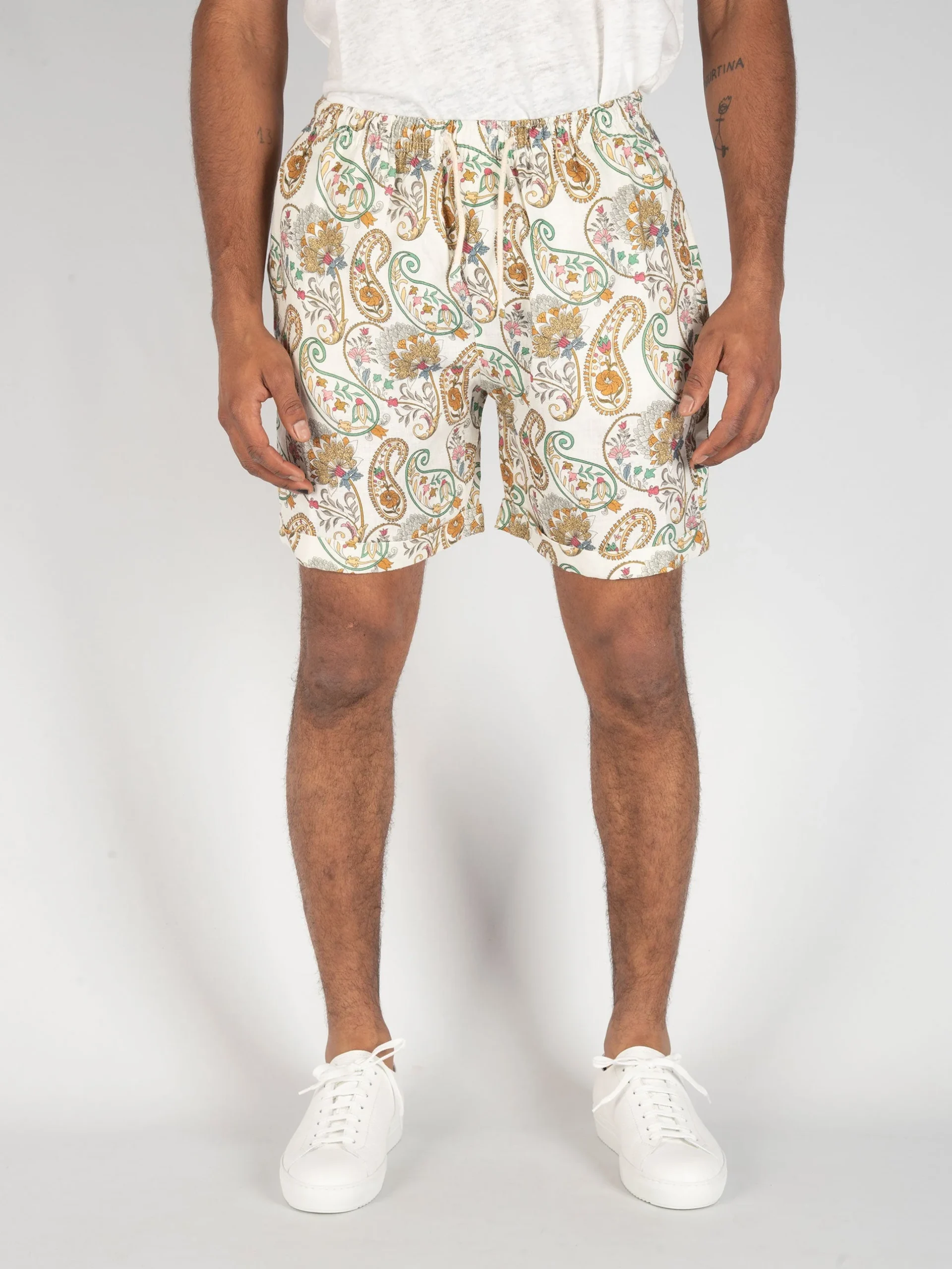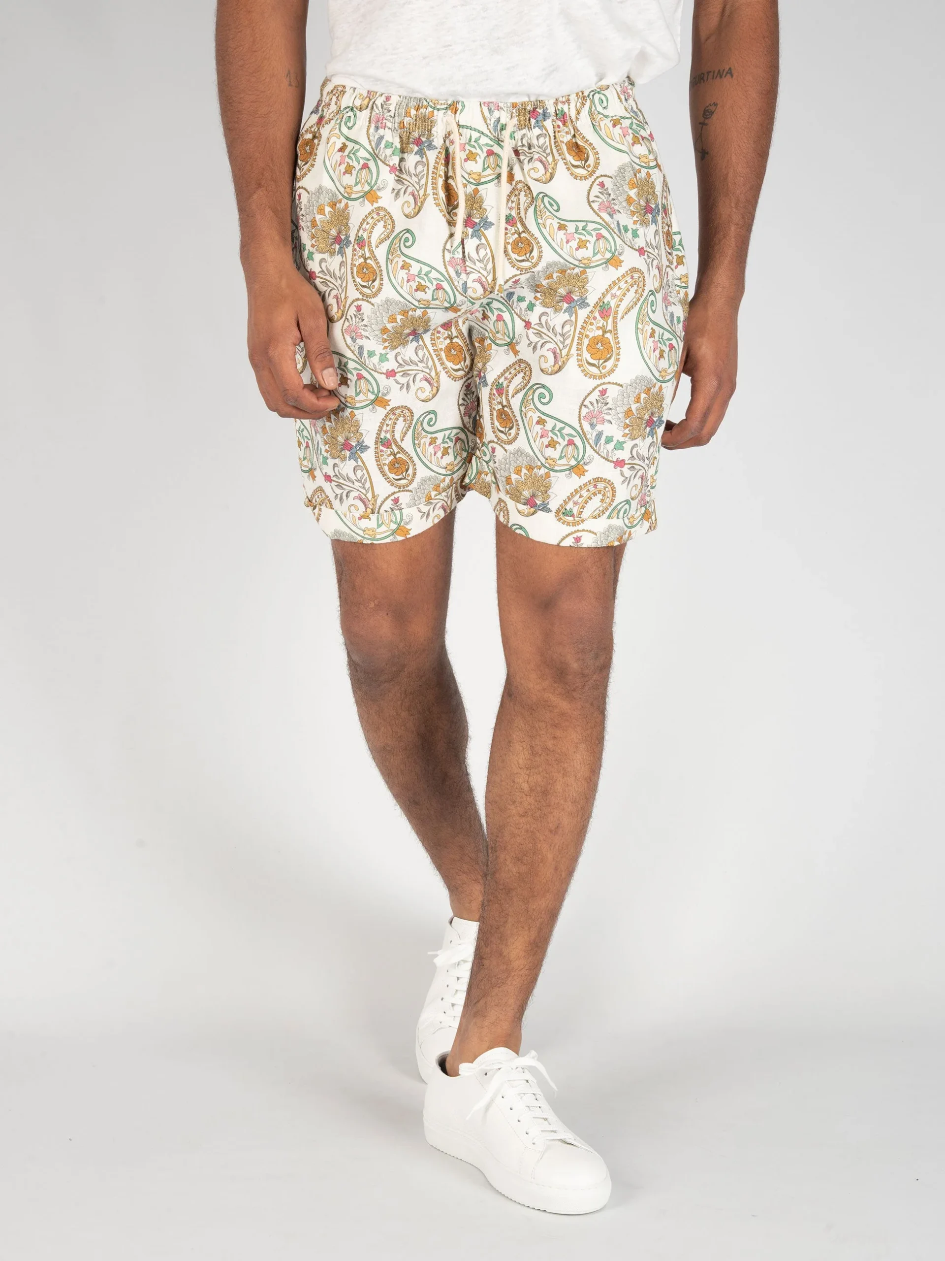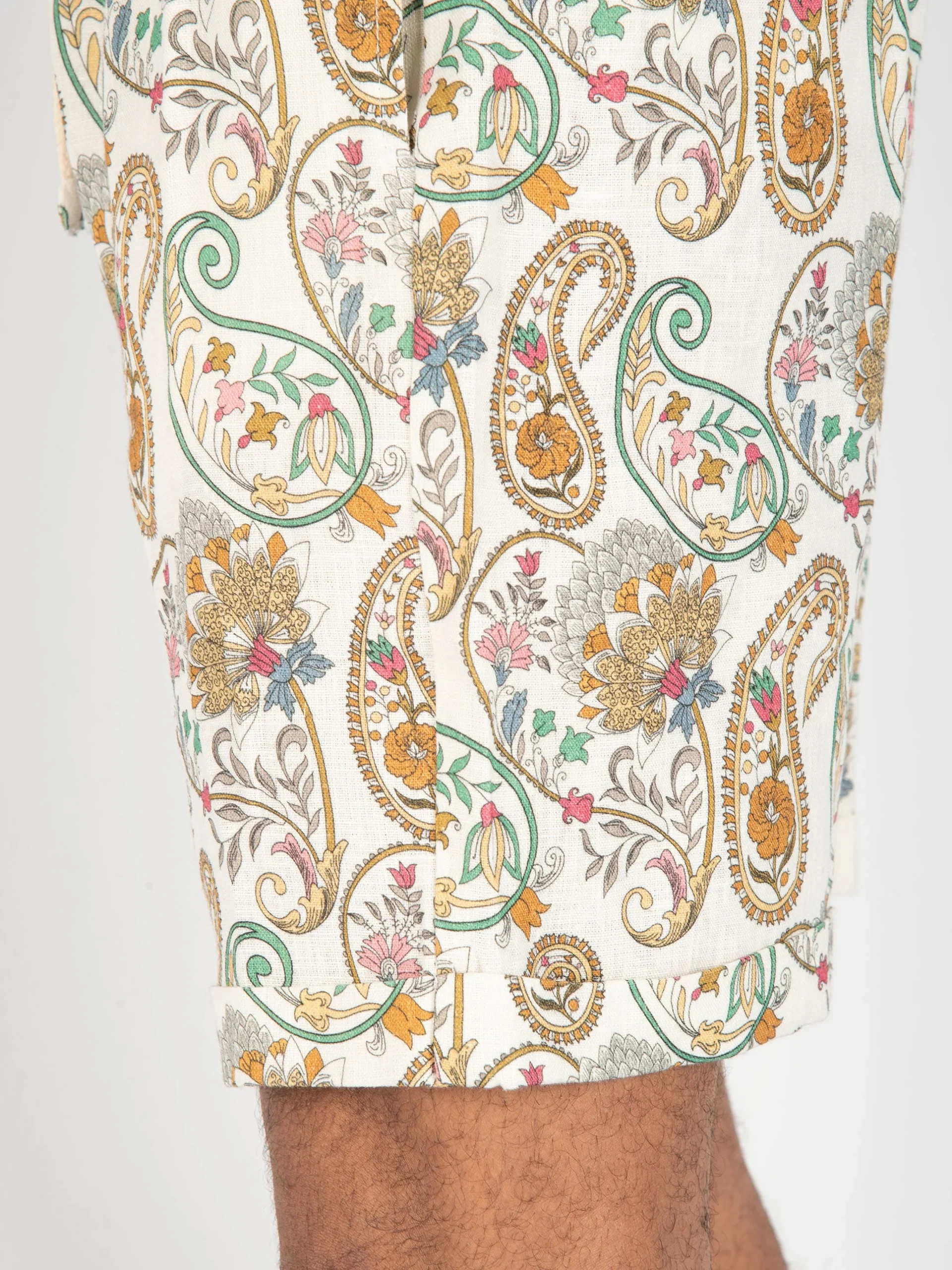 - Bermuda in lino con fantasia floreale e paisley.