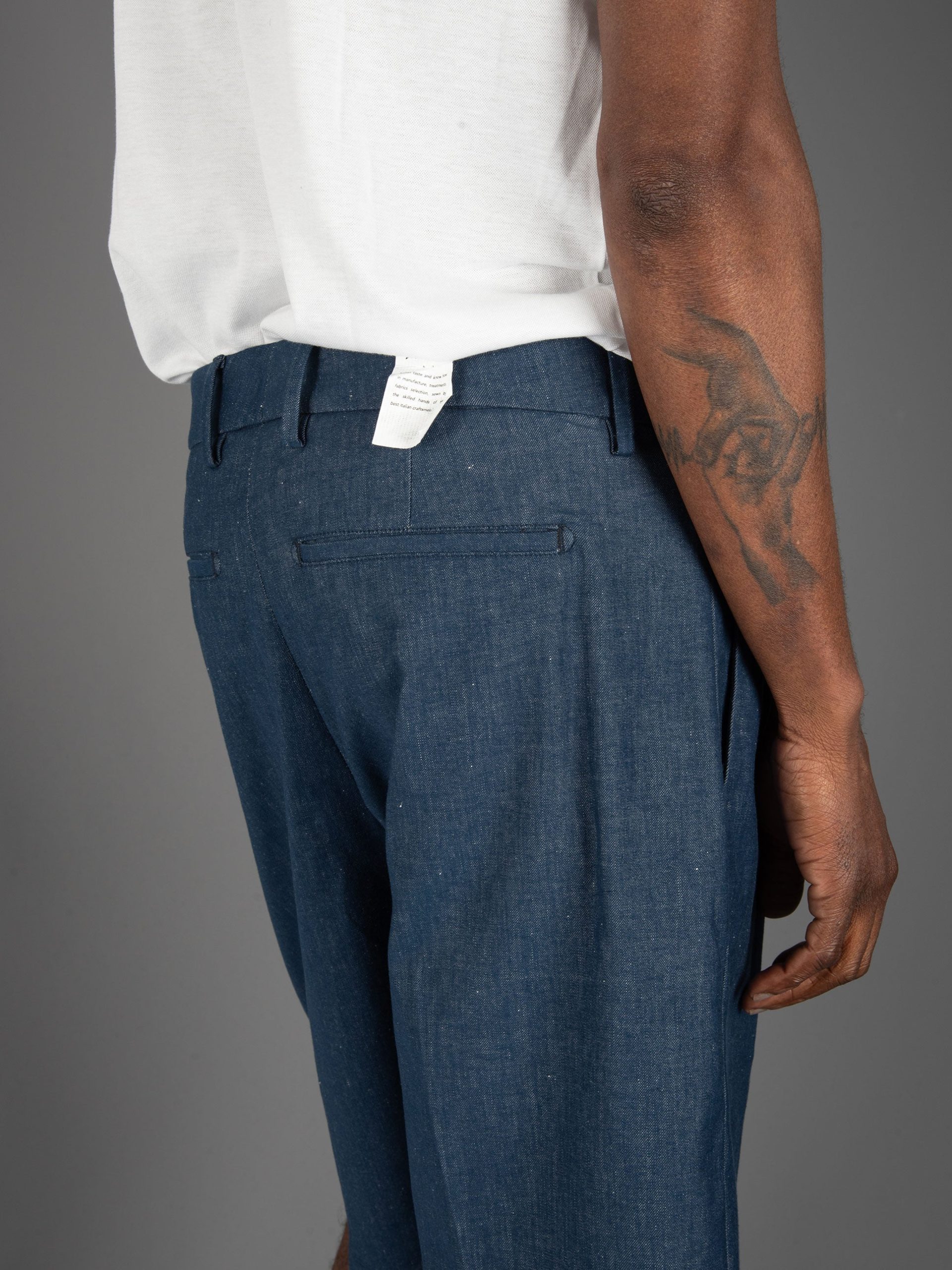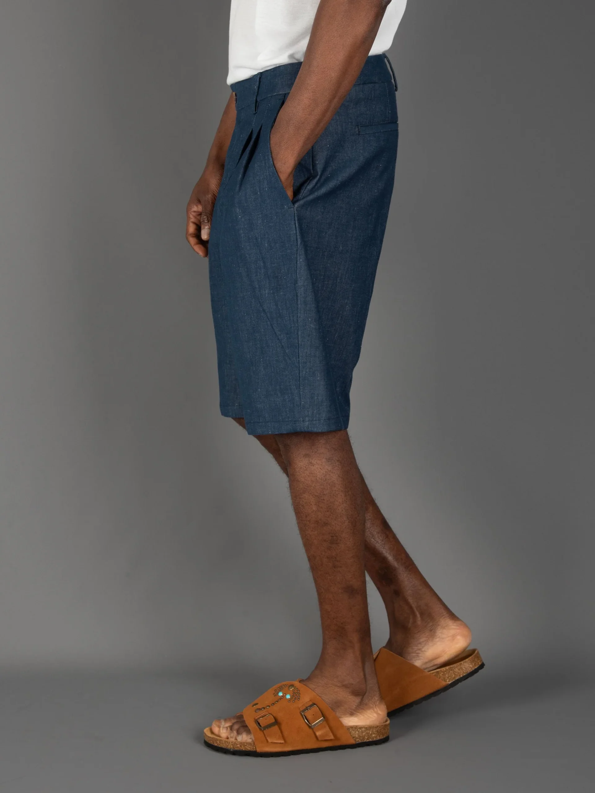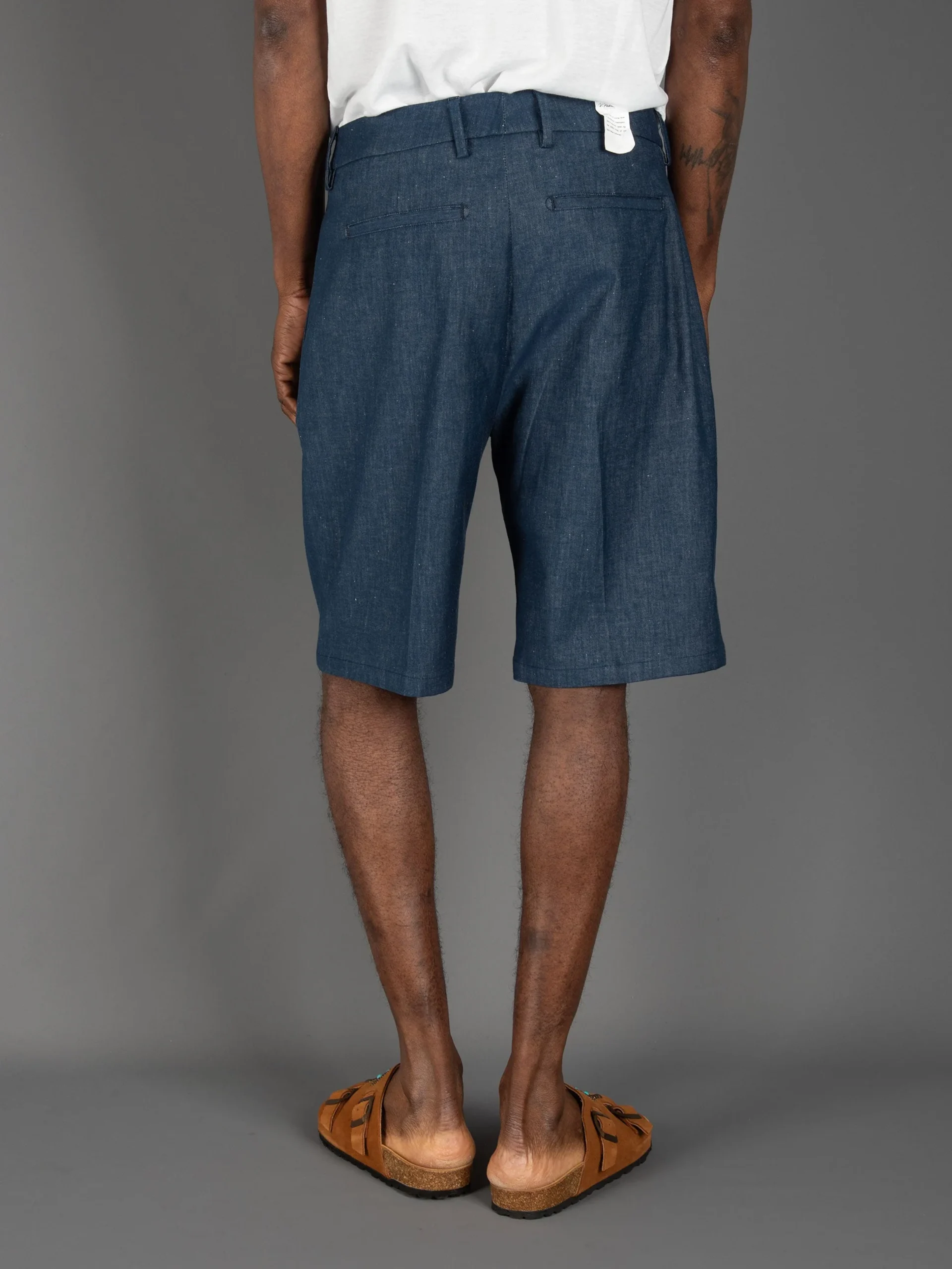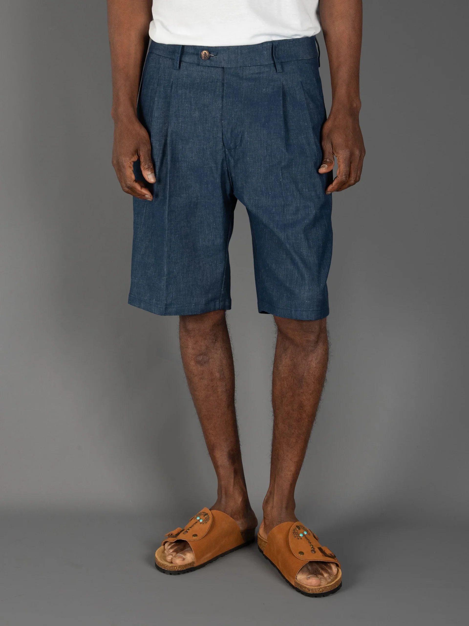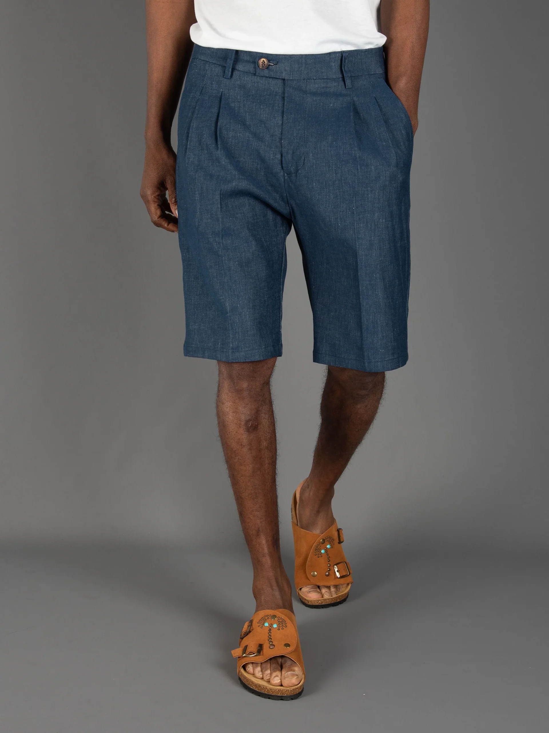 Mod: JASON SH T110 DENIM 17 Bermuda con doppia pence in cotone e lino. Allacciatura con cinturino, bottoni e zip. Tasche america e a filo sul retro. Vestibilità morbida. Composizione: 70% cotone 28% lino e 2% elastan. 100% made in Italy. Il modello è alto 183cm e pesa 73 kg: indossa una taglia 48.