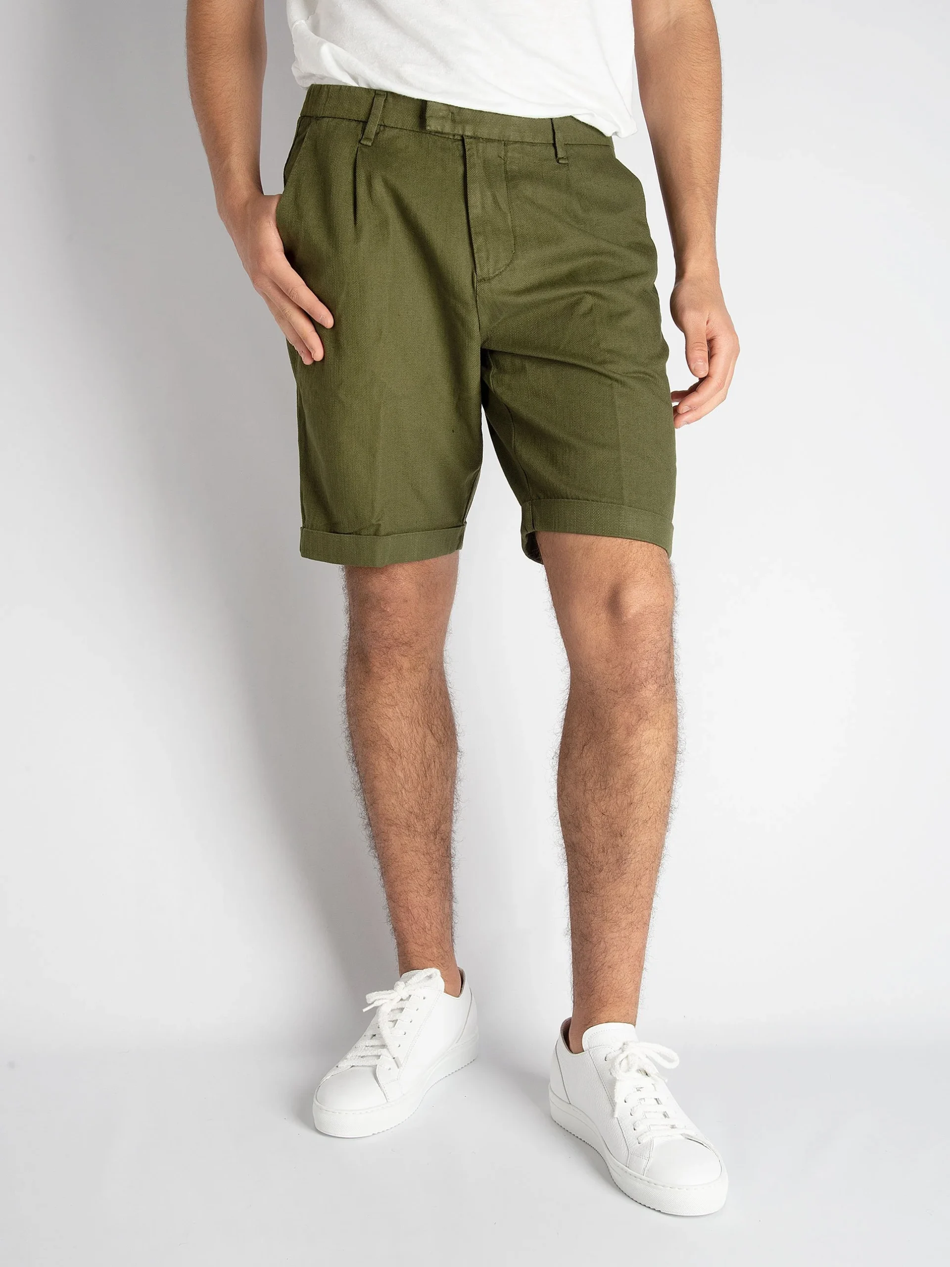 Mod: 20P713264 Col:27 Bermuda microperato in cotone e lino verde bosco. Cinturino sartoriale con bottone, zip e gancio. Tasche ventre piatto e a soffietto dietro. Micro pence e risvolto sul fondo. Vestibilità regolare. Composizione: 72% cotone, 25% lino, 3% elastan. 100% made in Italy. Il modello è alto 183cm e pesa 71 kg: indossa una […]