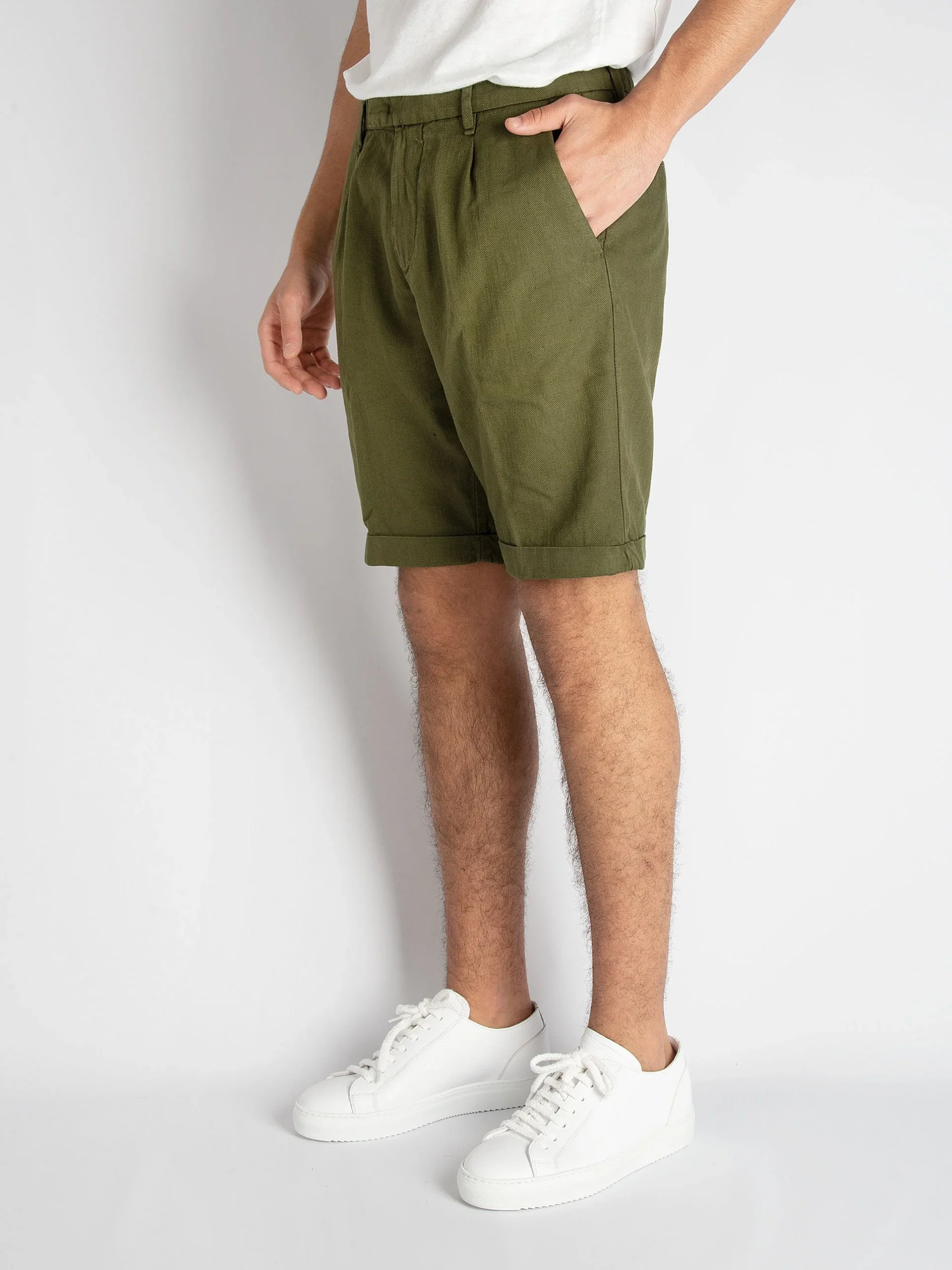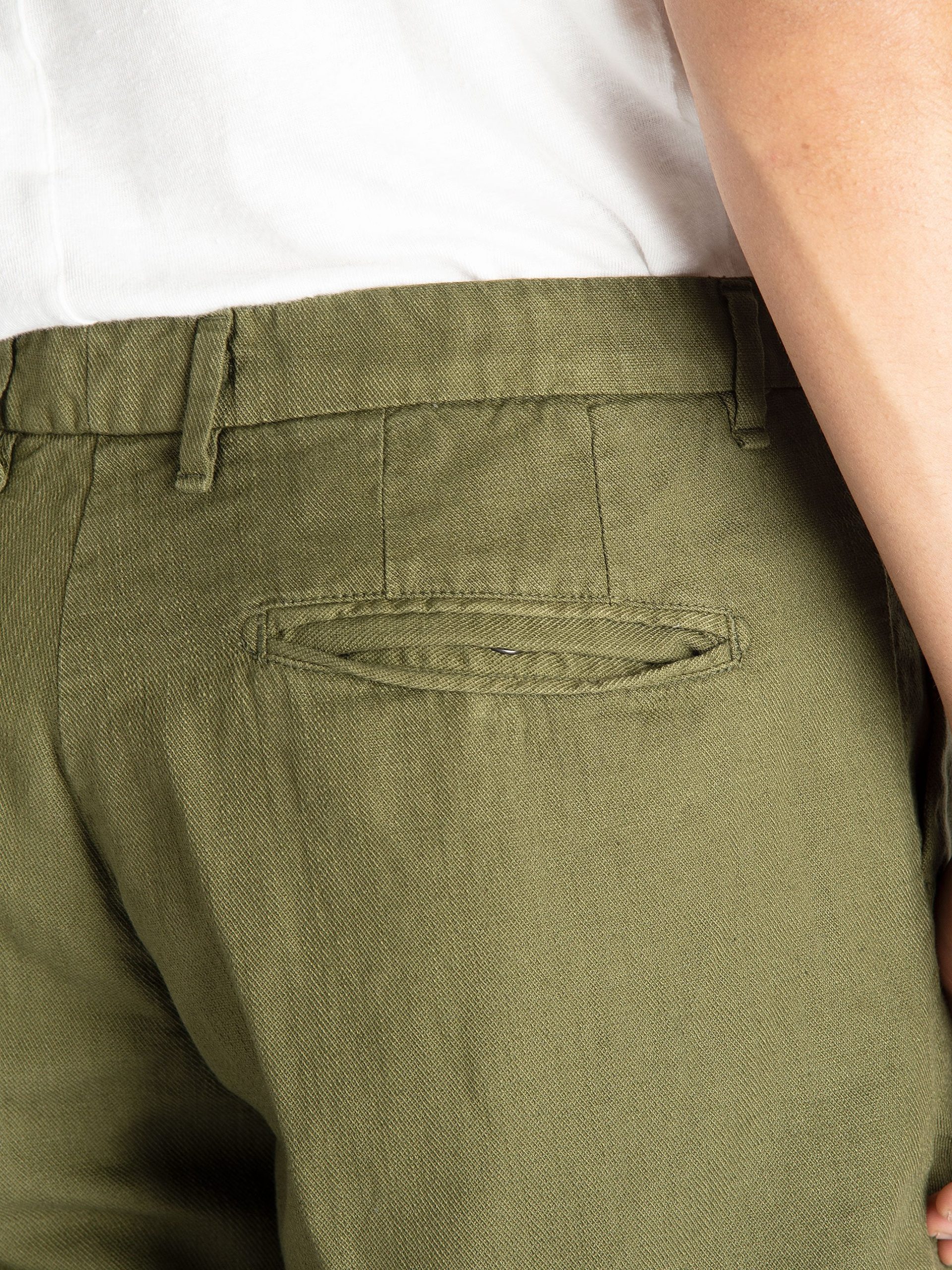 - Bermuda microperato in cotone e lino verde bosco.