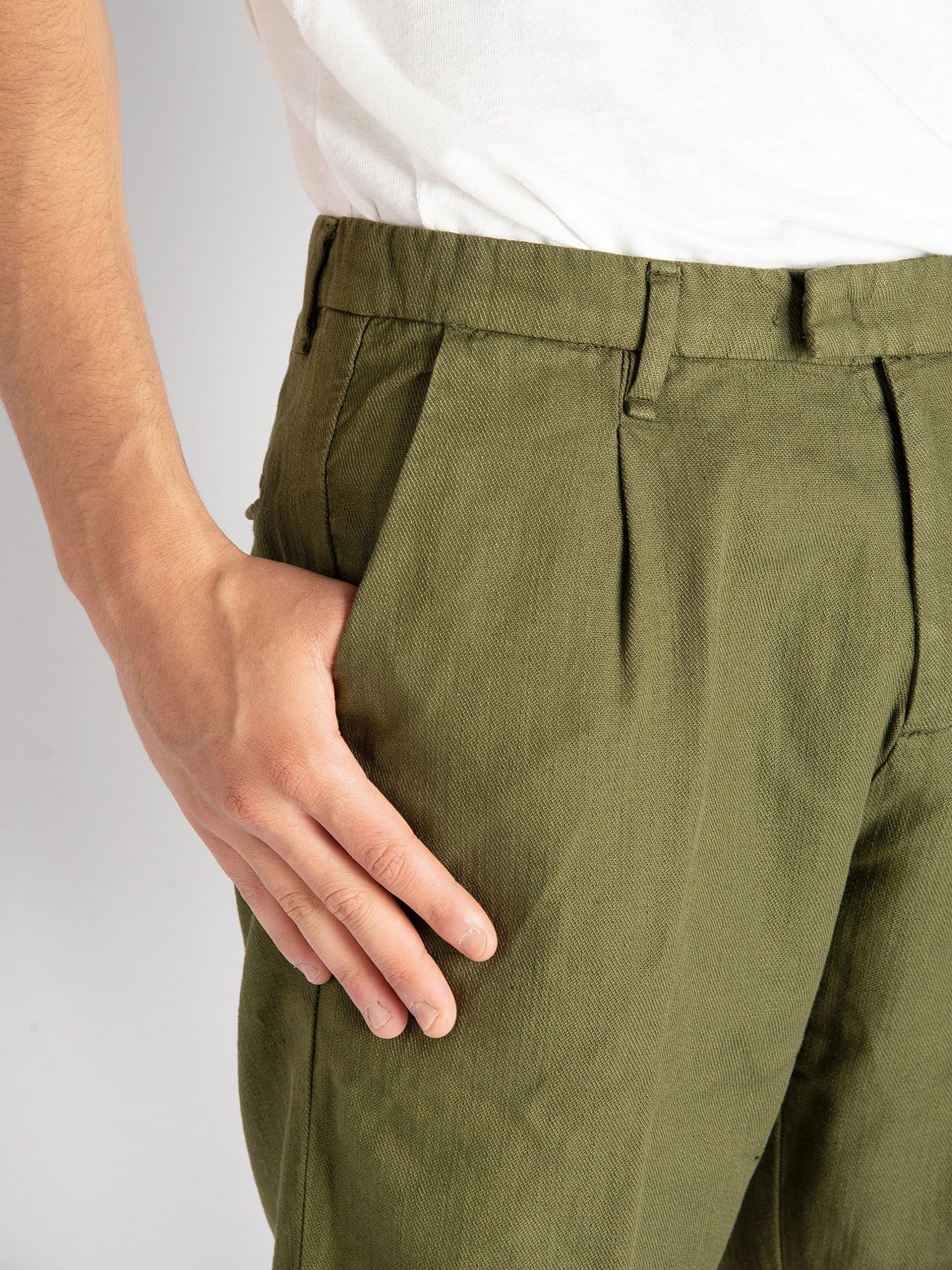 - Composizione: 72% cotone, 25% lino, 3% elastan.