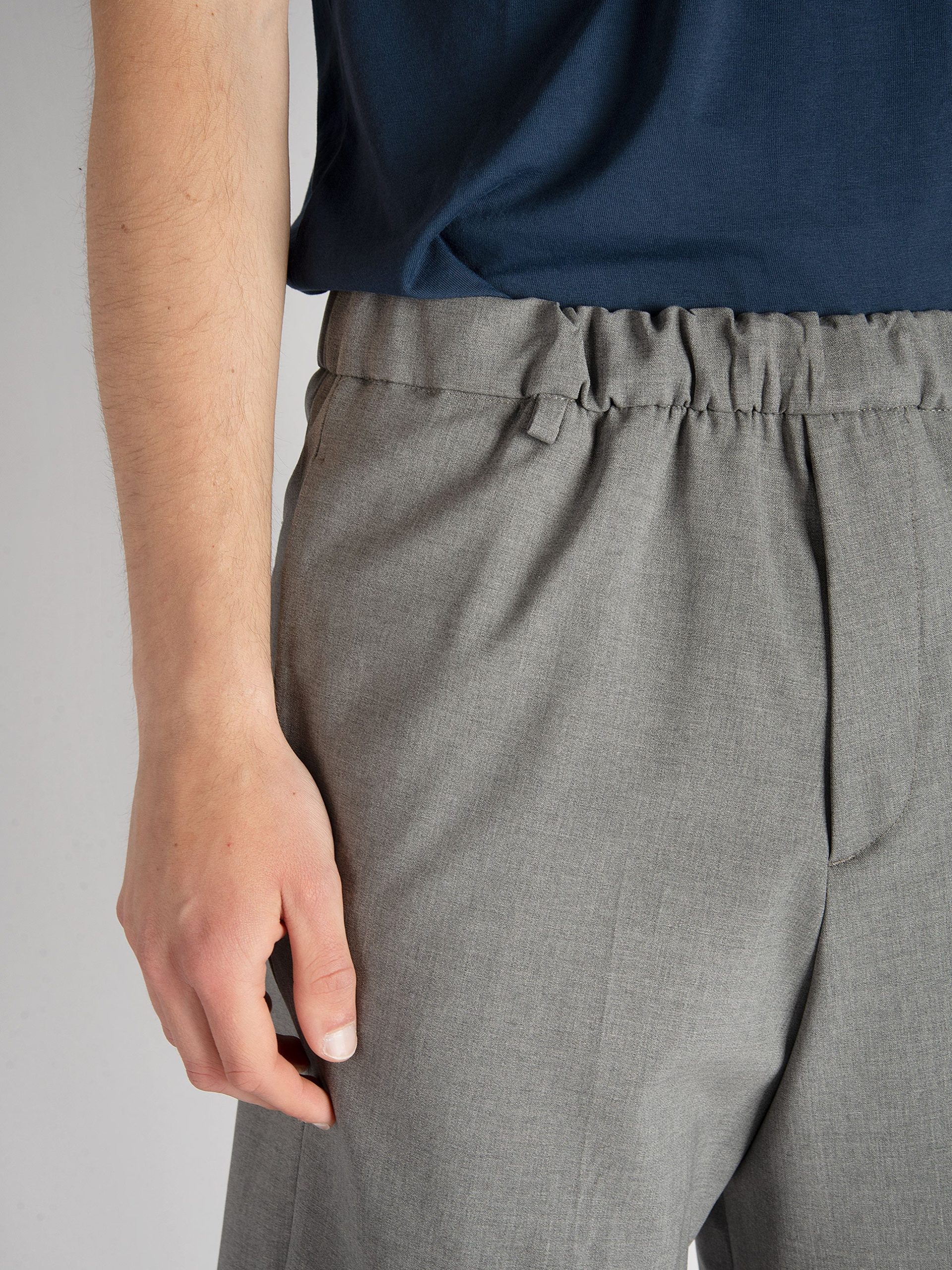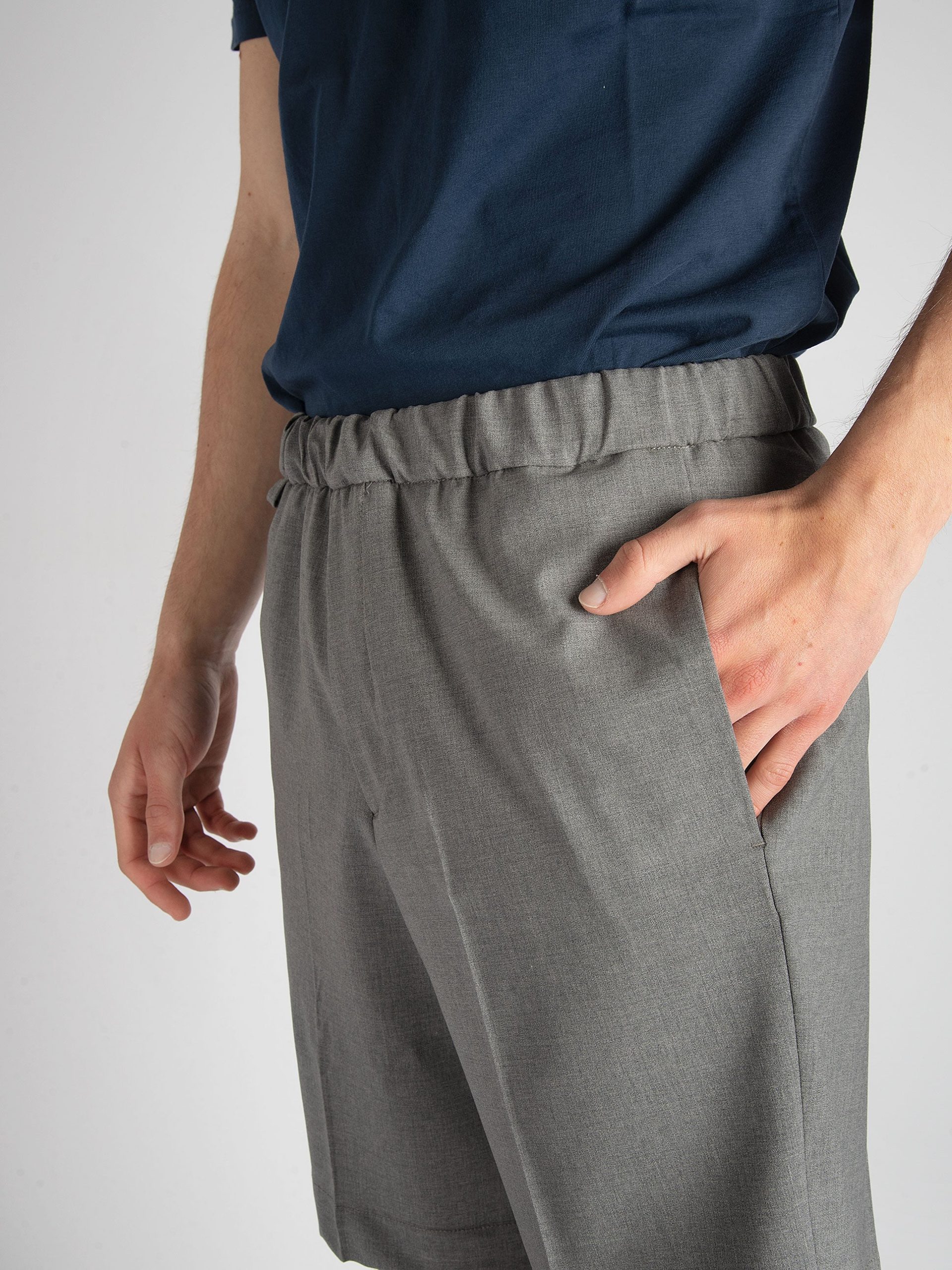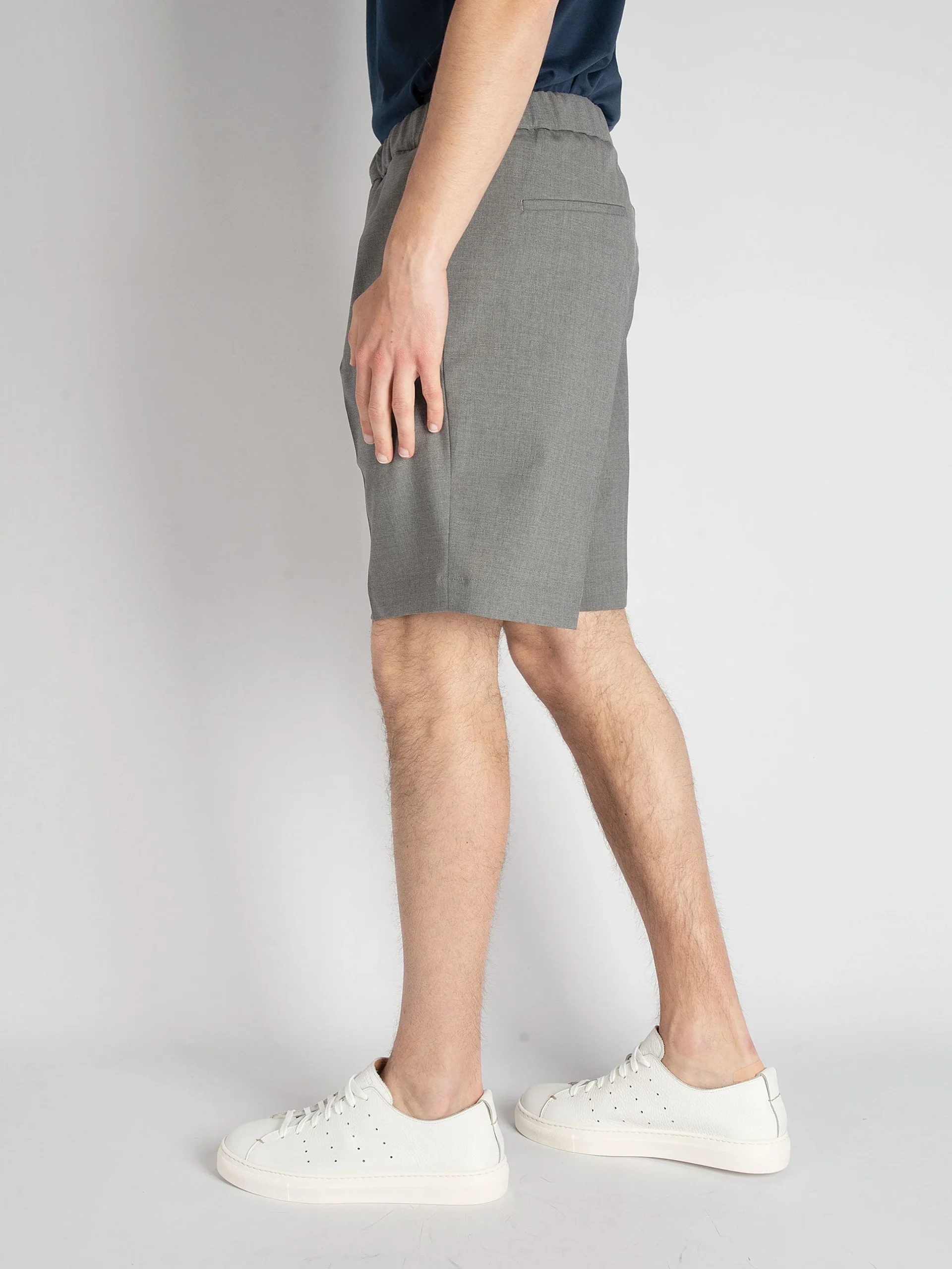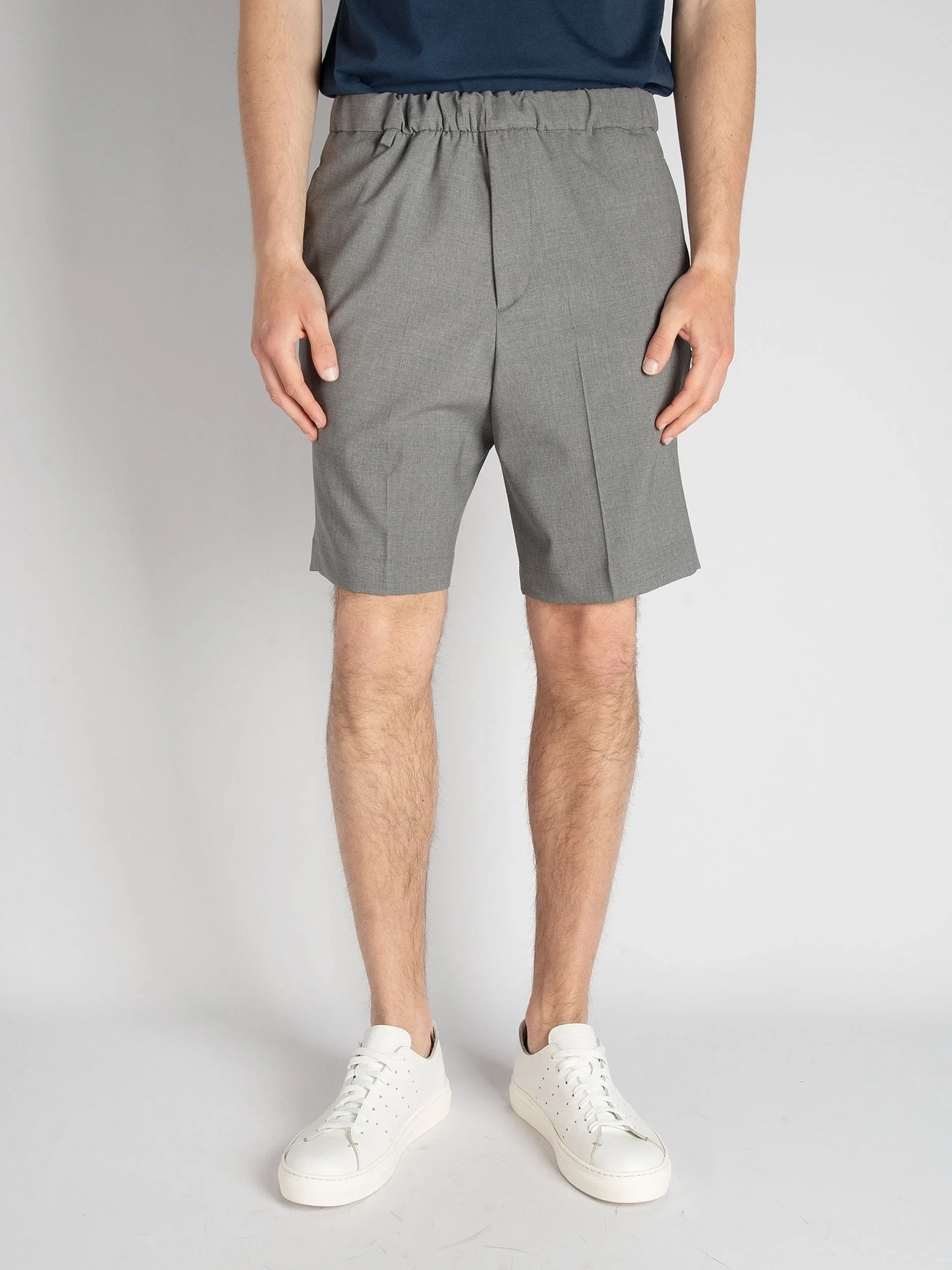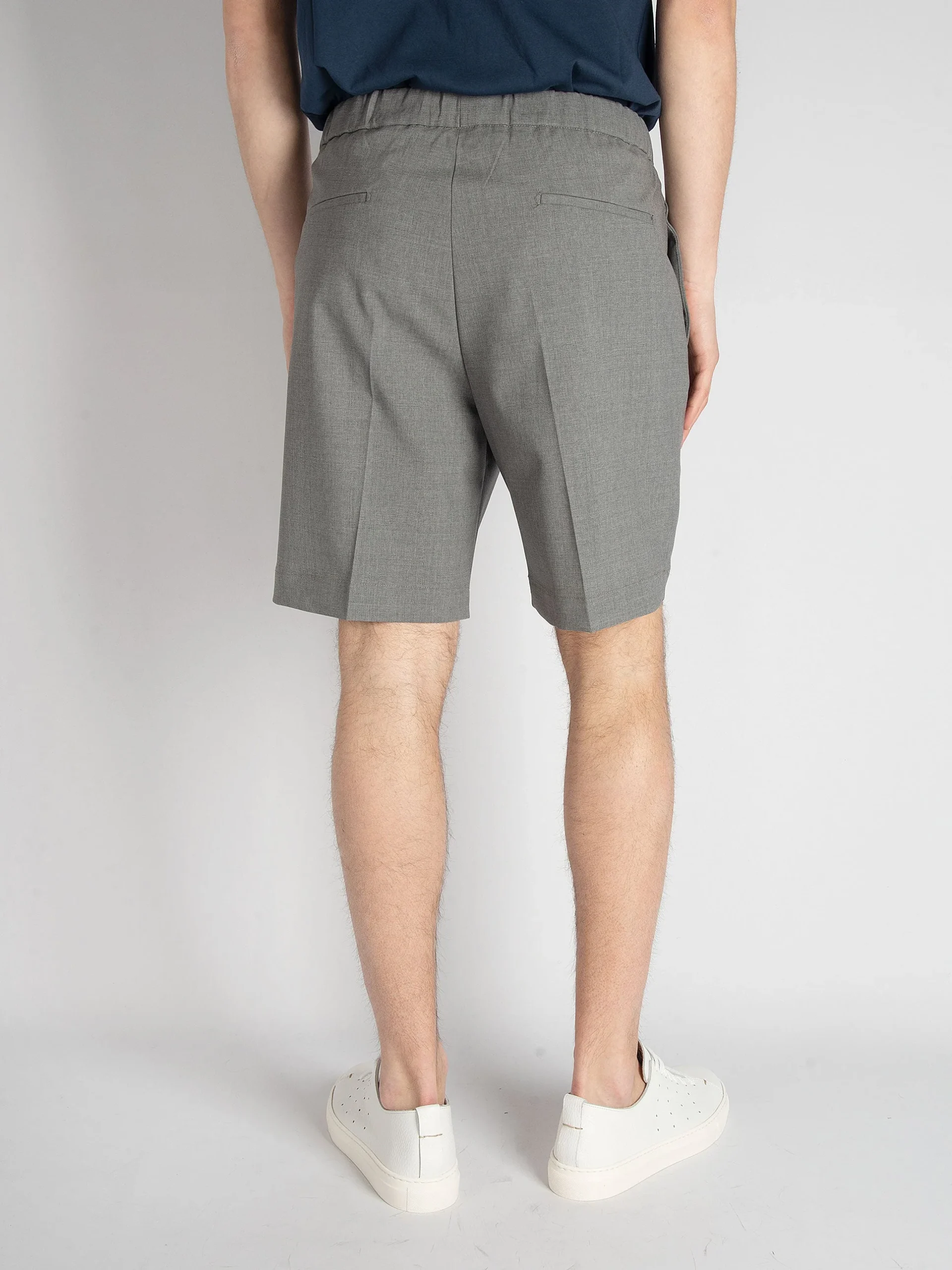 Mod: Roland ET s22 G.Medio Bermuda sartoriale in lana vergine. Cinturino con coulisse e lacci. Tasche filo laterali e dietro a soffietto. Vestibilità regolare. Composizione: 95% lana vergine e 5% elastan. 100% made in Italy. Il modello è alto 185cm e pesa 71 kg: indossa una taglia 31.