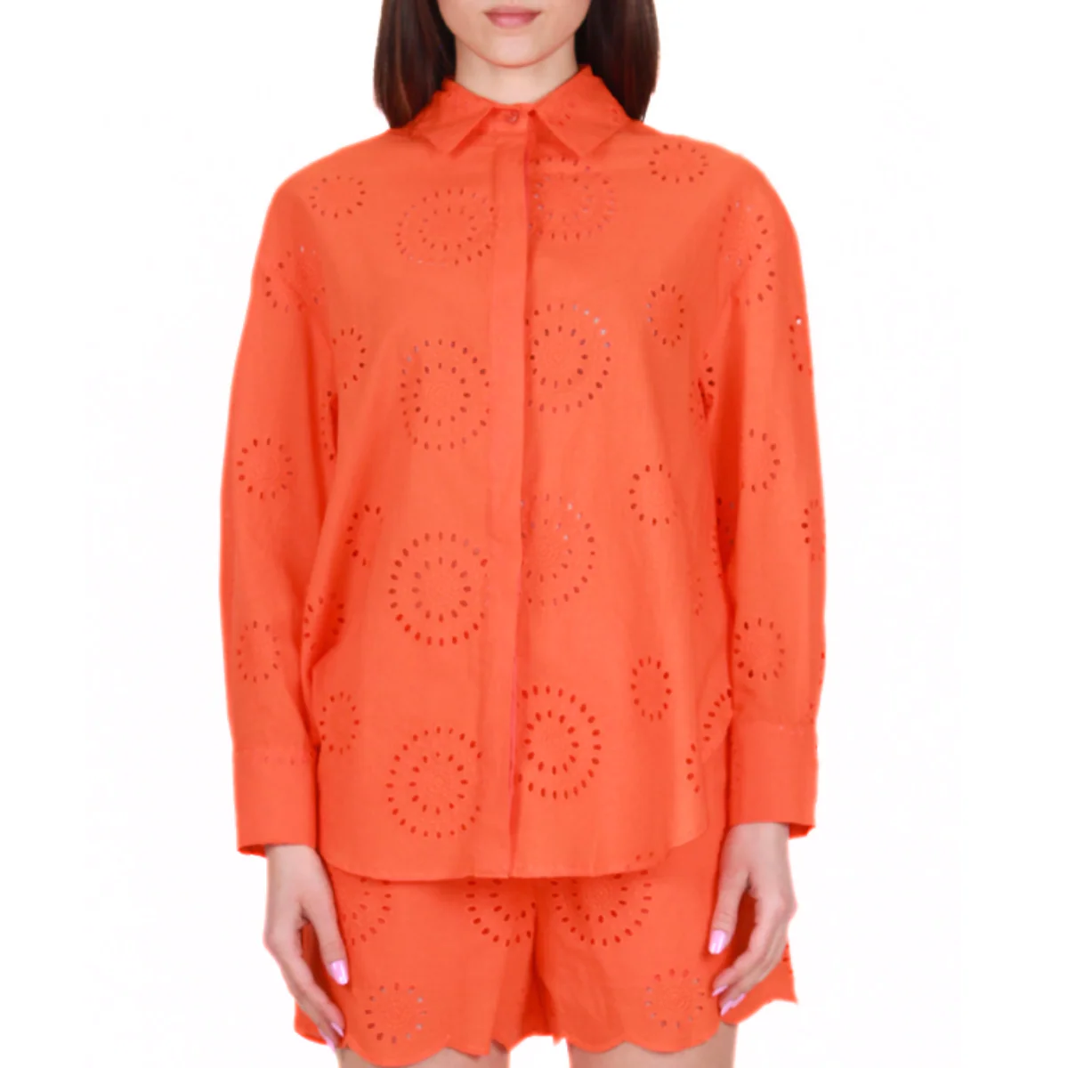 Camicia over arancione di BERNA. Realizzata in pizzo sangallo di puro cotone con ricamo floreale. Colletto Oxford e chiusura centrale con bottoni nascosti. Fondo arrotondato.