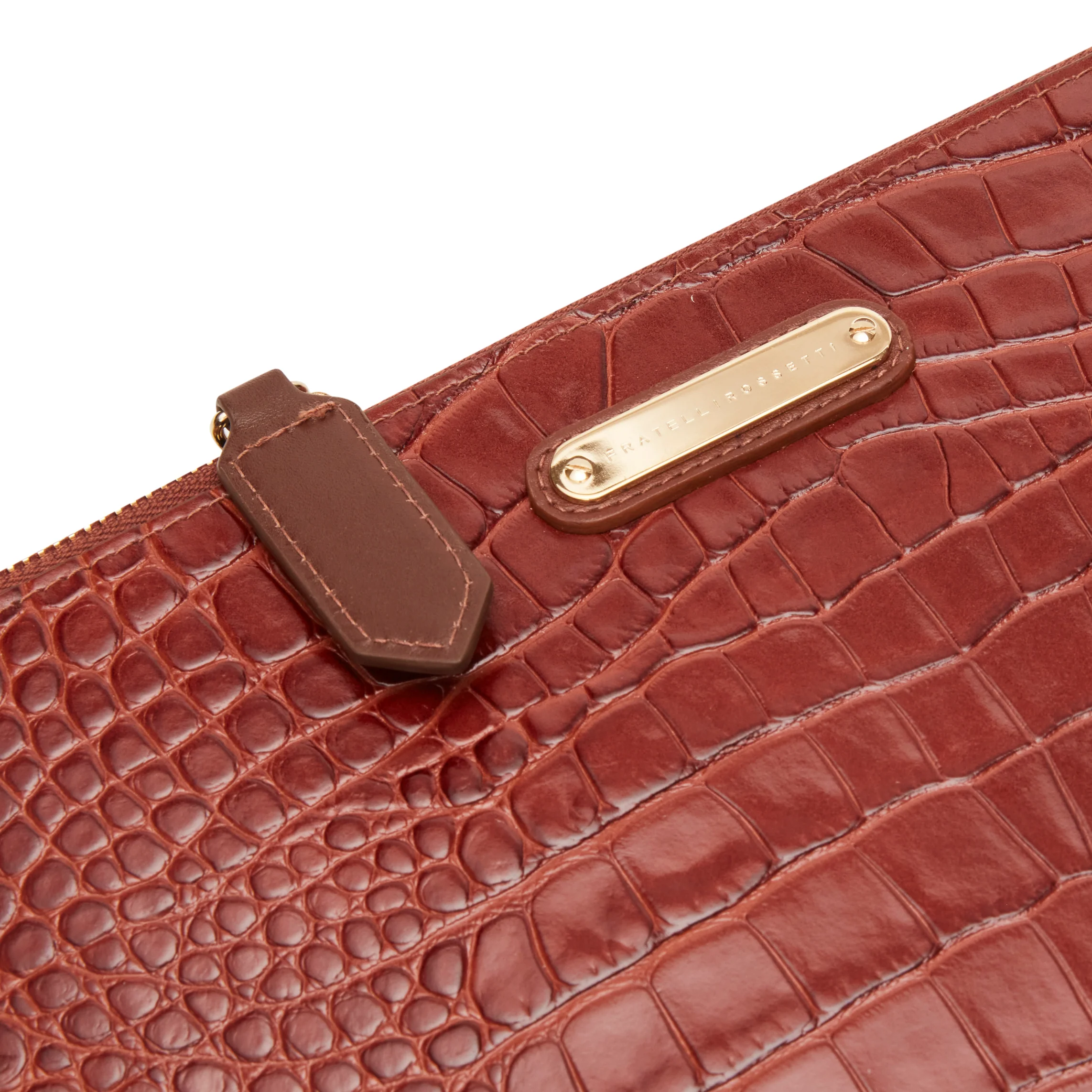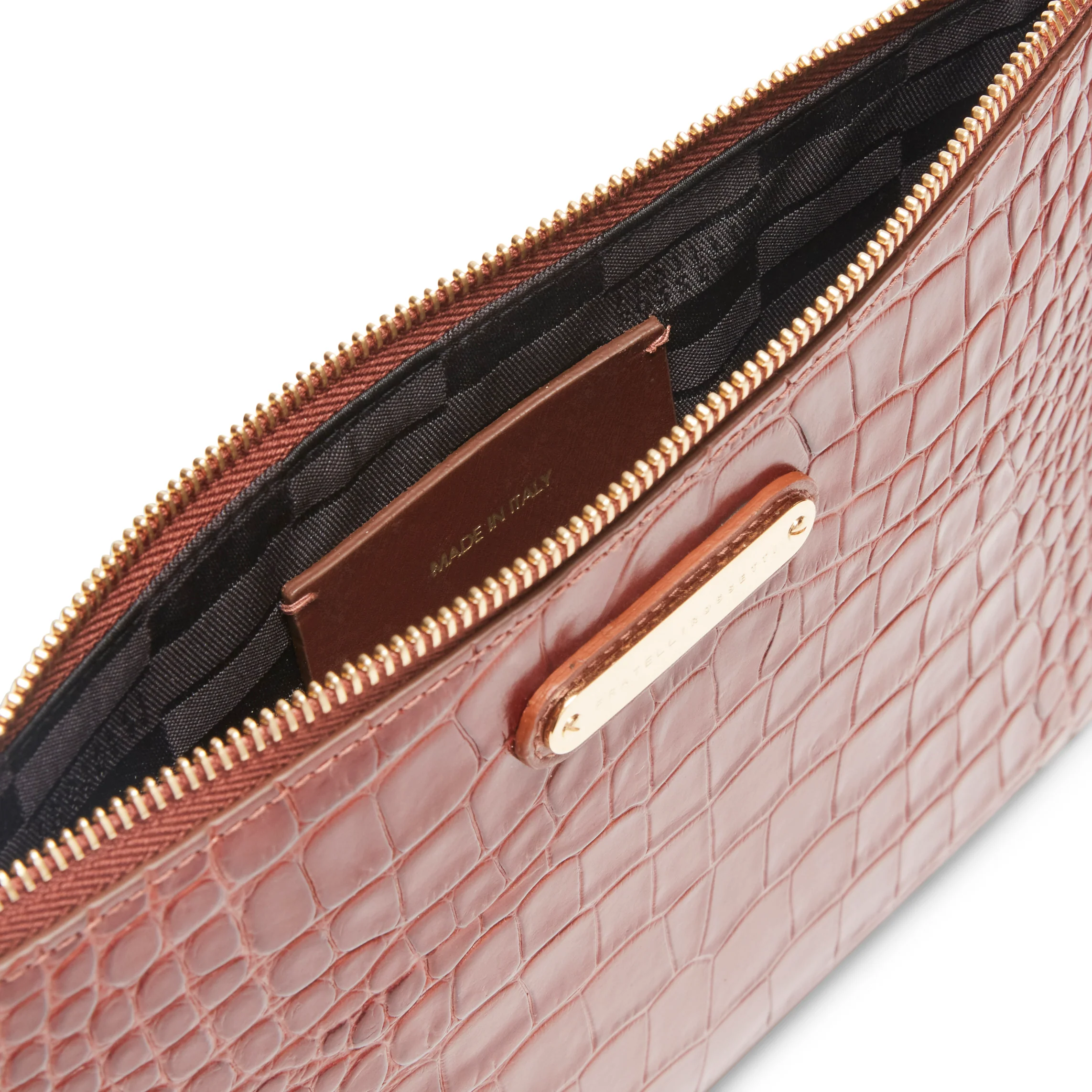 Bustina dal look minimal realizzata in morbida pelle stampata effetto coccodrillo. Chiusura con tir zip in pelle. Comoda e funzionale consente di riporre al suo interno piccoli effetti personali. Il manicotto removibile, permette di indossarla sia come clutch che come portafoglio. Fodera logata.