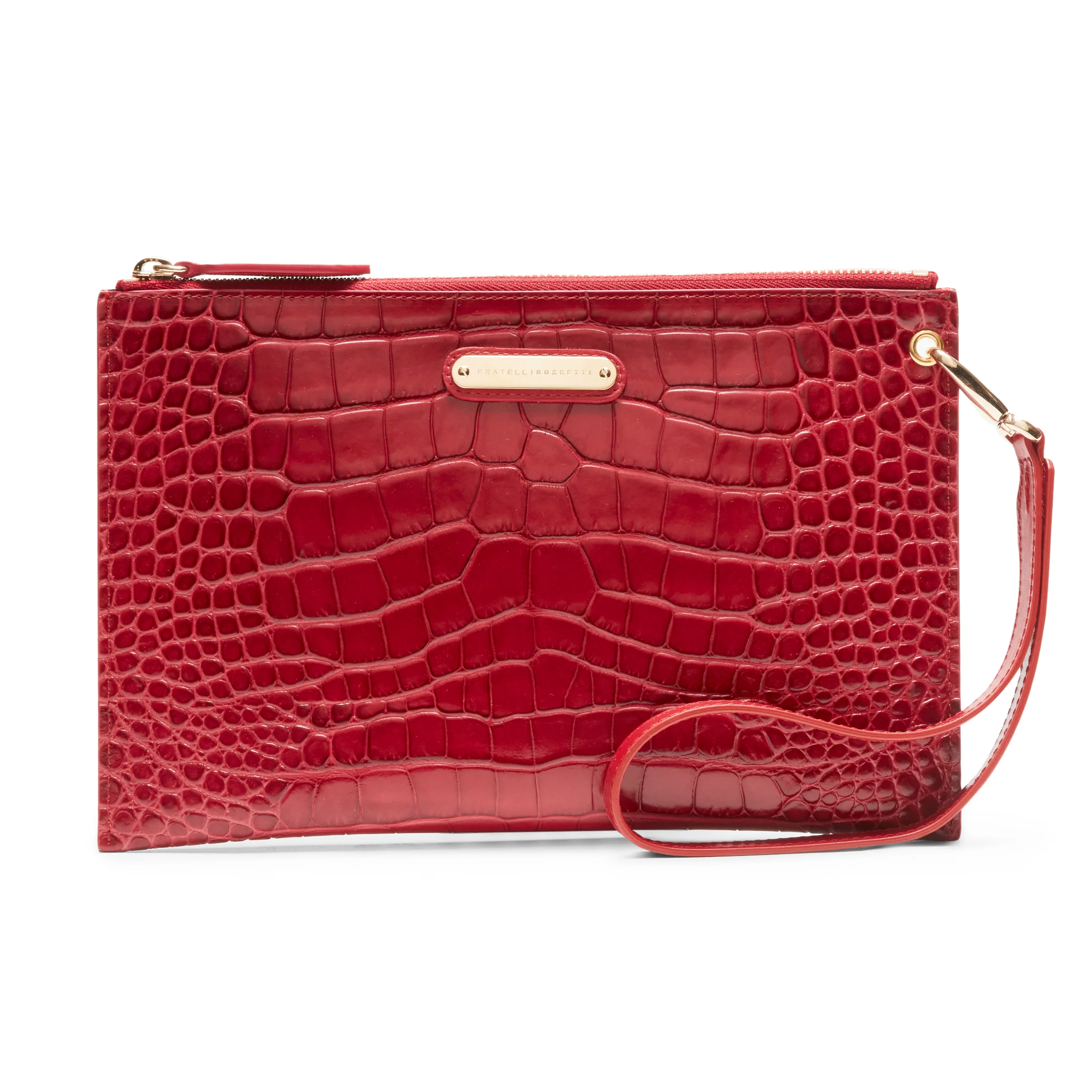 Bustina dal look minimal realizzata in morbida pelle stampata effetto coccodrillo lucido. Chiusura con tirazip in pelle. Comoda e funzionale consente di riporre al suo interno piccoli effetti personali. Il manicotto removibile, permette di indossarla sia come clutch che come portafoglio. Fodera logata.