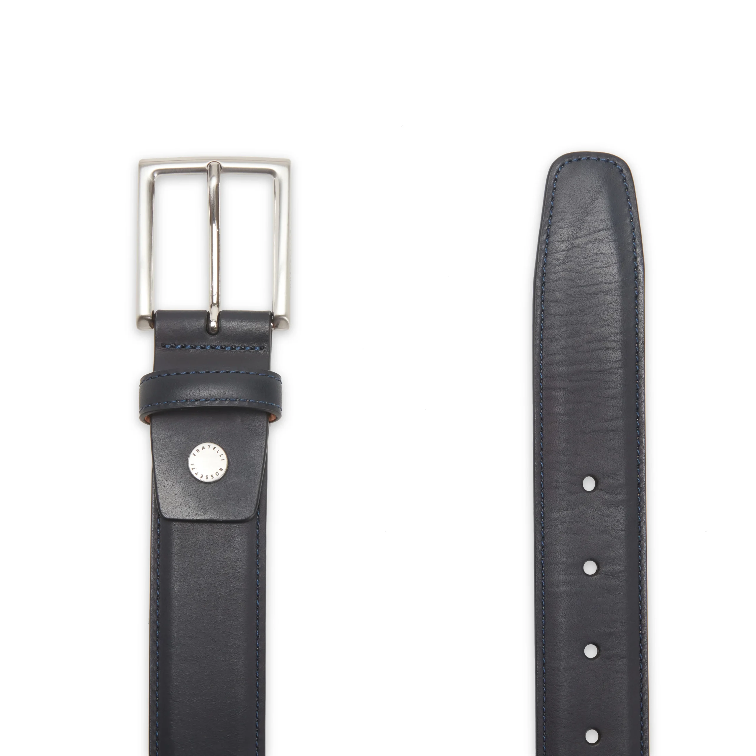 Cintura da uomo con asta liscia, realizzata in pelle tamponata a mano. Lo speciale trattamento dona al pellame un effetto sfumato artigianale. Fibbia in palladio con finitura satinata. Può essere comodamente accorciata su misura. Altezza 35 mm.