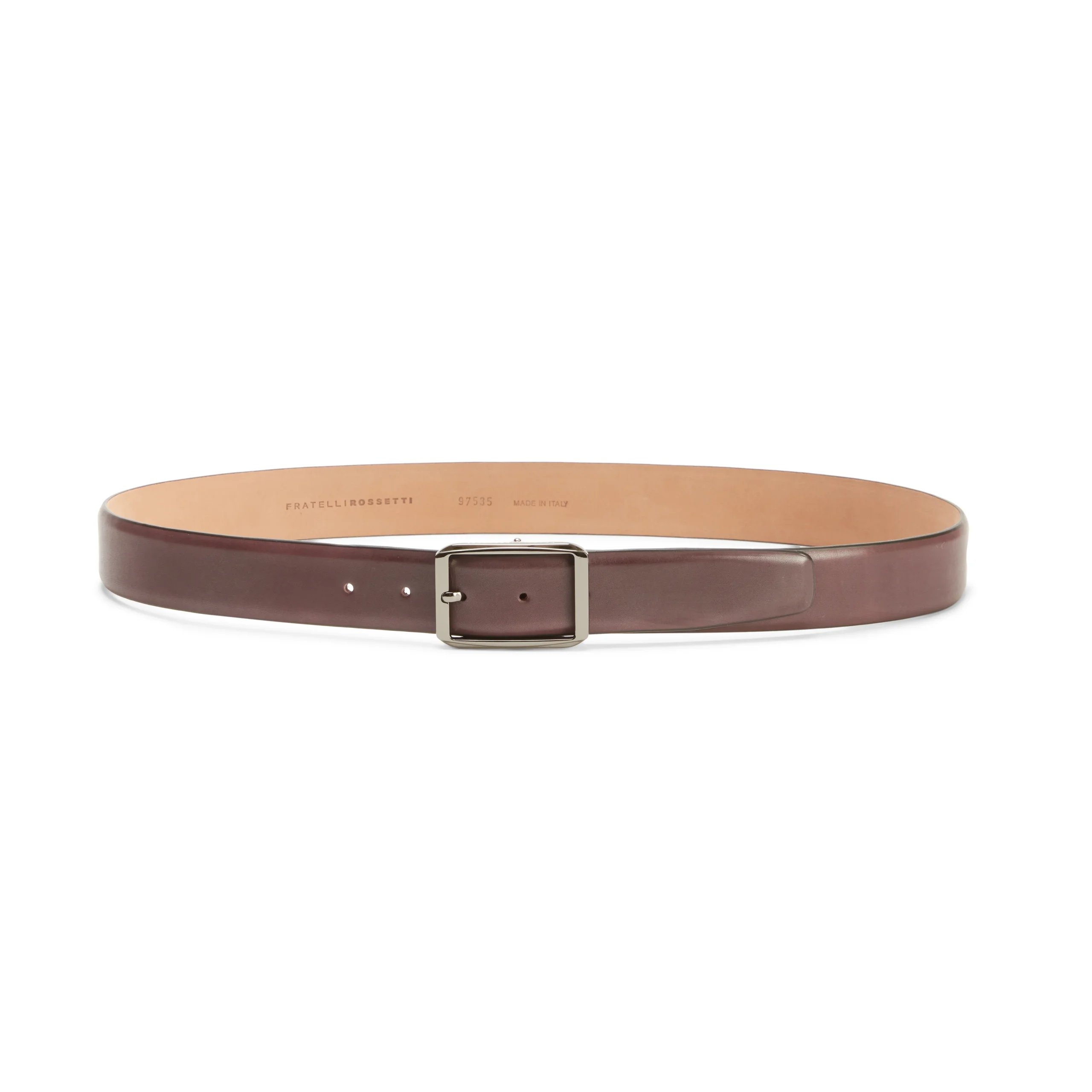 Cintura da uomo con asta senza cuciture, realizzata in morbida pelle che viene tinta in color bordeaux tramite tamponatura a mano. Il sapiente lavoro artigianale crea un particolare effetto con sfumature di colore più profonde.Fibbia in palladio con finitura satinata. Altezza 35 mm.Art. 97535
