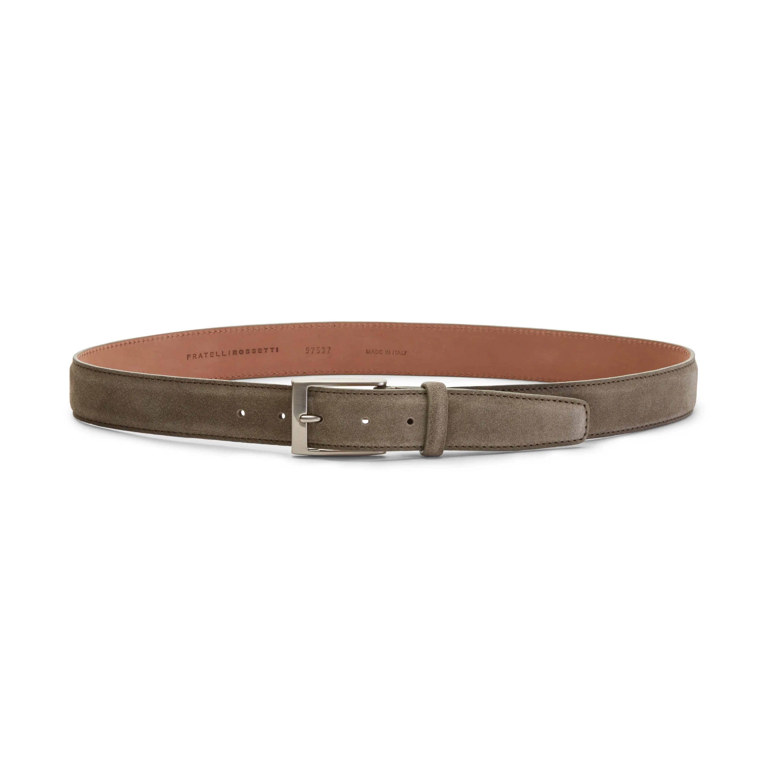 Cintura da uomo in pelle scamosciata color verde Africa con asta caratterizzata da una cucitura singola. La fibbia rettangolare con logo laserato completa il design essenziale. Comoda e versatile, può essere facilmente regolata per adattarsi alla propria misura. Art. 97537