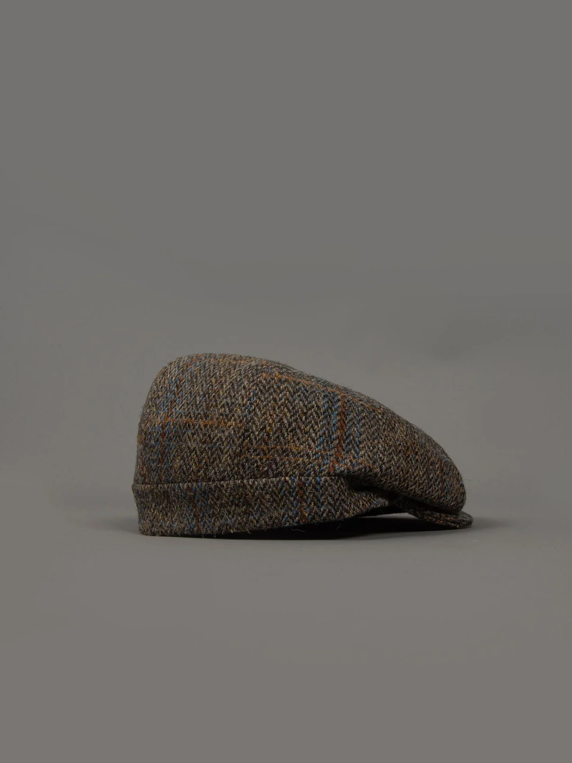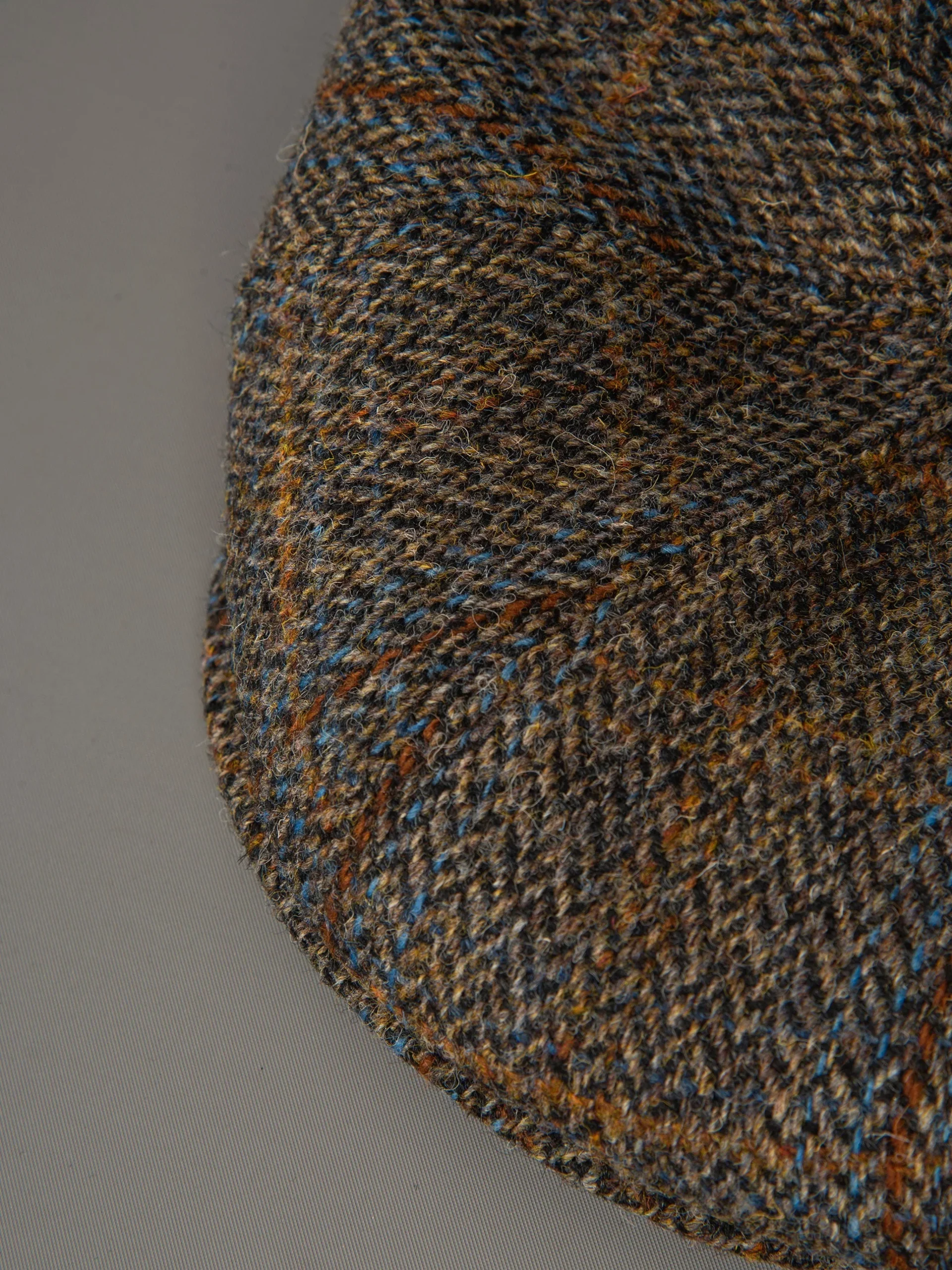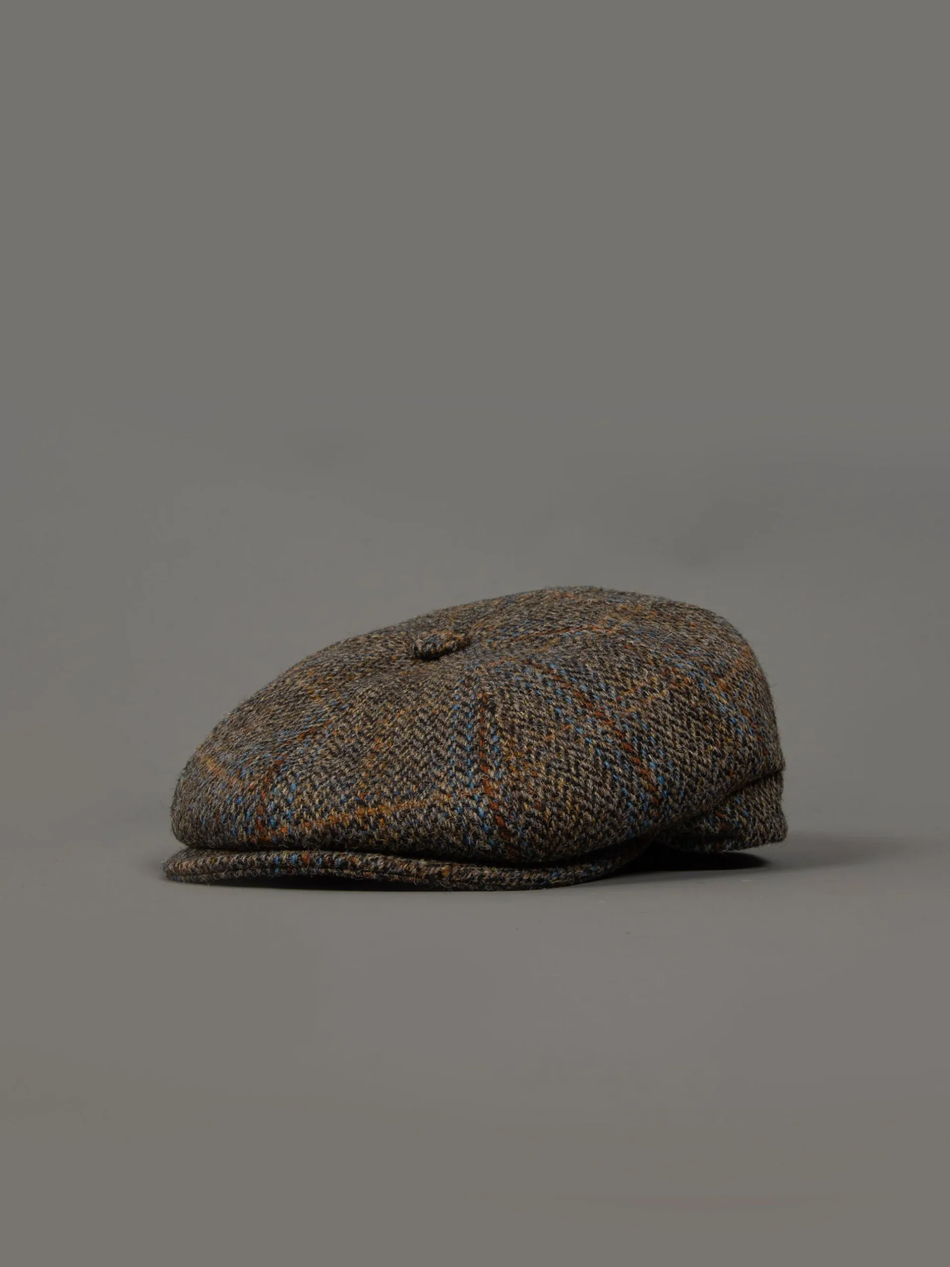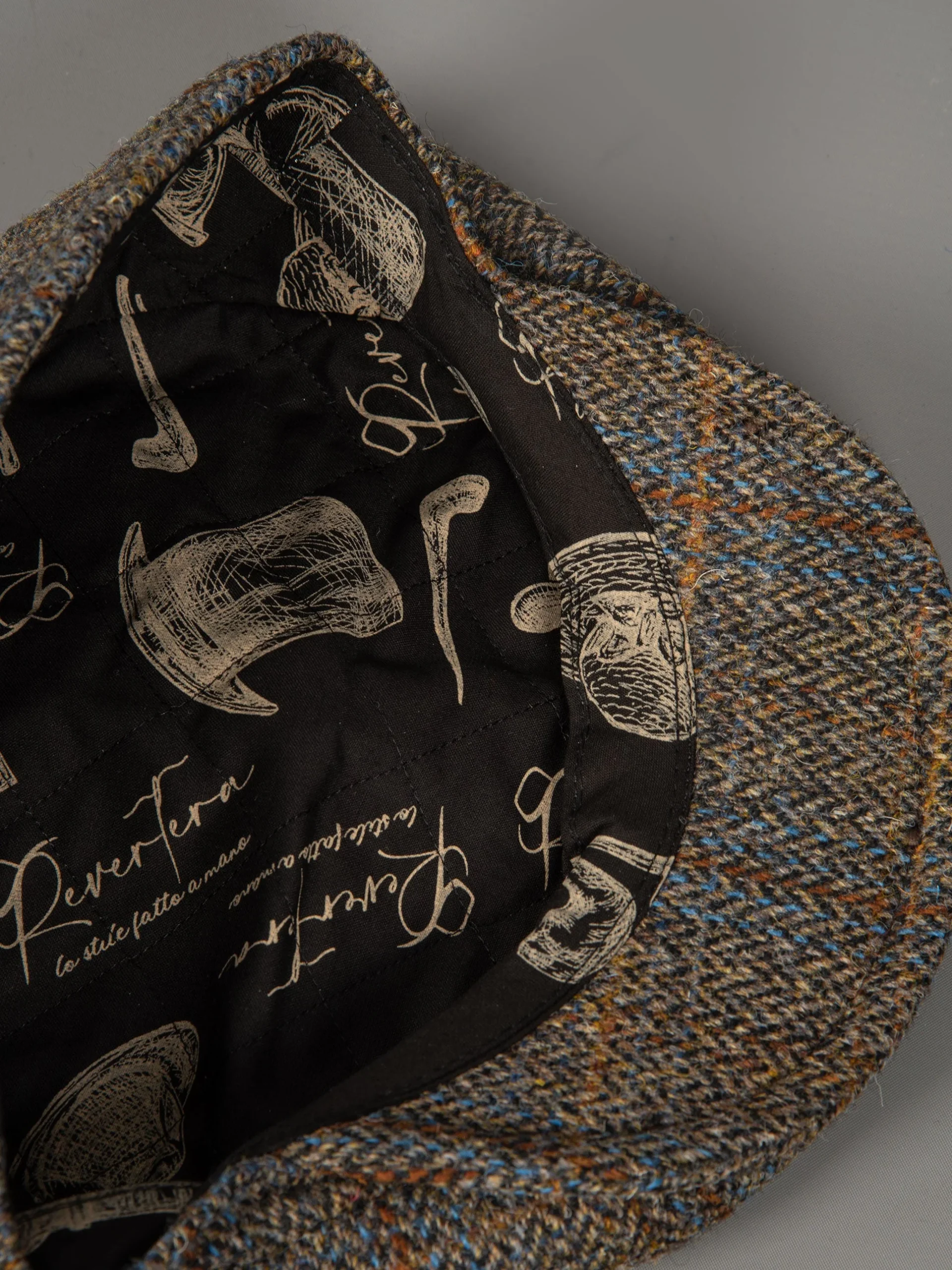 Mod: REVERTERA HT19 Coppola in lana con fantasia tweed e spina di pesce. Foderato con stampa interna e spilla logata. Composizione: 100% lana Harrys Tweed. Lo stile fatto a mano. 100% Made in Italy.