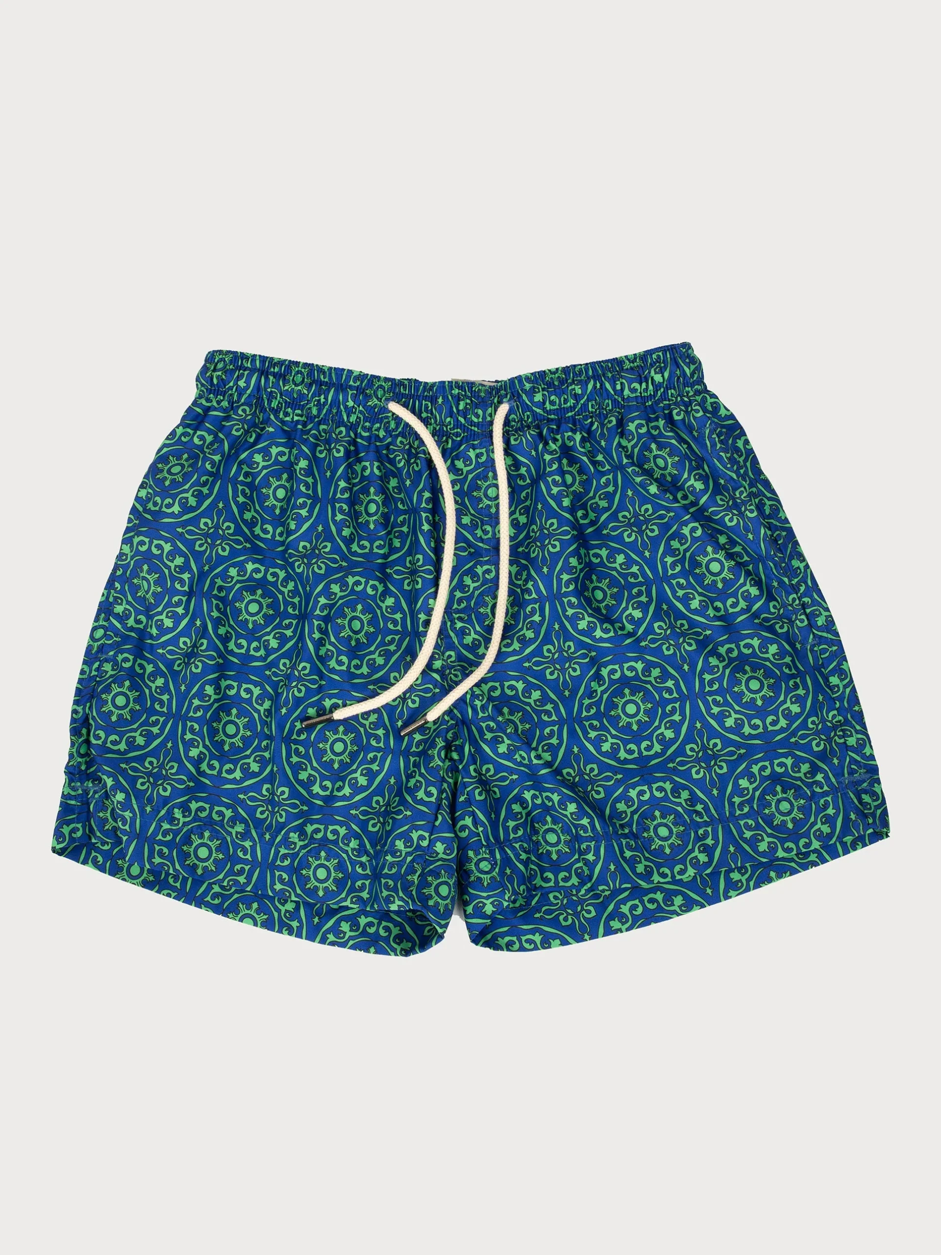 Mod: rPet Drawstring Swim Shorts LEVANZO V5 Costume con pattern dallo stile Mediterraneo. Gamba dritta e lunghezza media. Elastico in vita con coulisse interna. Fodera in rete soft touch. Due tasche laterali e cordino con puntale brandizzato. Tasca posteriore con etichetta logata. Realizzato in poliestere 100% riciclato. 100% made in Italy.