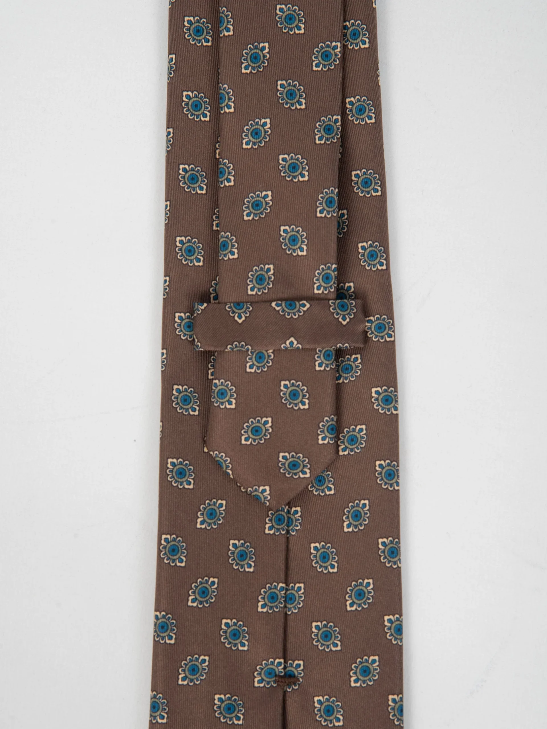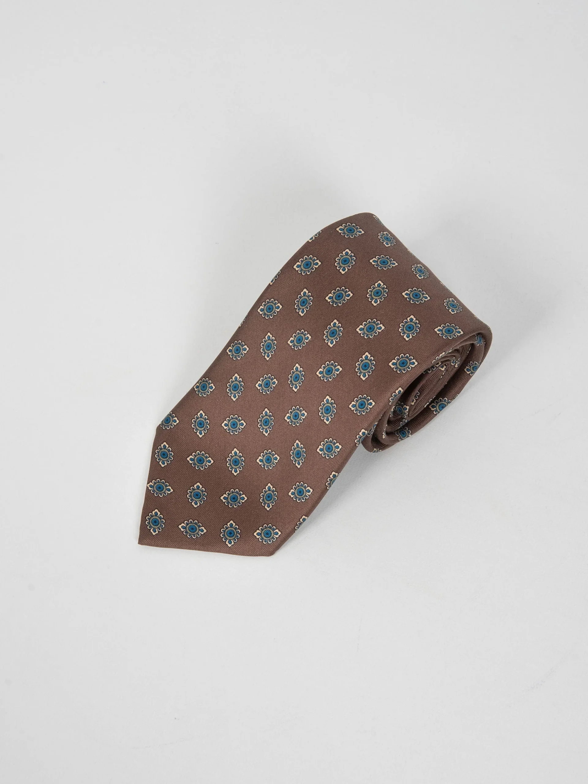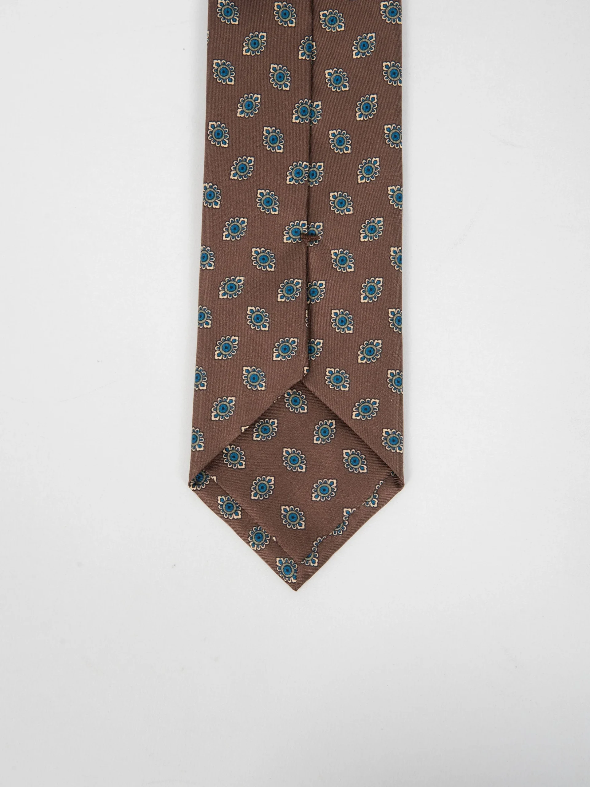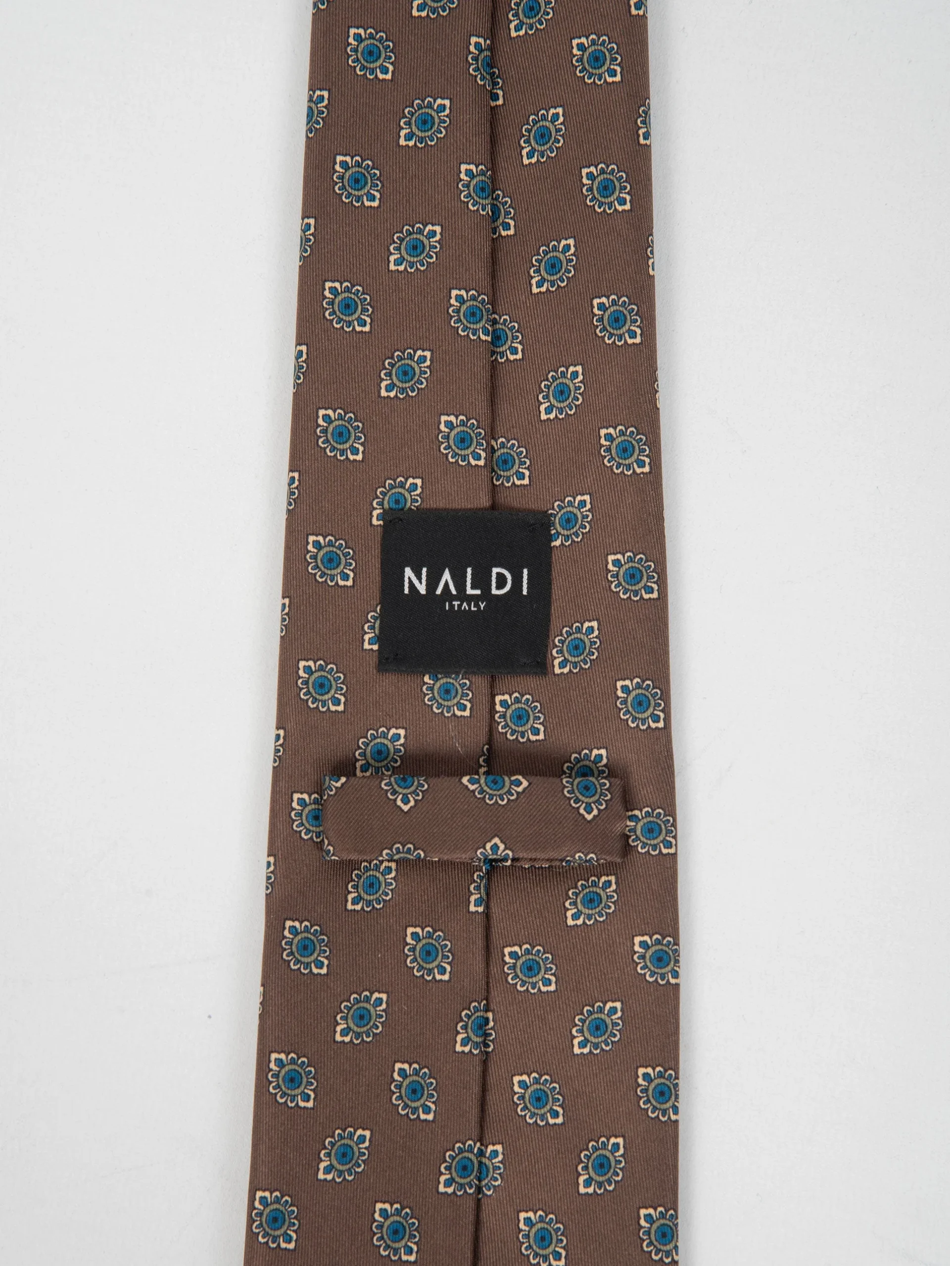 Mod: Naldi foderata 8 cm marrone motivo azzurro Cravatta 8 cm artigianale foderata. Tessuto 100% seta. Base marreone motivo azzurro. Caratteristiche artigianato Napoletano.